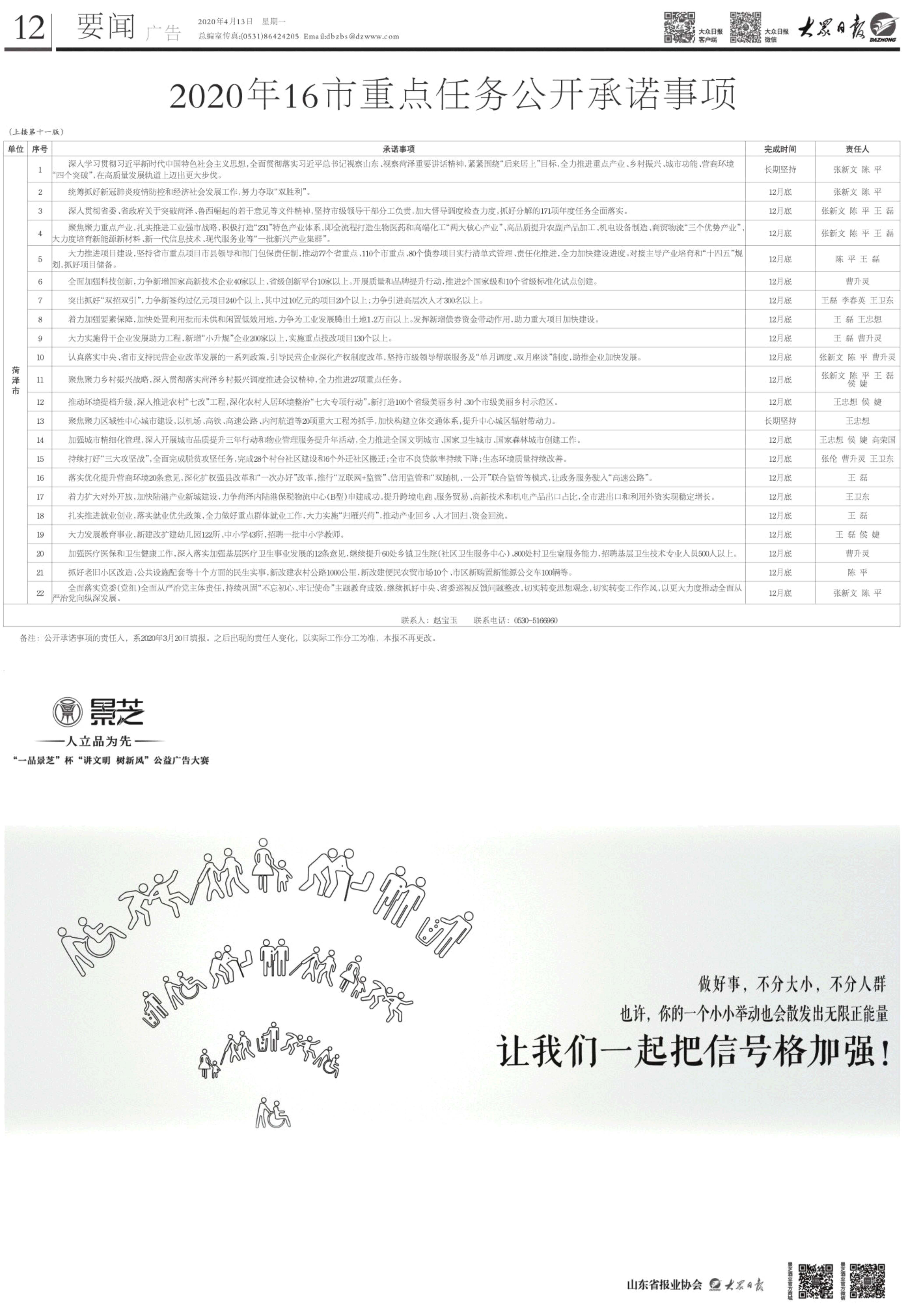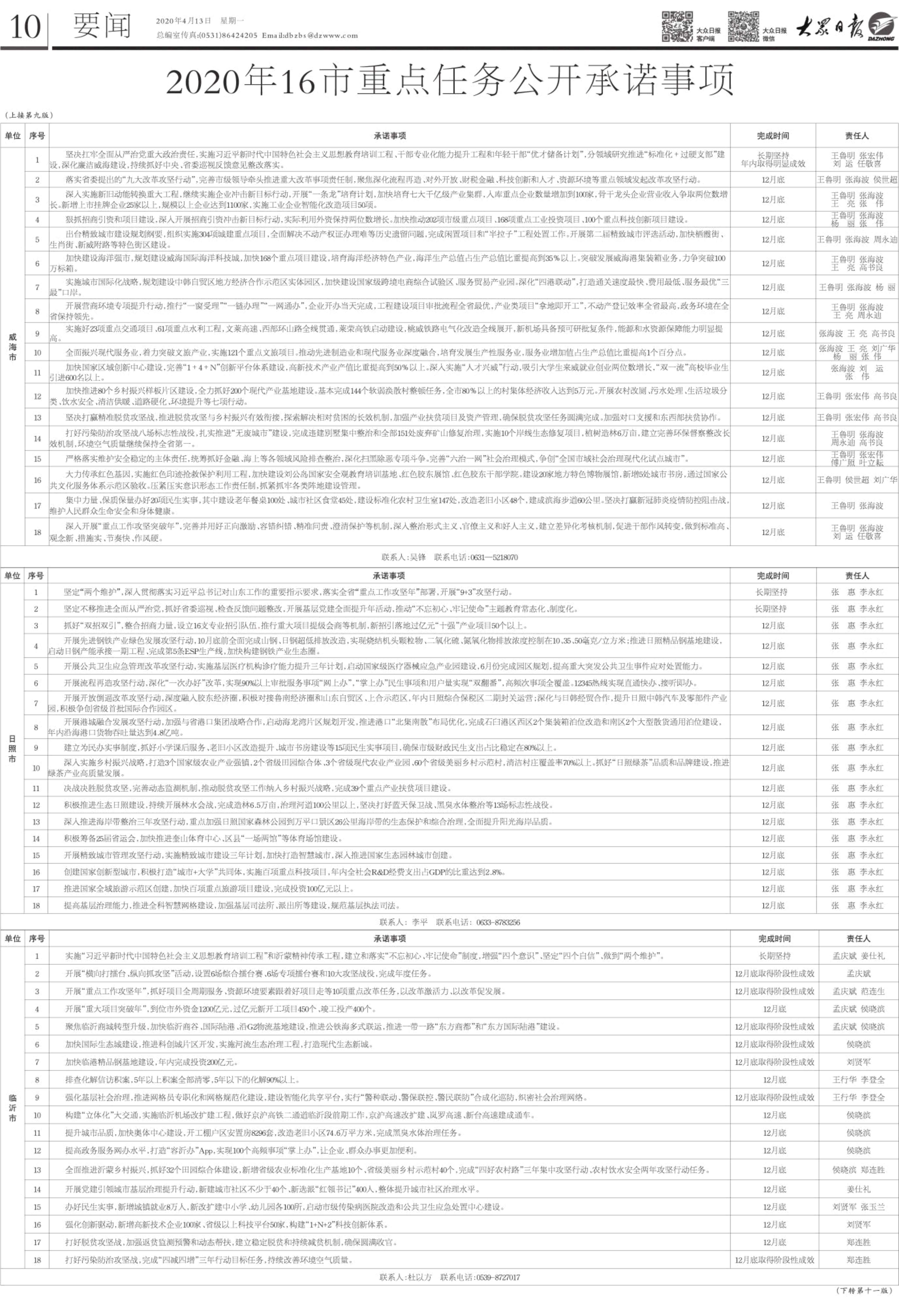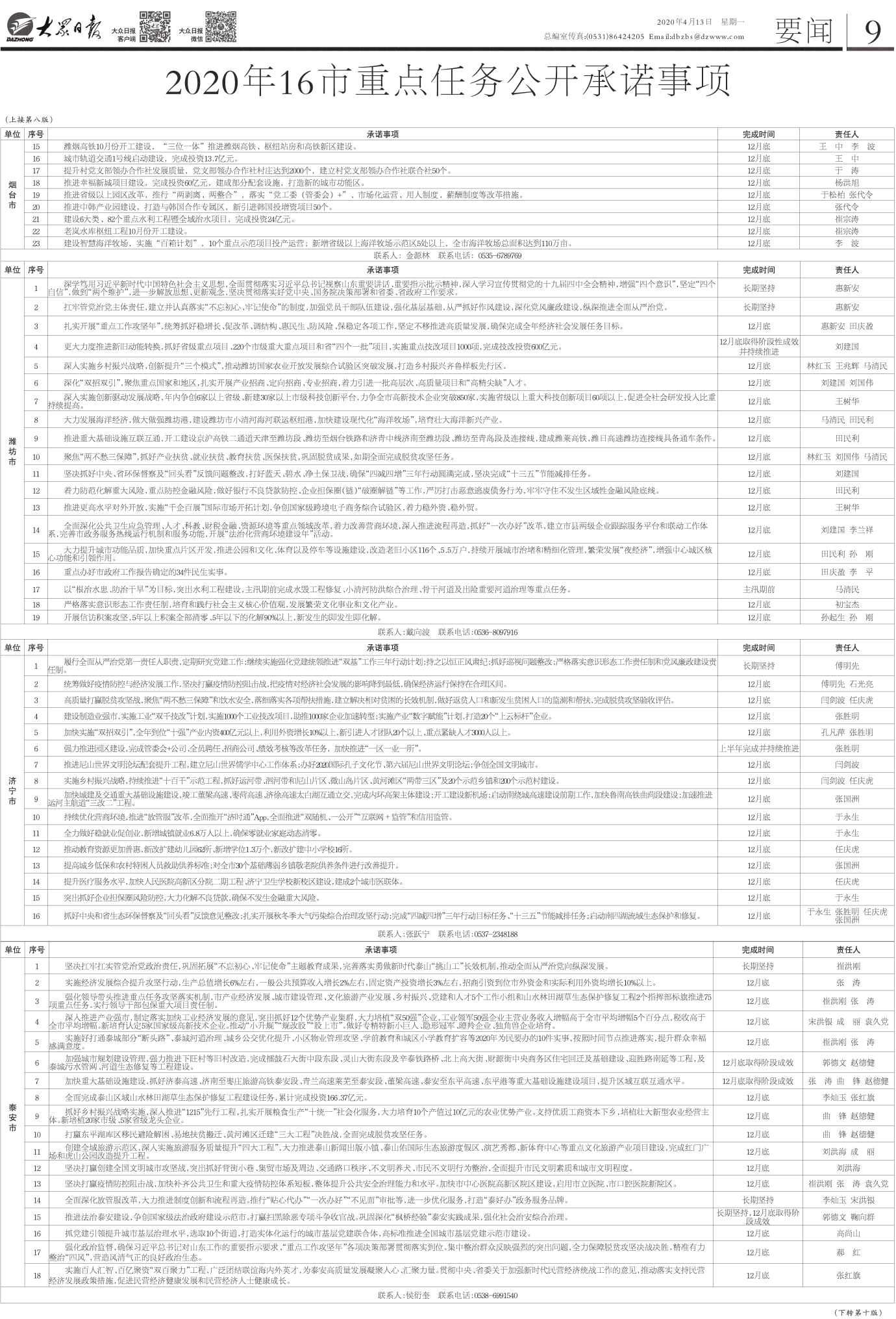 2020年是“重点工作攻坚年”。为把省委、省政府部署向深处、向细处、向实处扎实推进,以公开促落实、促规范、促服务,今天见报的《大众日报》用6个版的篇幅将16市2020年重点任务、完成时限、责任人予以公布,并欢迎社会各界监督。记者留意到,不少任务当地市委书记、市长便是主要责任人,来看看有您关注的事项吗>>>
