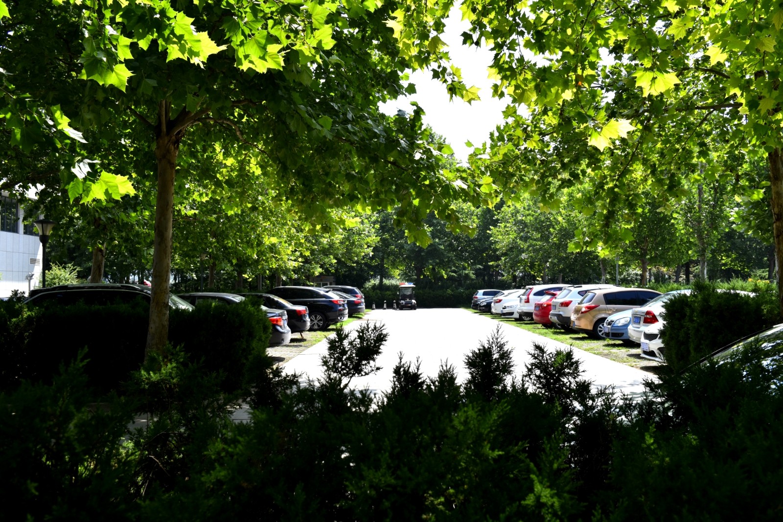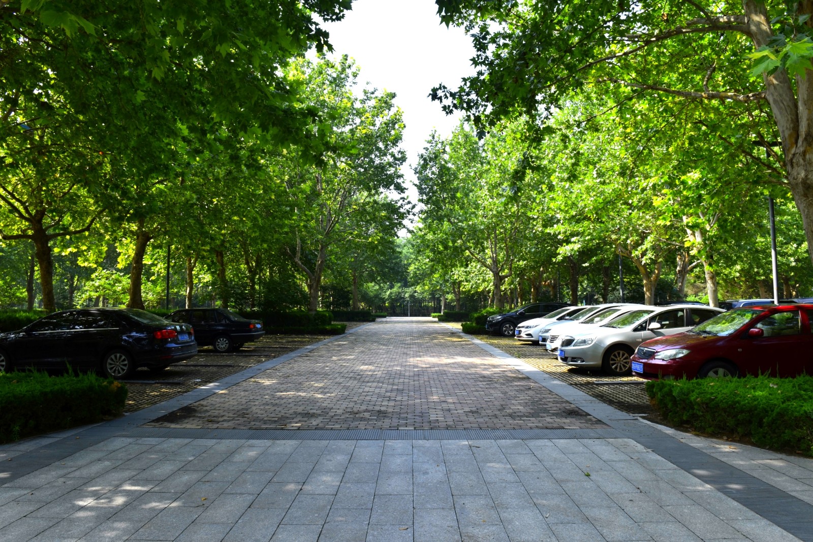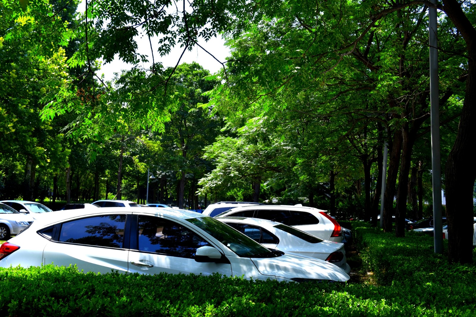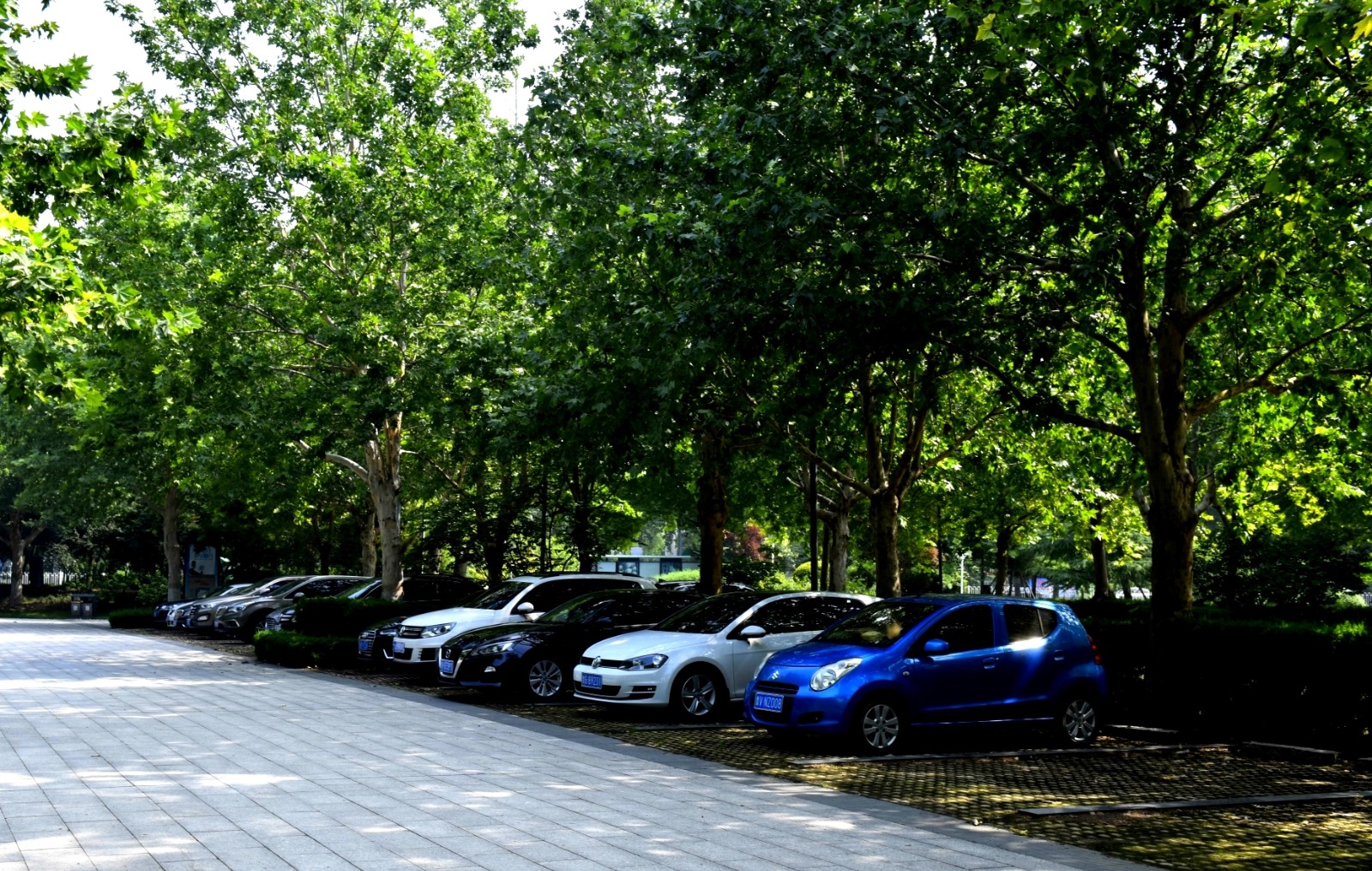 在寿光城区,像东城公园这样的林荫停车场,还有商务小区、生态观光园、滨河城市湿地公园等很多处。地面皆采用嵌草透水砖铺设,栽植小龙柏、蜀桧、黄杨等绿篱,乔木选用高大粗壮、枝繁叶茂的法桐、栾树等遮荫效果好的树种,使整个停车场处在浓荫中,隔绝了夏日的暑热,为游玩市民及车辆提供了一片舒适宜人的清凉空间。