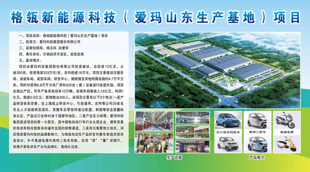 四是实现产业放大效应。项目借助爱玛科技的品牌影响力,与格瓴电动车产品研发和整车制造优势深度结合,补齐高速电摩和高档三轮车短板,实现“质”“量” 双提升,助推沂南电动车产业向品牌化、高端化迈进。项目达产后,年可生产各类高端框塑电动车8万台、高速电摩2万台,实现产值15亿元,税收4000余万元。