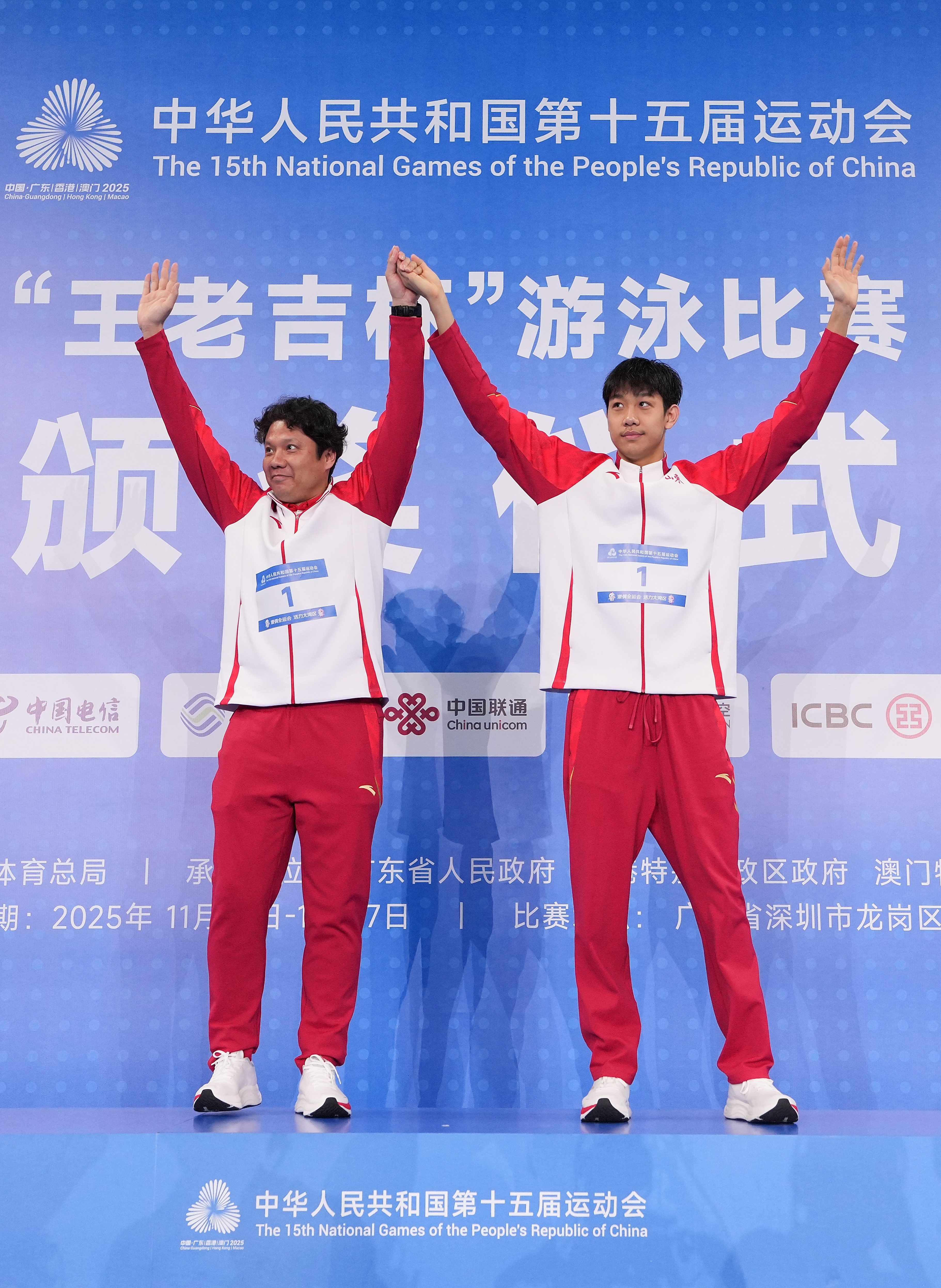 11月13日,张展硕(右)和教练金浩(左)一起领奖