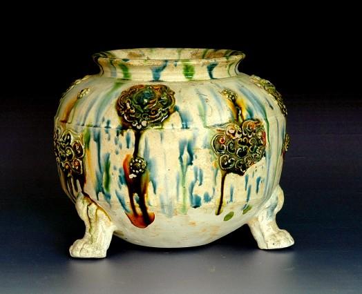 而绚烂多姿的三彩器,则通过浓郁的唐风,吸引着人们的目光。来自高唐县博物馆的三彩贴塑宝相花纹三足陶炉,是唐三彩珍品,釉面光洁绚丽,贴花工艺精湛,浮雕花卉与宝相花纹饰立体生动,放眼全国都是精品。莘县文物管理所的藏品三彩牵驼陶俑,生动传递了唐代胡商的异域风情。唐代聊城并不烧造陶瓷器,主要依赖贸易,从洛阳、长安等地购得。这些精美器物的存在,侧面印证了当时商贸的繁荣。