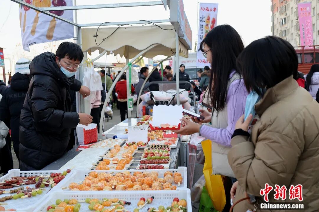 12月8日,年轻人在临沂曹洼大集上购买糖葫芦。李明芮 摄