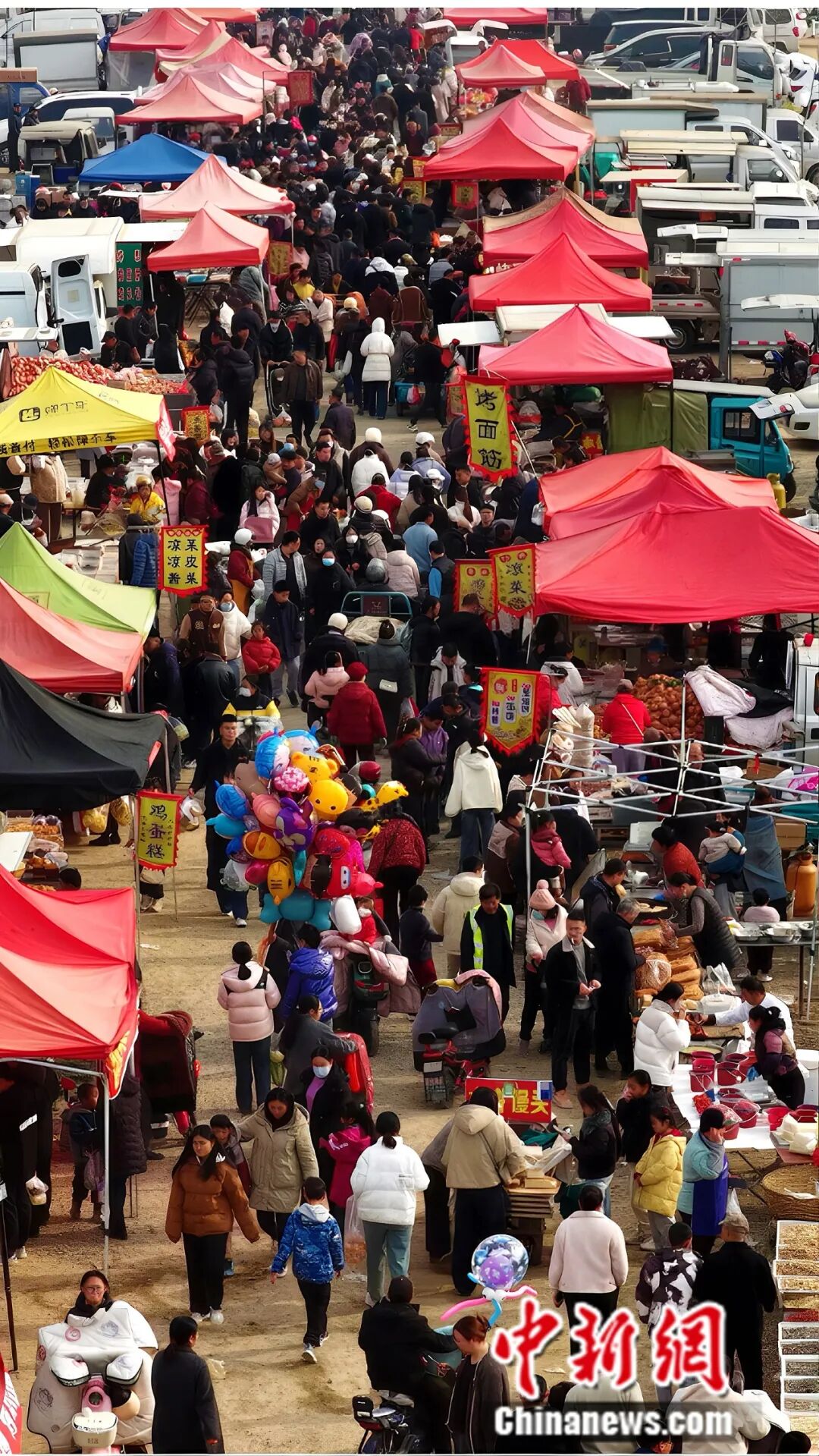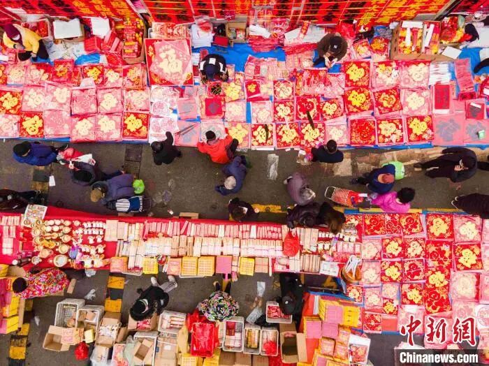 青岛李村大集红火热闹,市民选购“福”字、对联。(资料图,无人机照片) 张鹰 摄