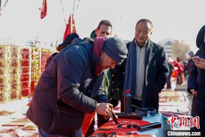 2025年1月,外国友人在青岛泊里大集上写毛笔字。万旭晨 摄