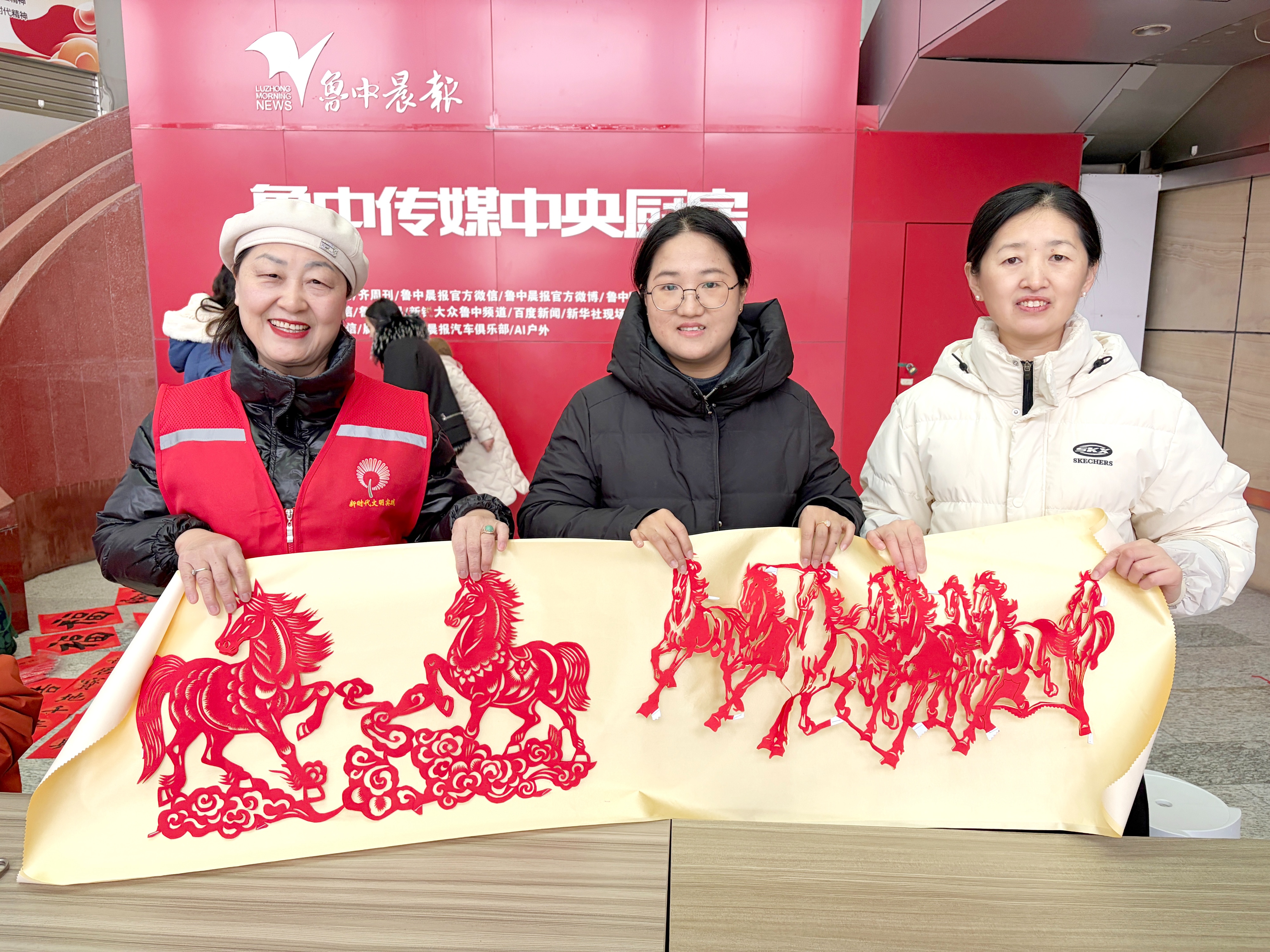 另一边的剪纸区也不甘示弱。非遗传承人端坐其间,指尖的红纸在剪刀下翻飞如蝶,折、剪、刻、挖一套动作行云流水,眨眼功夫,寓意吉祥的马年生肖、活灵活现的花鸟、喜庆十足的团花福字就新鲜“出炉”。细碎的红纸纸屑像雪花般飘落,精美的窗花引得大家连连赞叹。