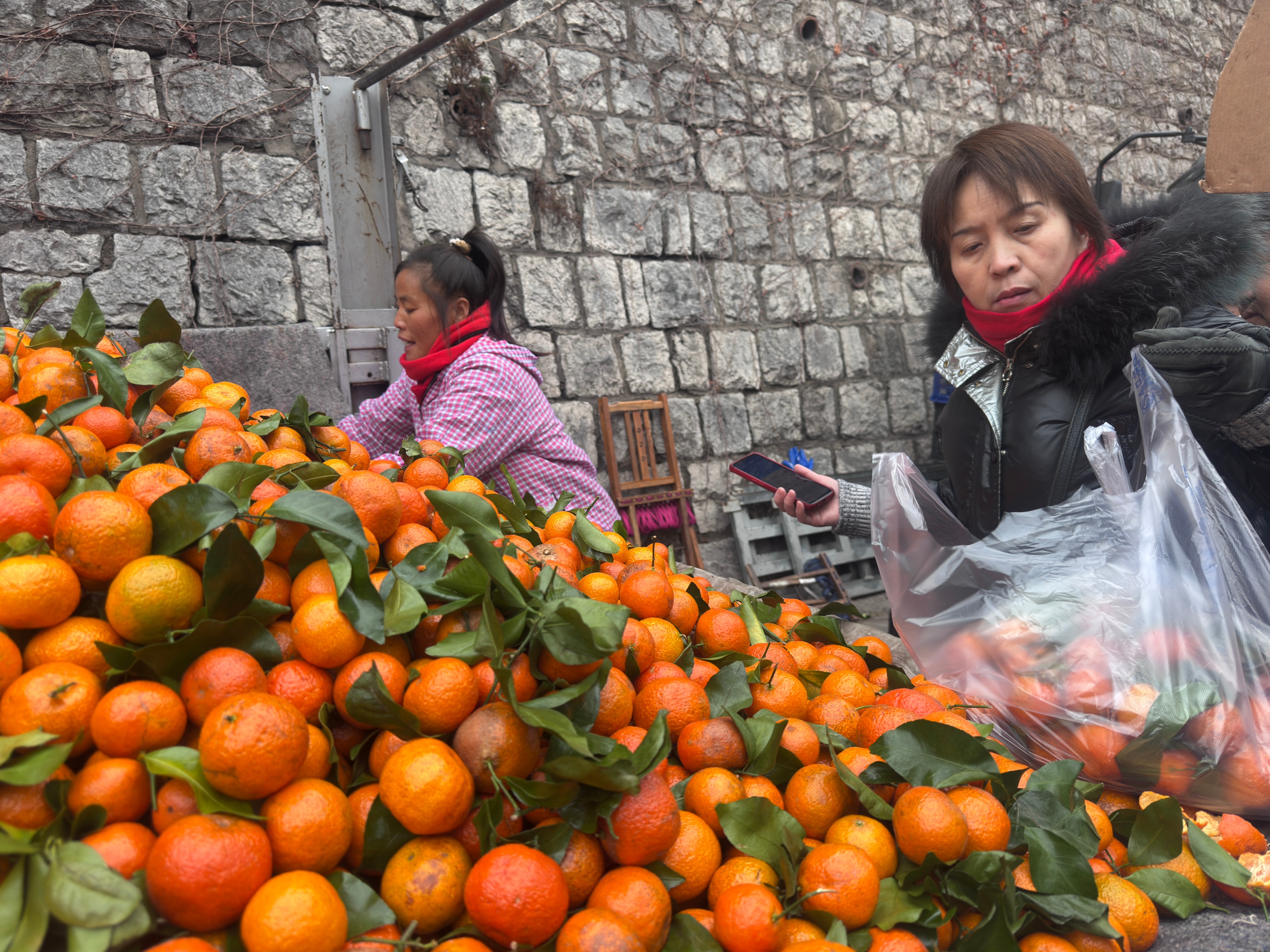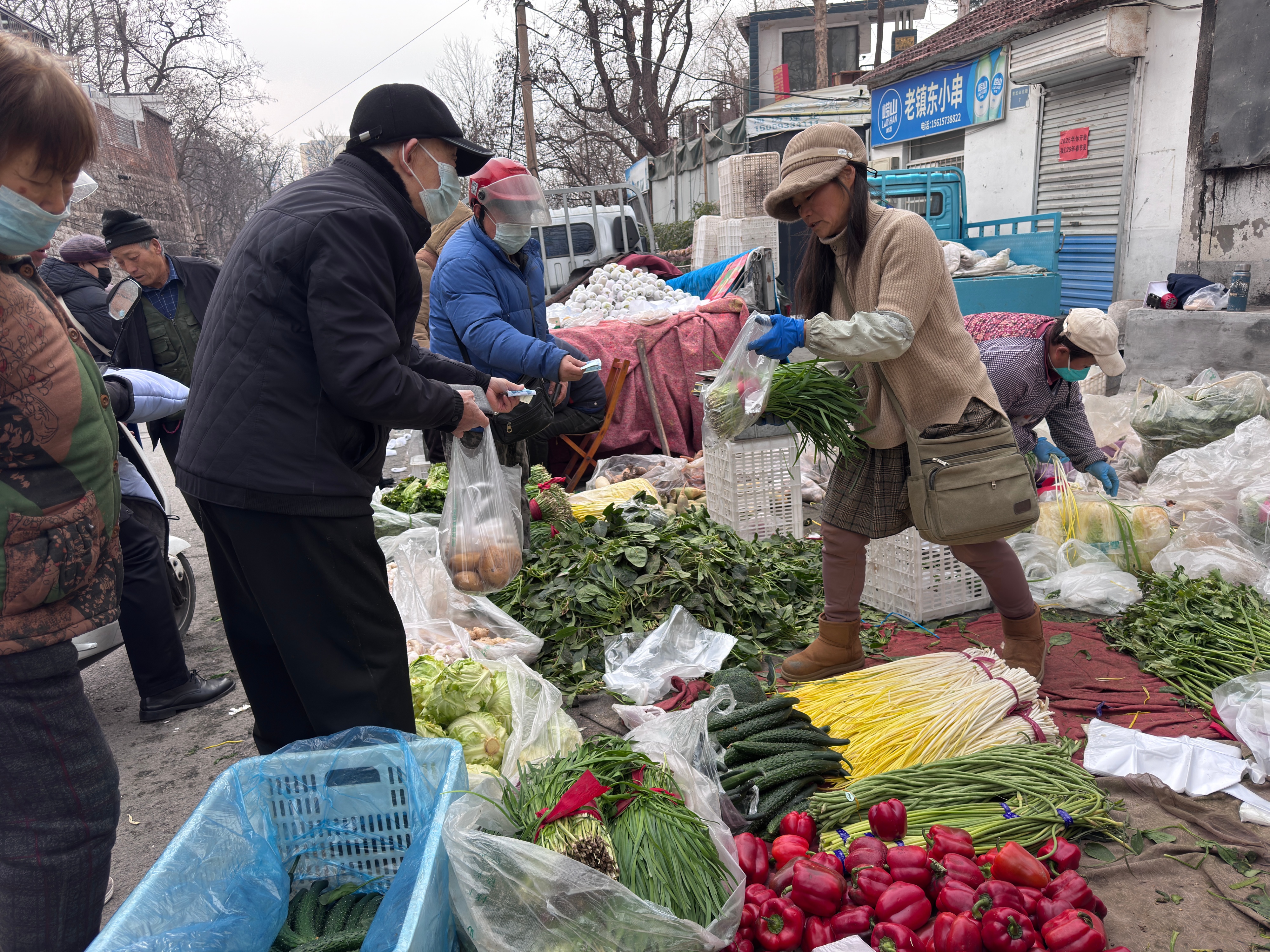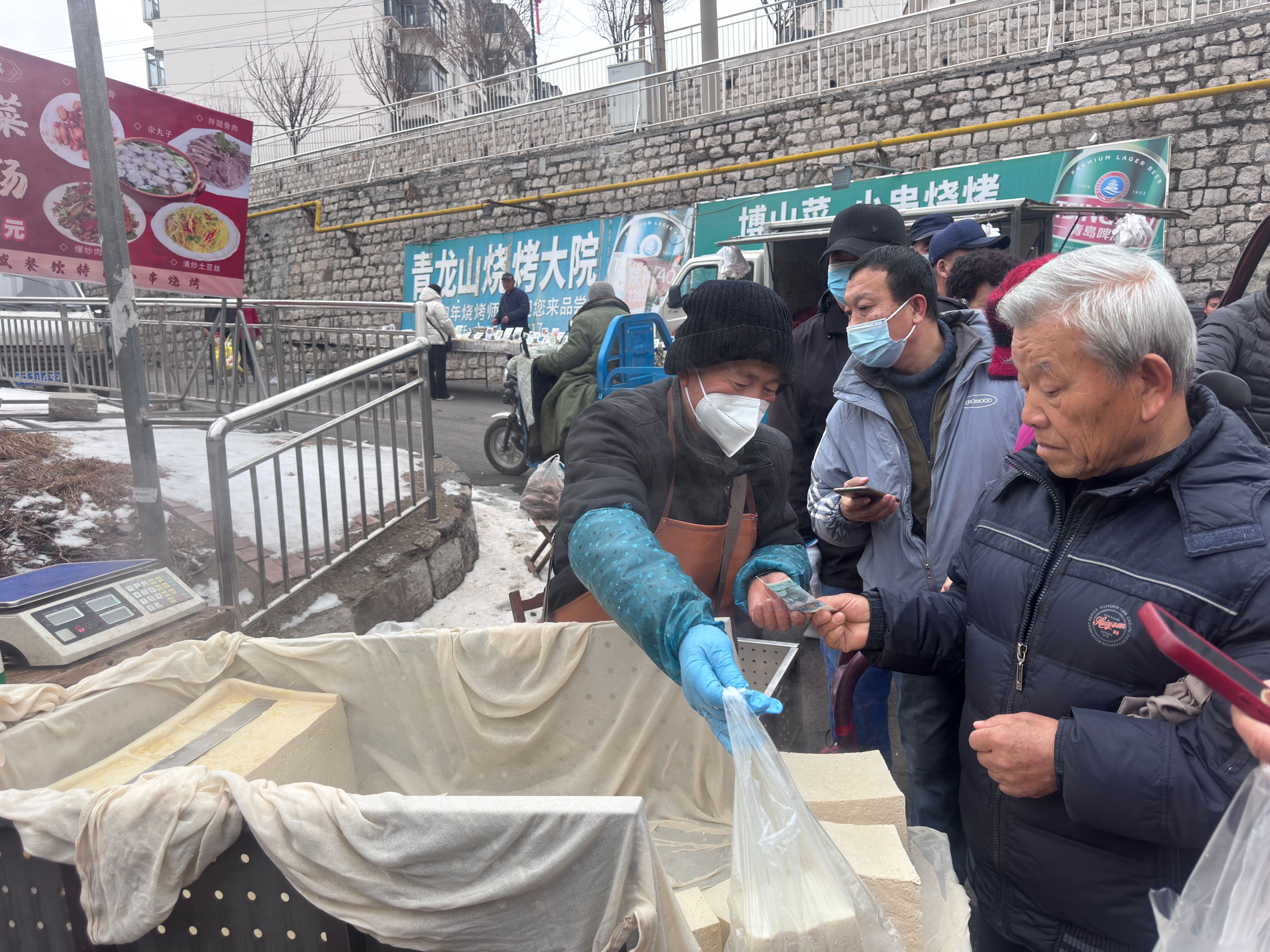 从黑山沟往上走,最靠前的一段,多是蔬菜、水果和干货。大白菜码成小山,山药和芹菜一捆一捆立得精神,红皮花生、黄豆、绿豆装在敞口麻袋里,广西砂糖橘堆满货车,上面有手写的价格。腊八临近年关,来买东西的人明显多了,买豆腐的人群排成长队,摊主是南博山人,他的豆腐往往十点之前就卖没了。
