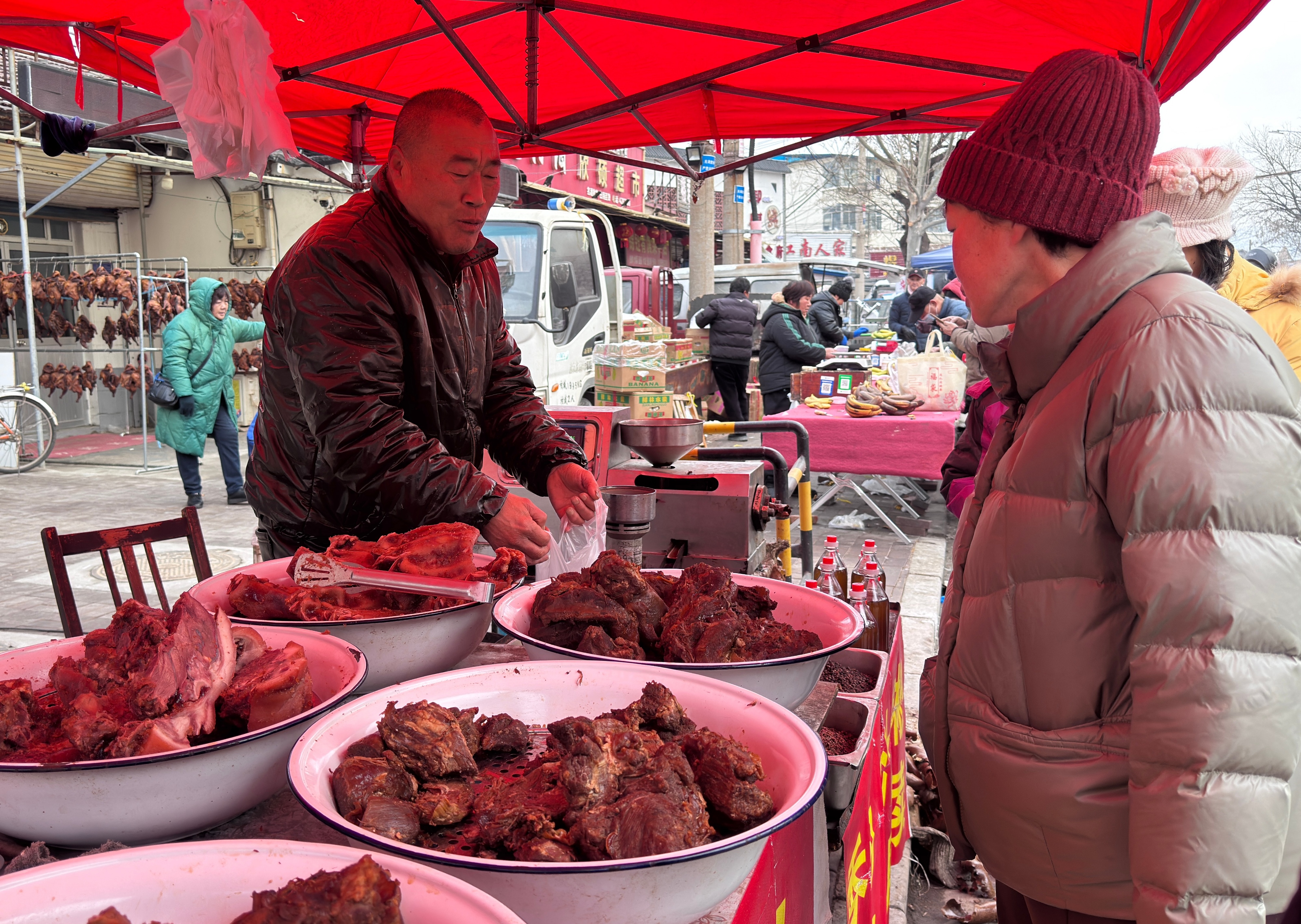 博山人对吃向来认真,这一点在大集上体现得最直接。猪头肉用刀快速切好,颜色鲜亮,肥瘦分明;豆腐装在木头搁板上,用长长的刀来切,还带着微微的颤;酱牛肉摊前挤满了人,老板手上利索,酱牛肉、酱牛肚、牛肉干,要多少,称多少,分毫不差。