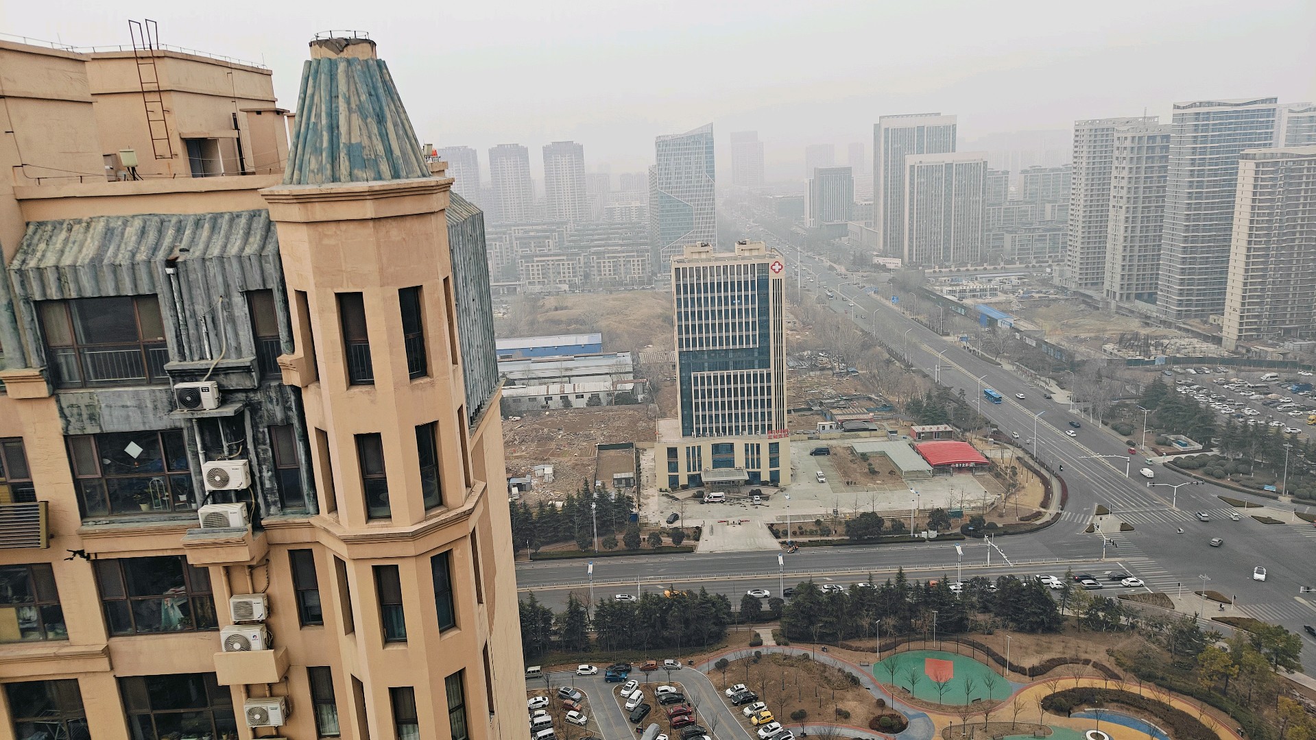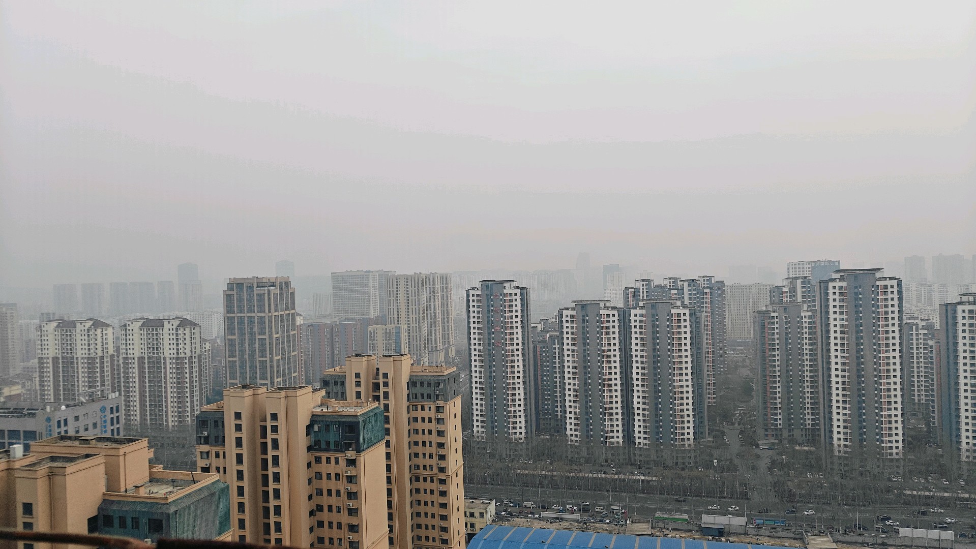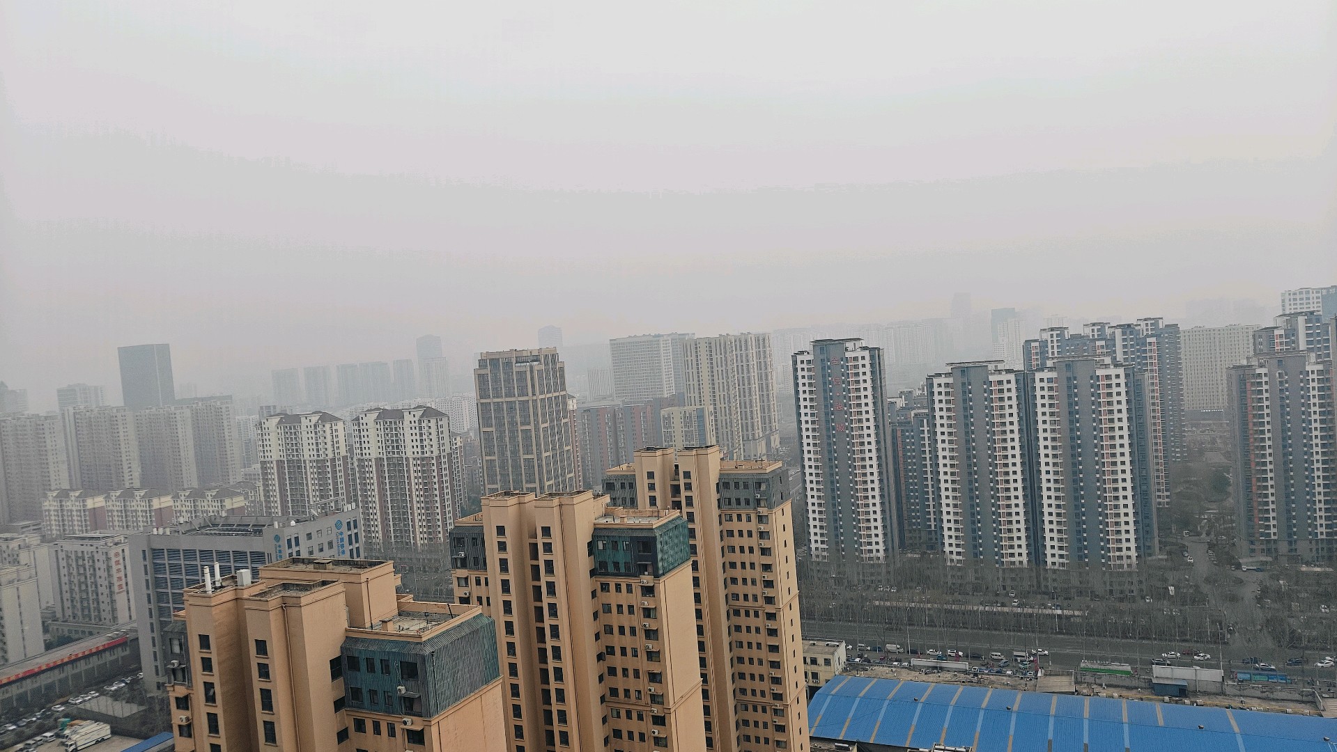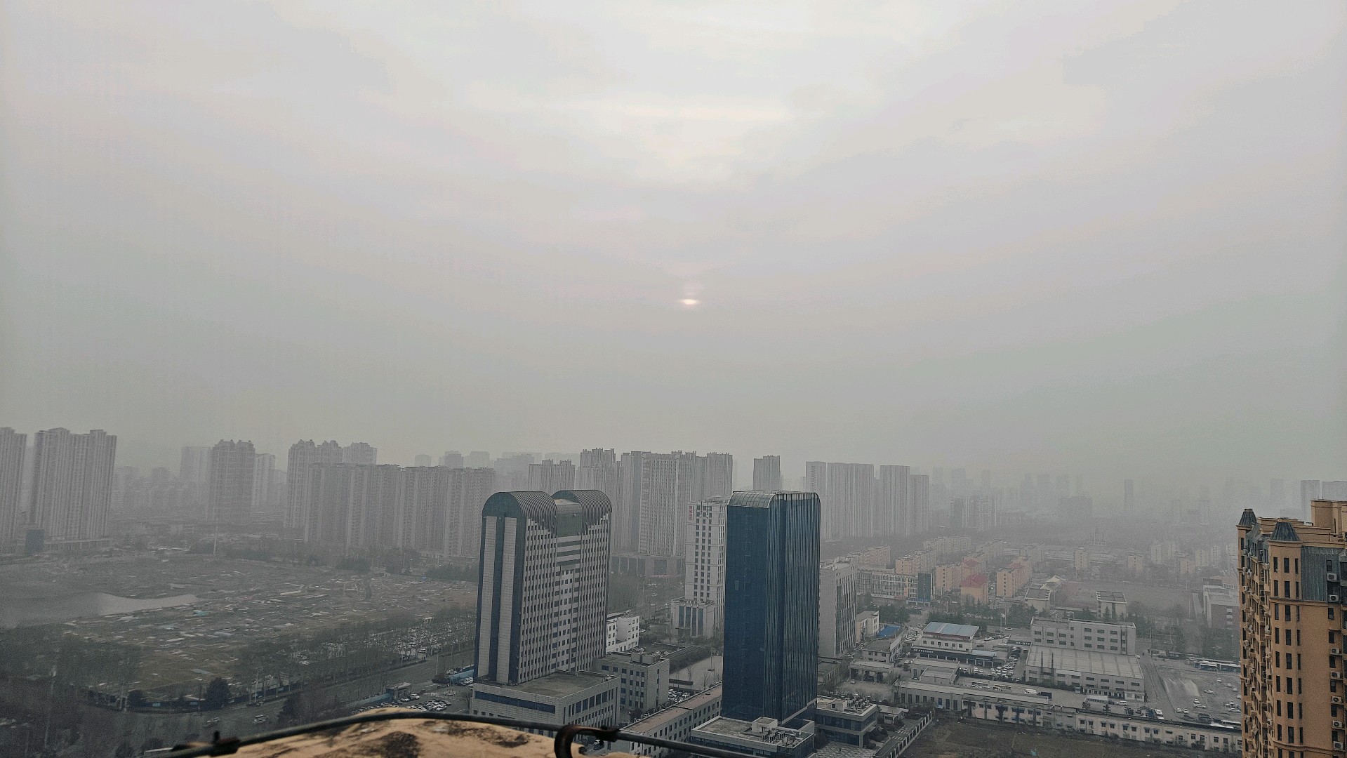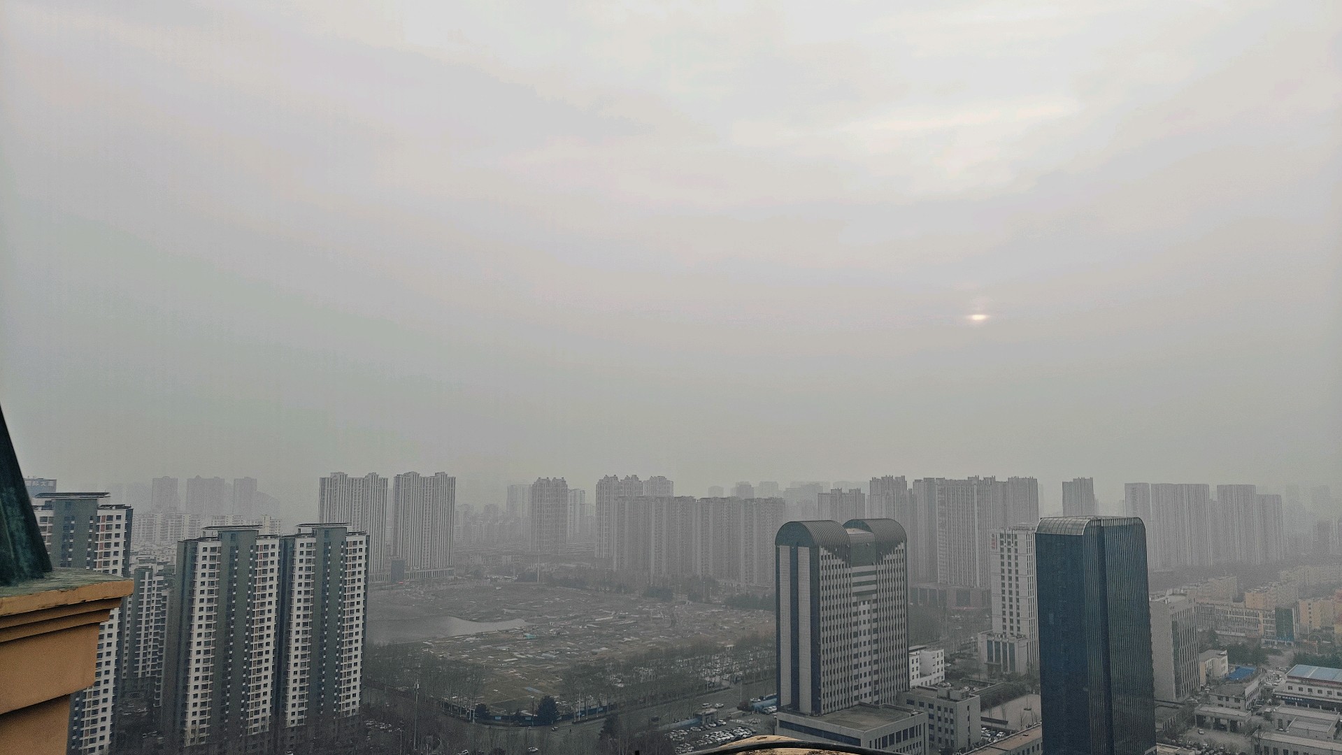 灰蒙蒙的天空下,高楼林立的城市景观若隐若现。太阳被遮挡,整个城市沉浸在一种朦胧的美感中。