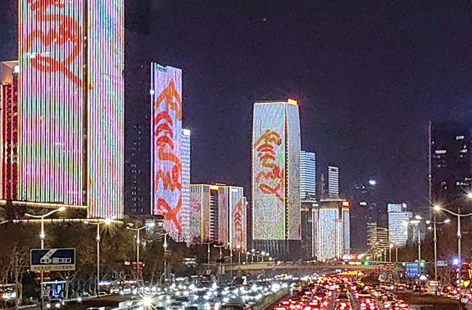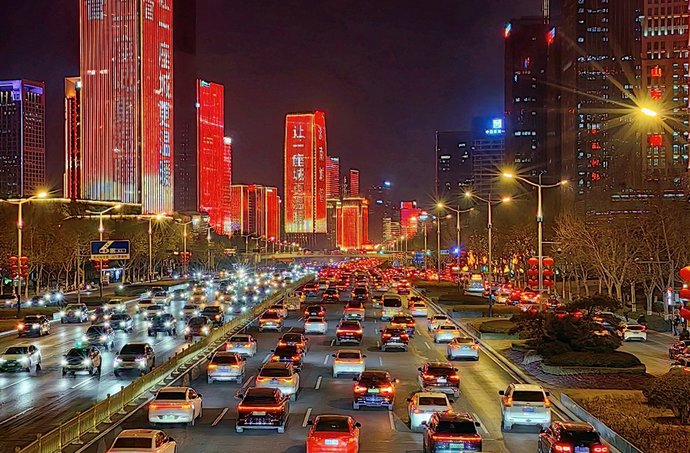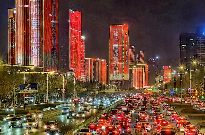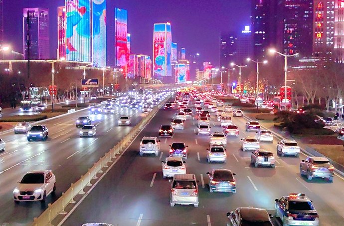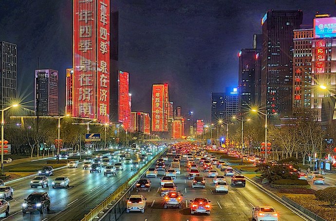 #壹点日历摄影征集,红包+文创奖励等你拿#2026.2.11.拍摄于济南经十路万象城段。小年刚过,济南经十路万象城段已浸透在春节的暖流中。车流如织,川行不息,每一盏车灯都似归心似箭的星子,划破冬夜的微寒。马路两旁,霓虹灯交相辉映,红的似火,蓝的如水,在寒风中跳跃成一片沸腾的海洋。橱窗里的光影流转,映照着行人的笑靥,仿佛在低语:年关将至,团圆不远。