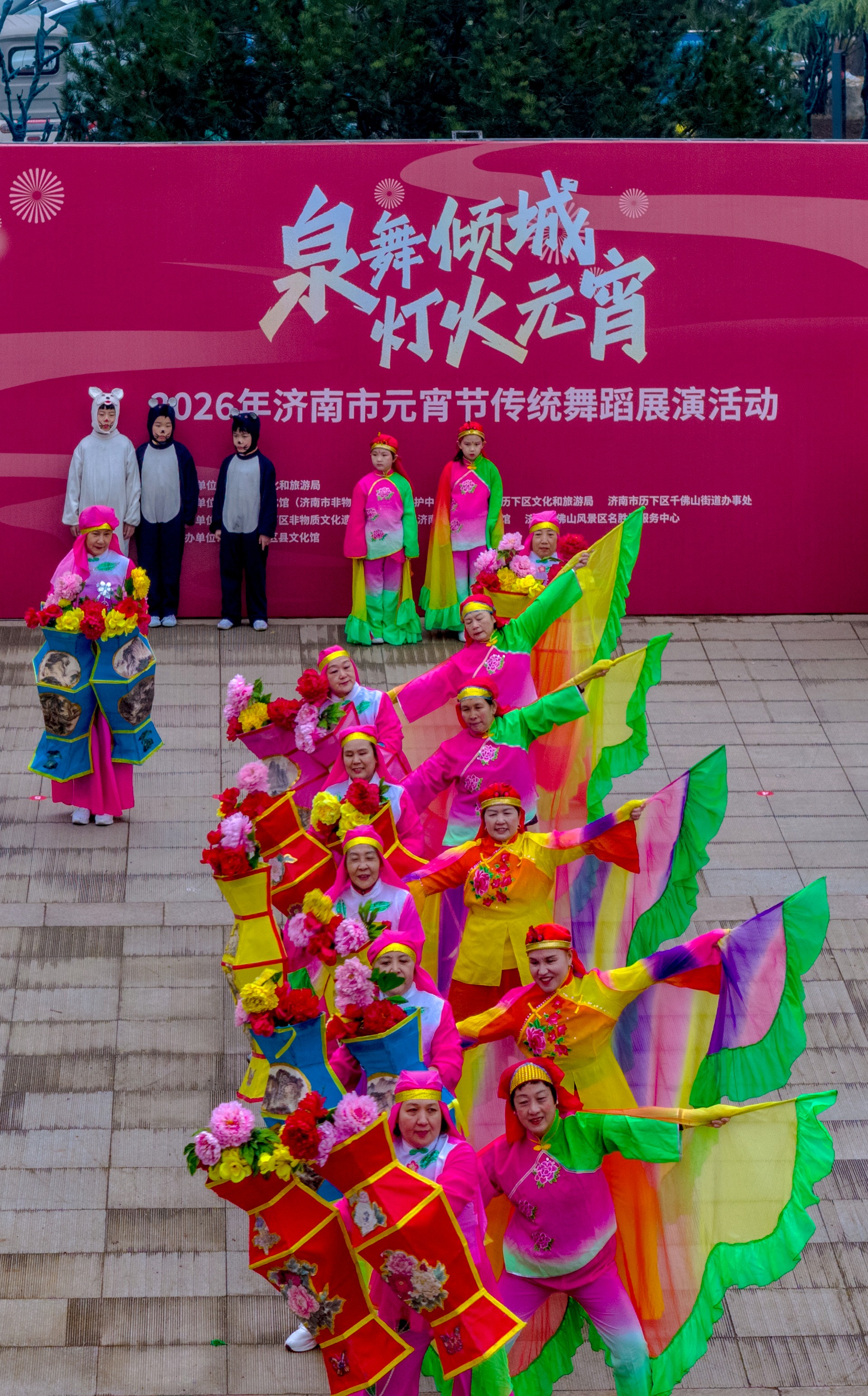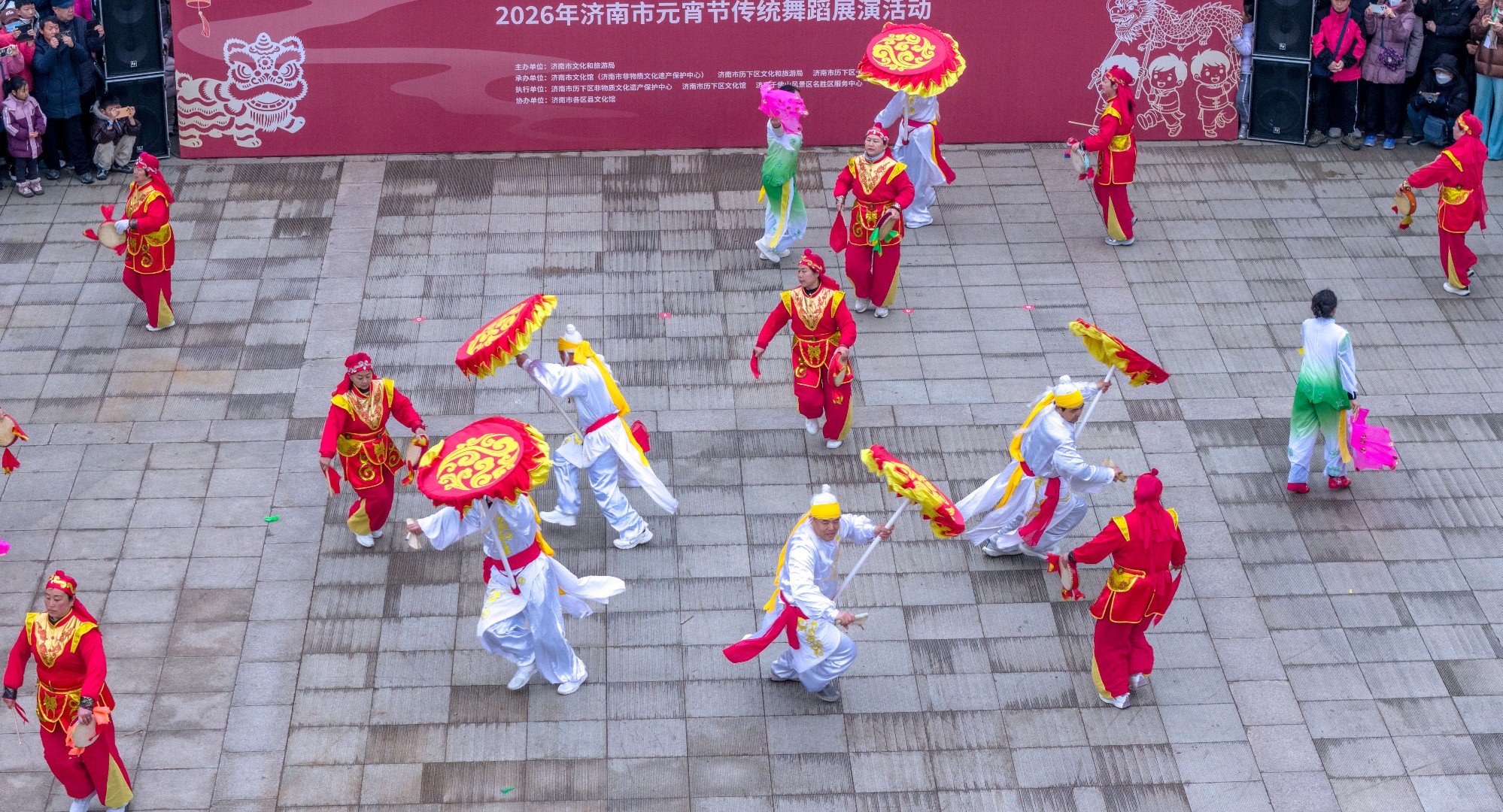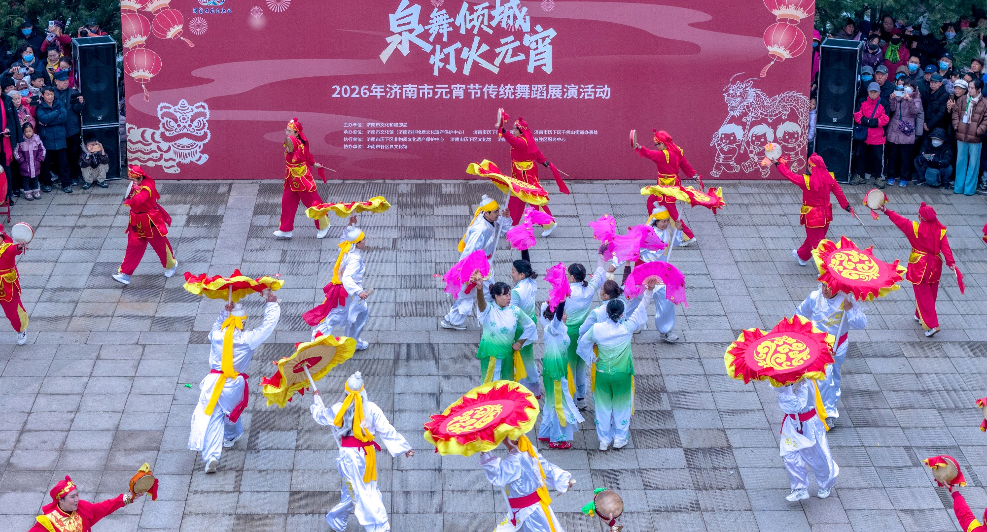 2026济南市元宵节传统舞蹈展演在千佛山公园南门广场精彩上演。来自各区县的10支队伍登台献艺,国家级、省市级非遗节目轮番亮相,群舞气势磅礴、队形灵动多变。现场锣鼓喧天、观众云集,里三层外三层热闹非凡,尽显泉城元宵佳节的浓郁年味与民俗魅力。