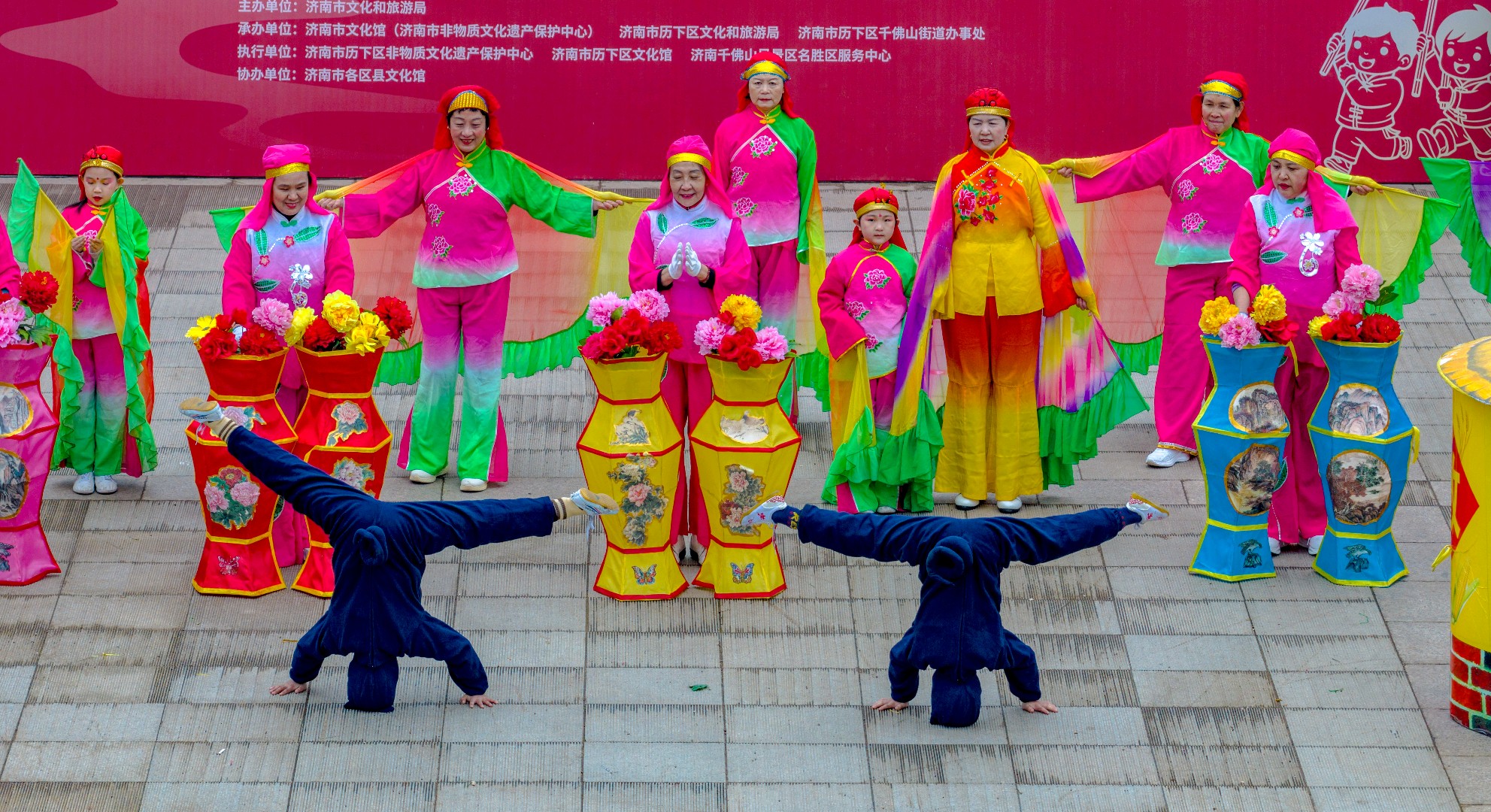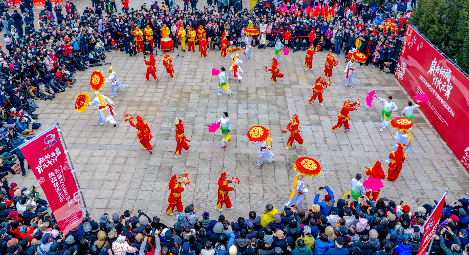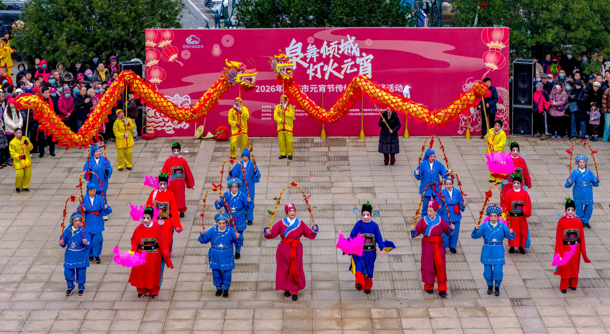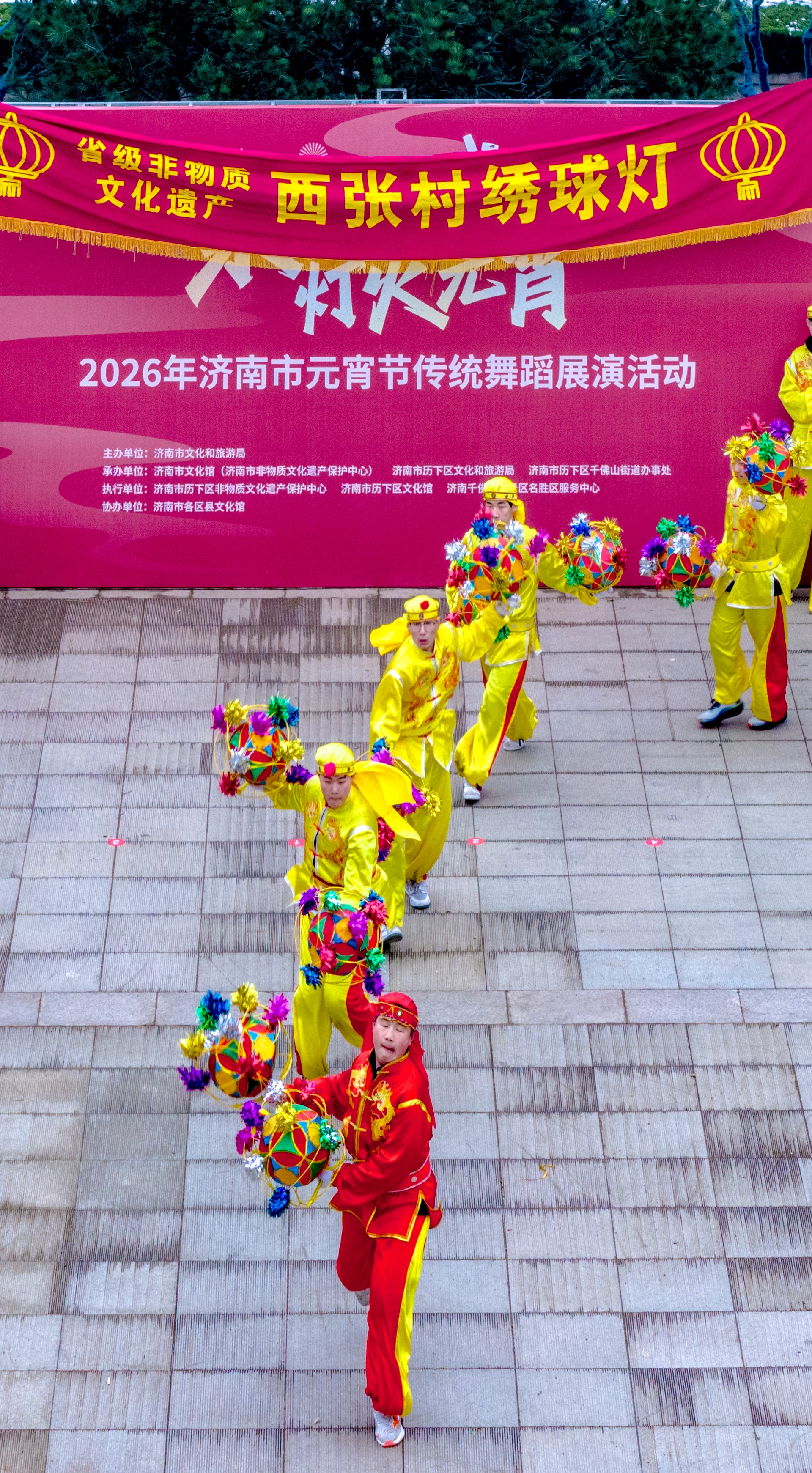 2026济南市元宵节传统舞蹈展演在千佛山公园南门广场精彩上演。来自各区县的10支队伍登台献艺,国家级、省市级非遗节目轮番亮相,群舞气势磅礴、队形灵动多变。现场锣鼓喧天、观众云集,里三层外三层热闹非凡,尽显泉城元宵佳节的浓郁年味与民俗魅力。