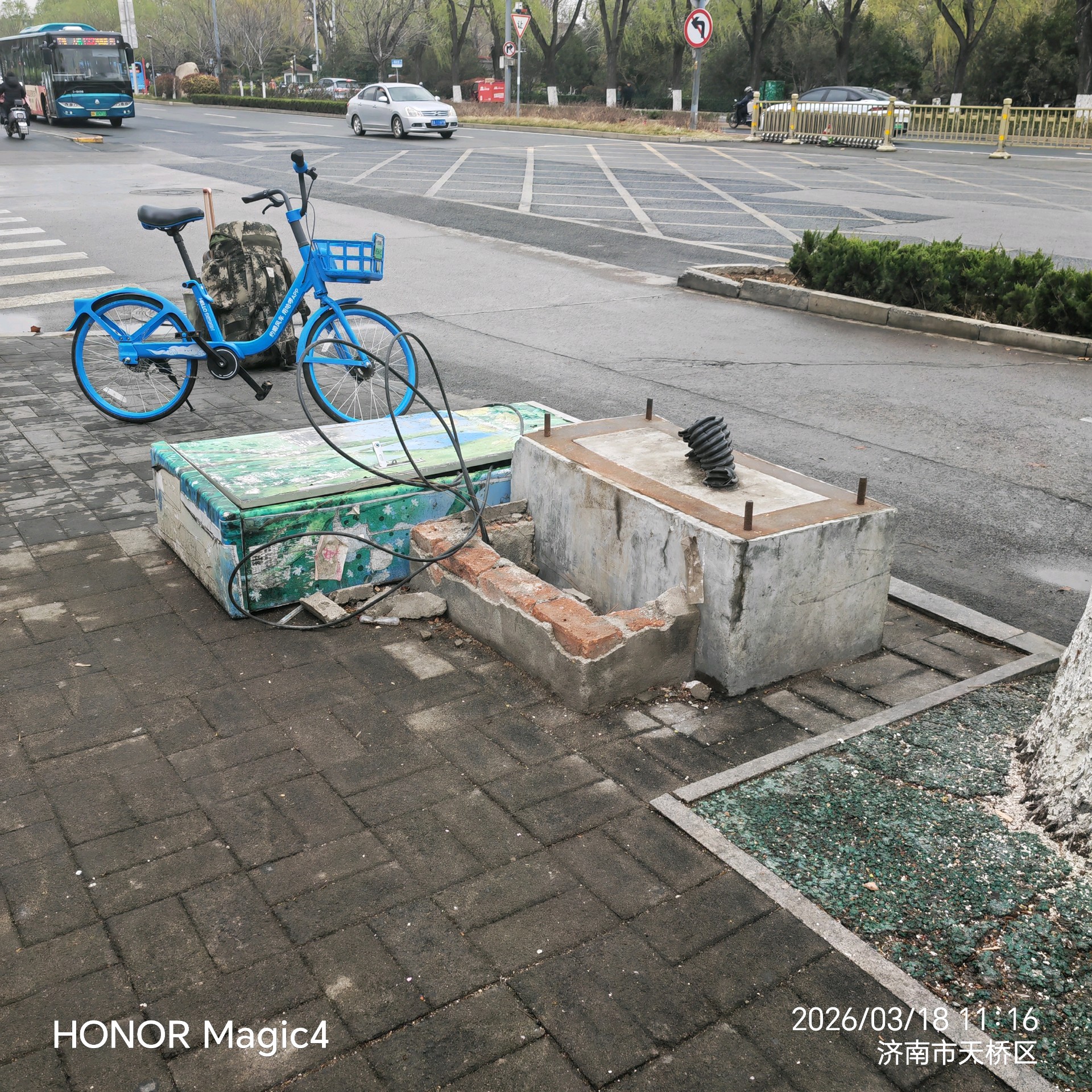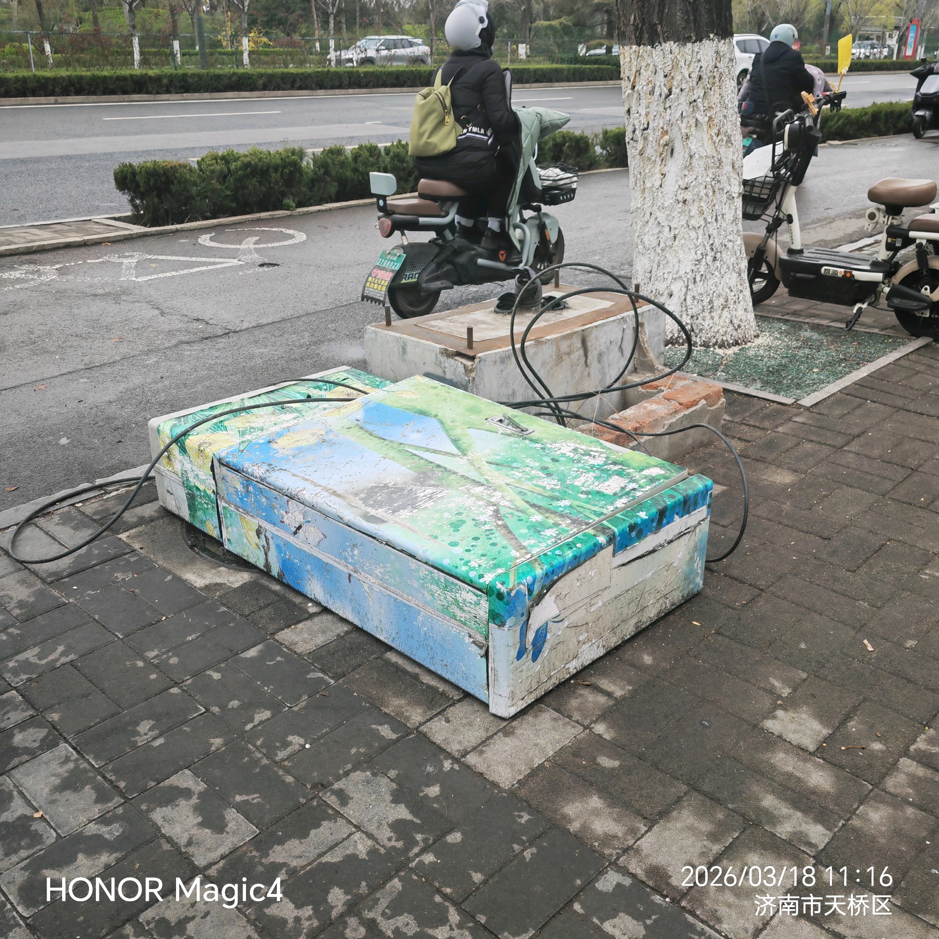 在明湖北路,大明湖火车站进站口附近,有个配电箱躺在地上已经很久了,既不美观又不安全。希望责任部门把它修好,谢谢
