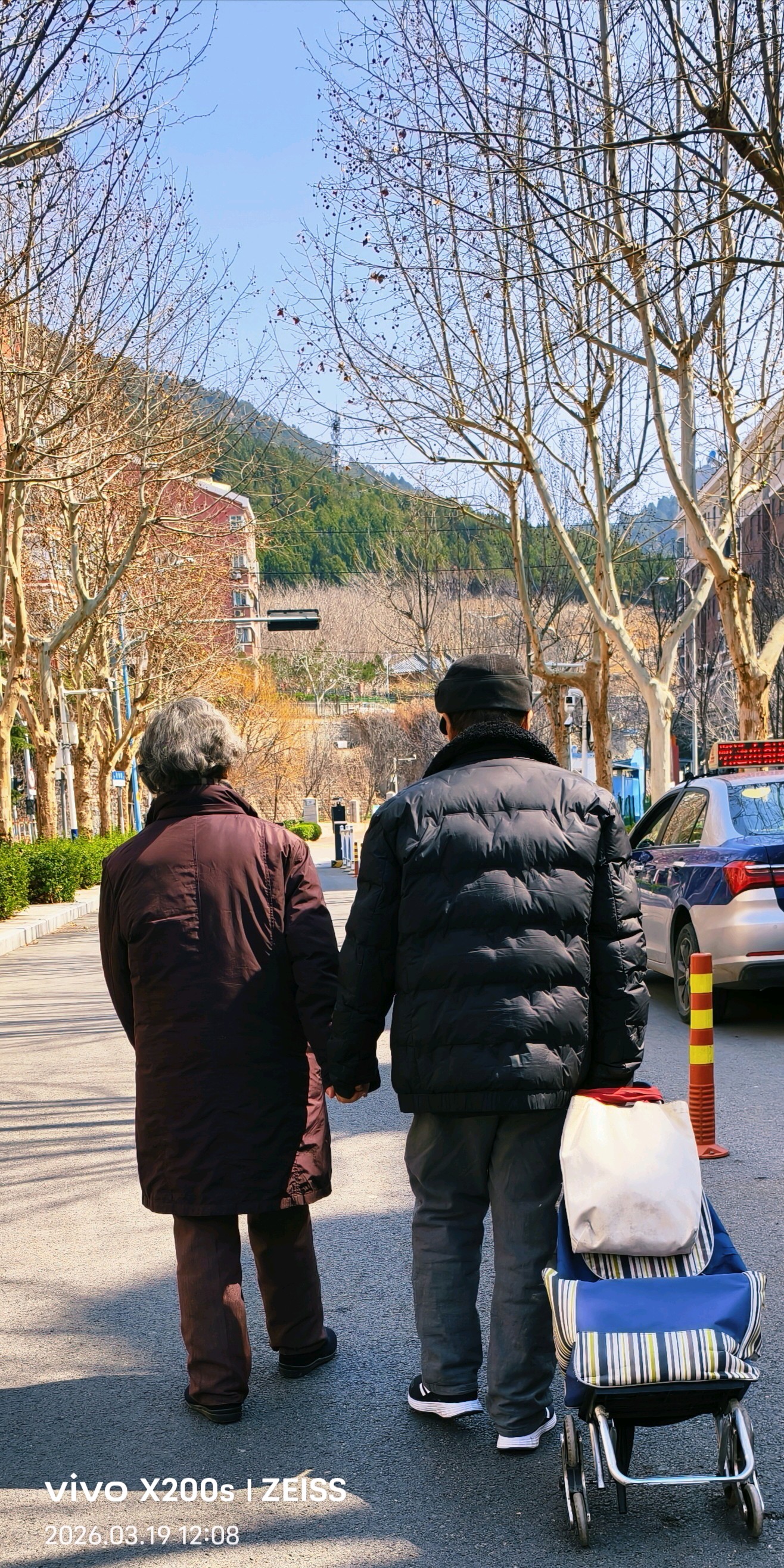 我刚出家门,就撞见一对老夫妻。老爷爷右手攥着买菜的小拉车,左手牢牢牵着老奶奶的手。他们走得慢,嘴角却翘得老高,不知道在聊什么家常,满脸的笑容。