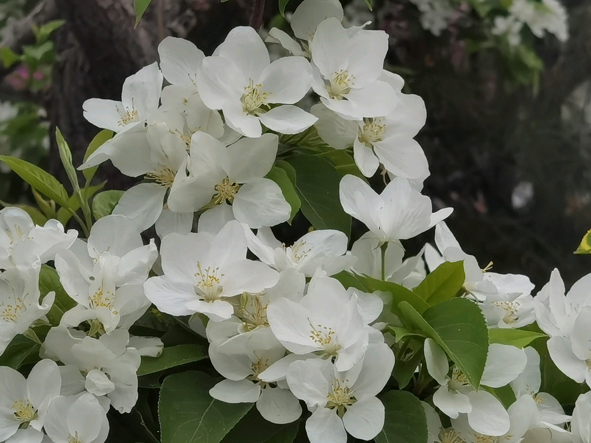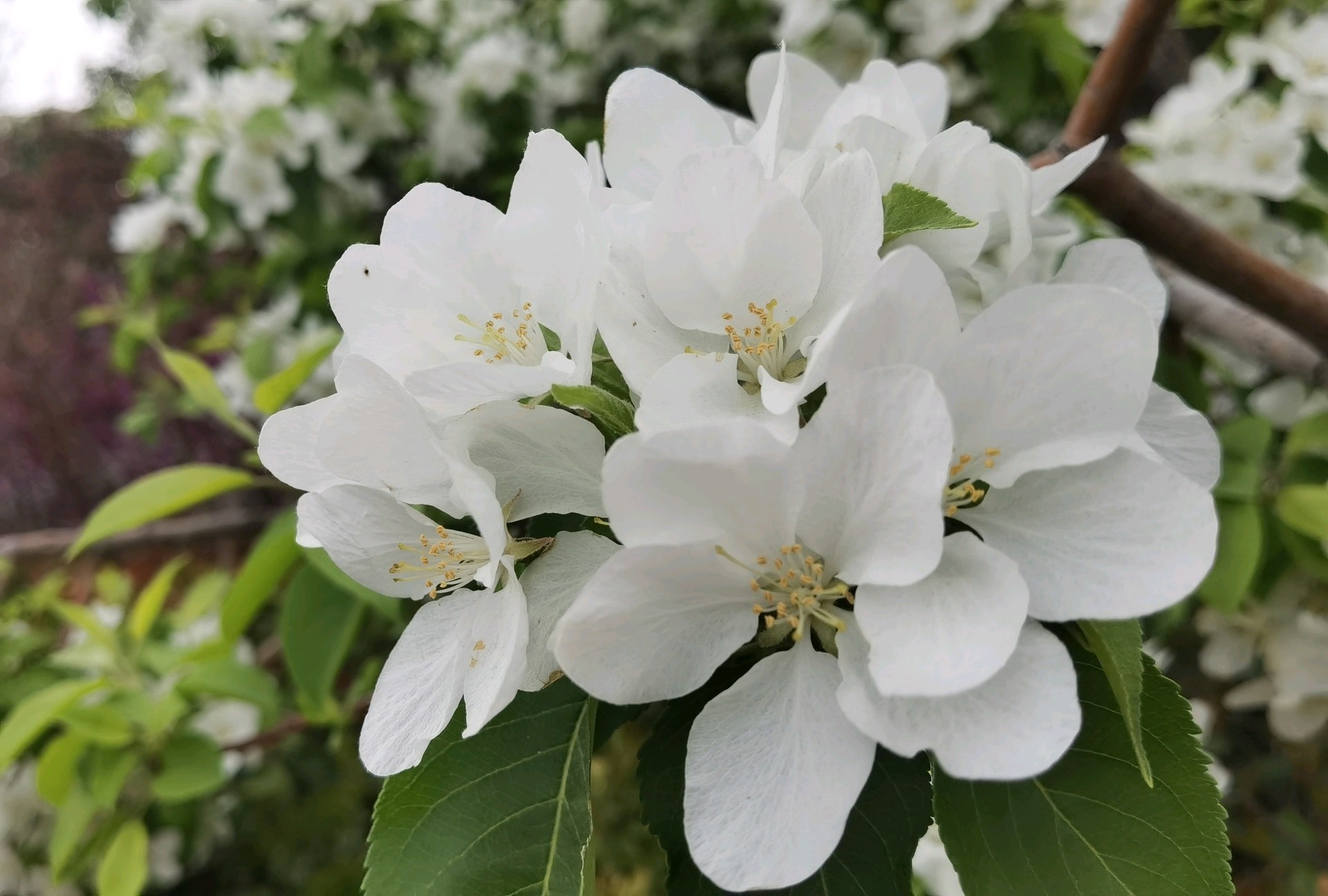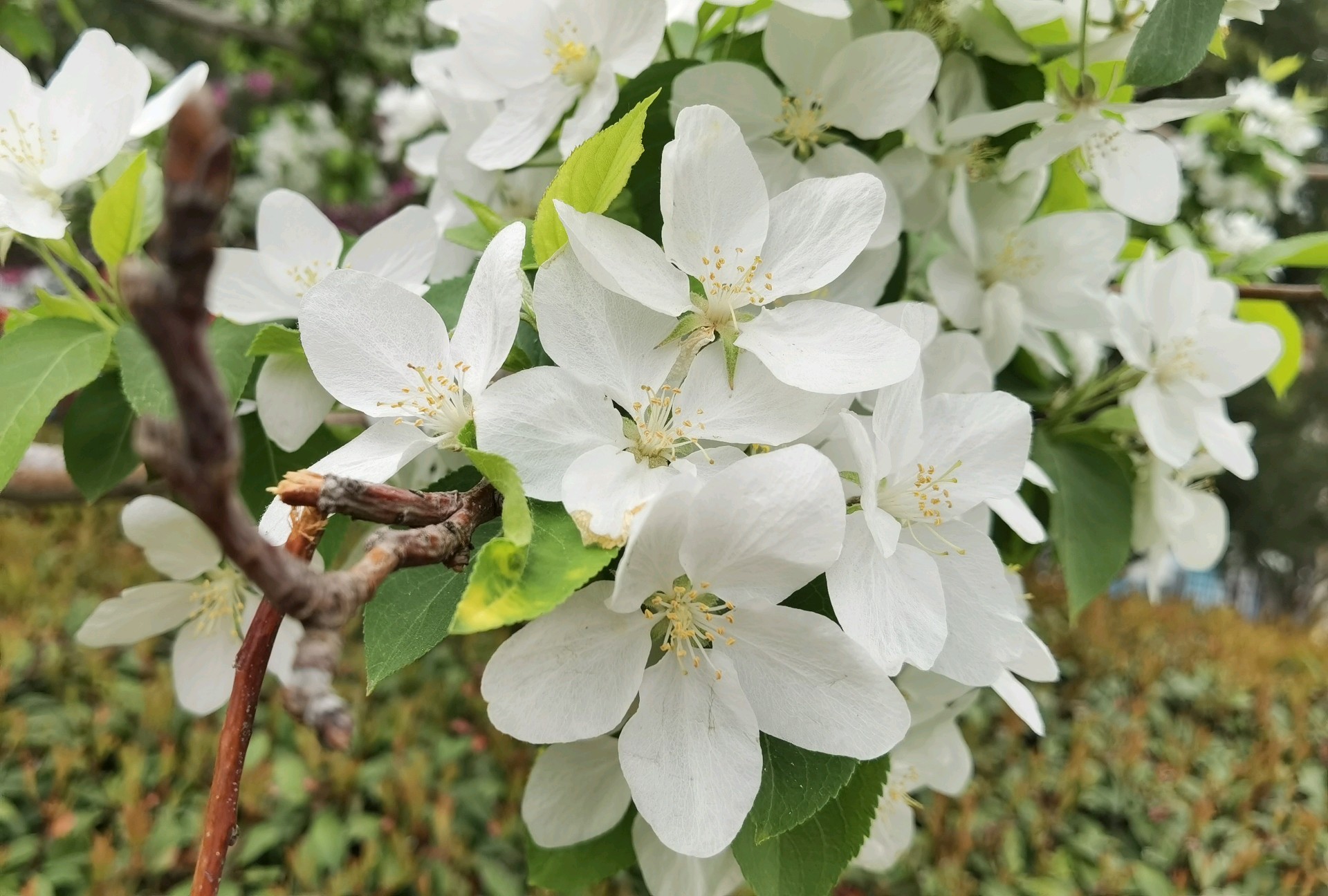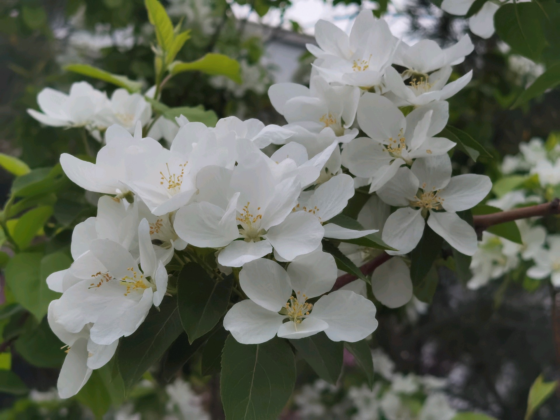 雪白的海棠花,花朵簇拥在枝头,中间有几朵含苞待放的花骨朵儿,周围有几片绿叶点缀。
