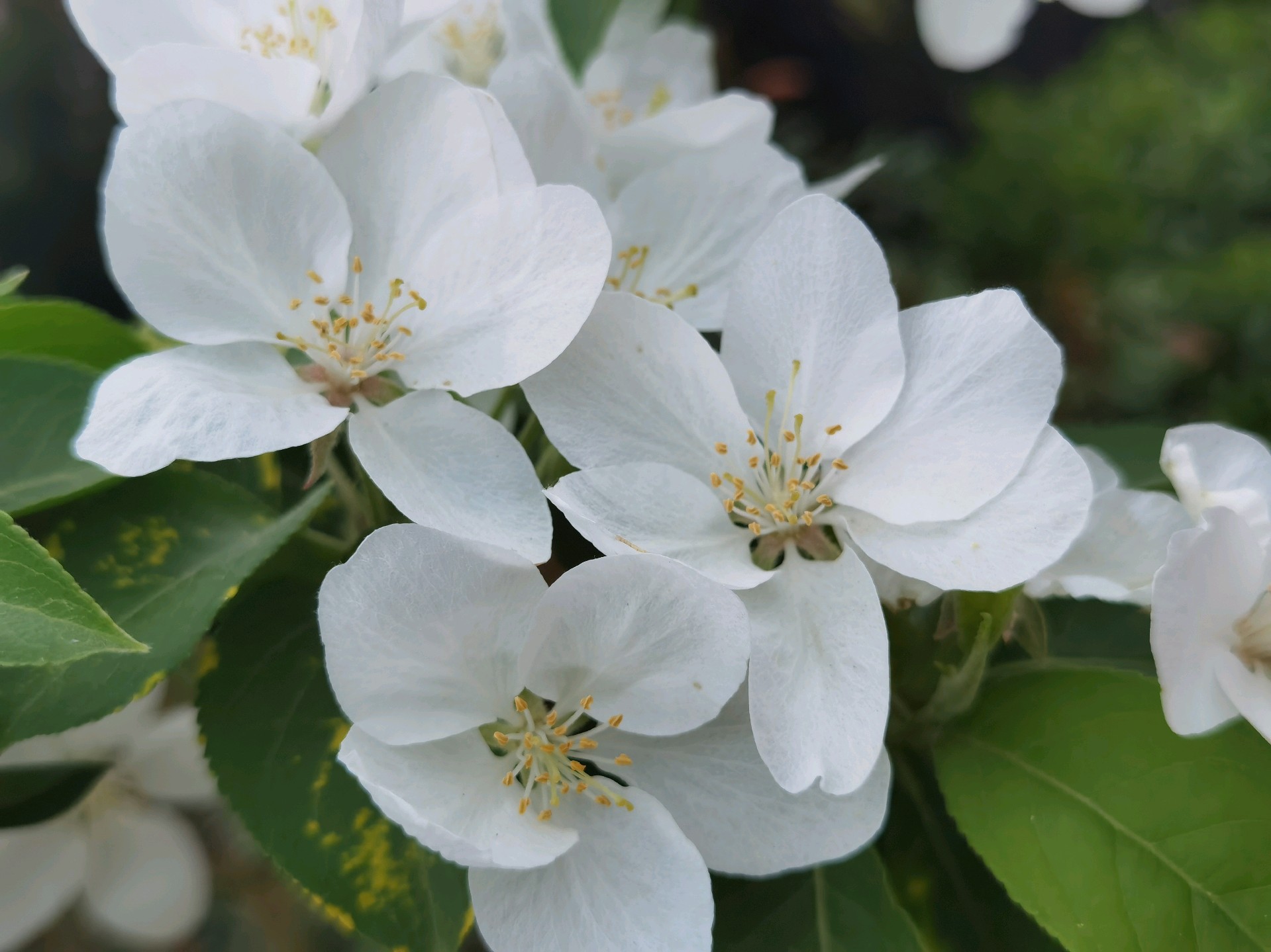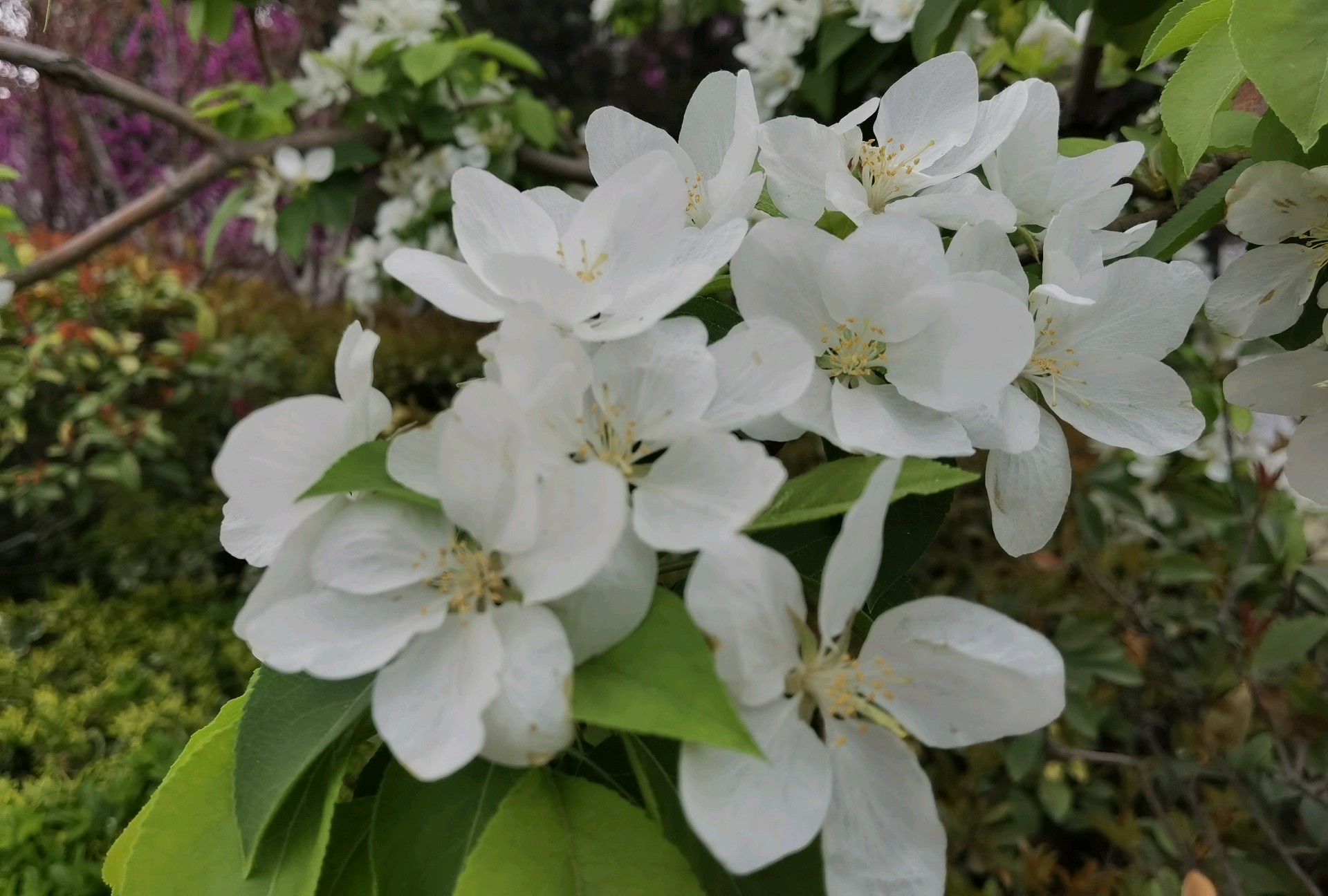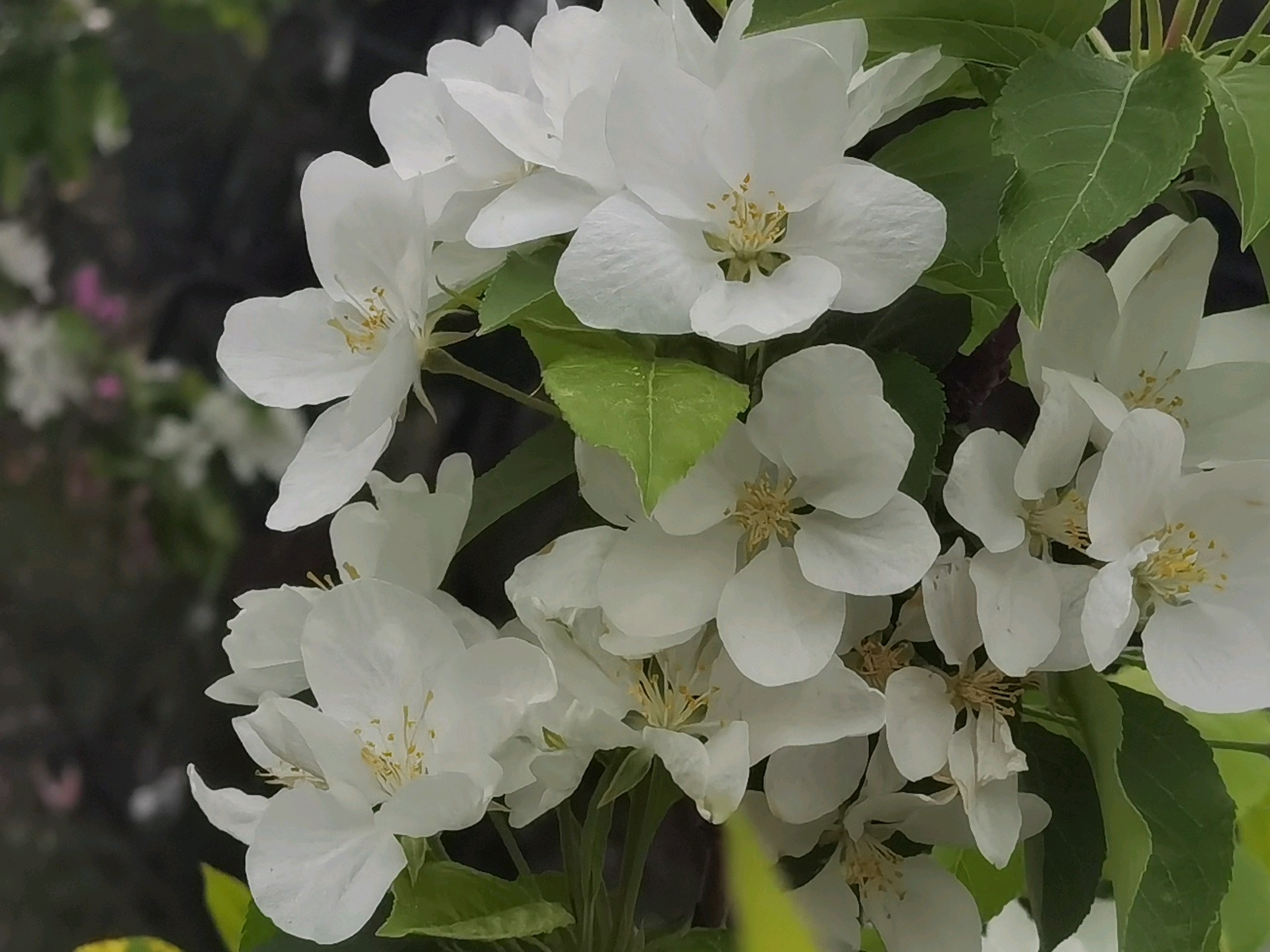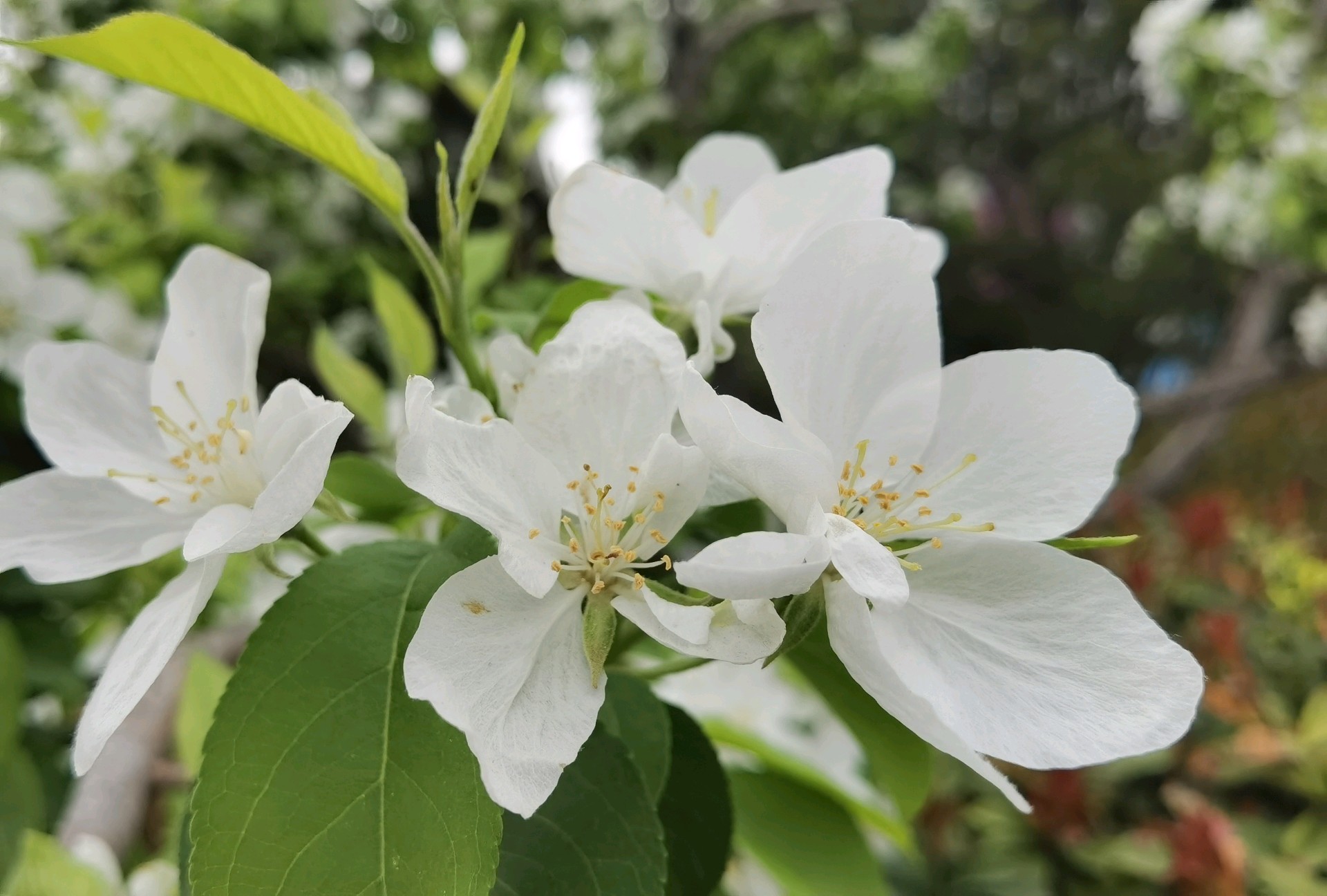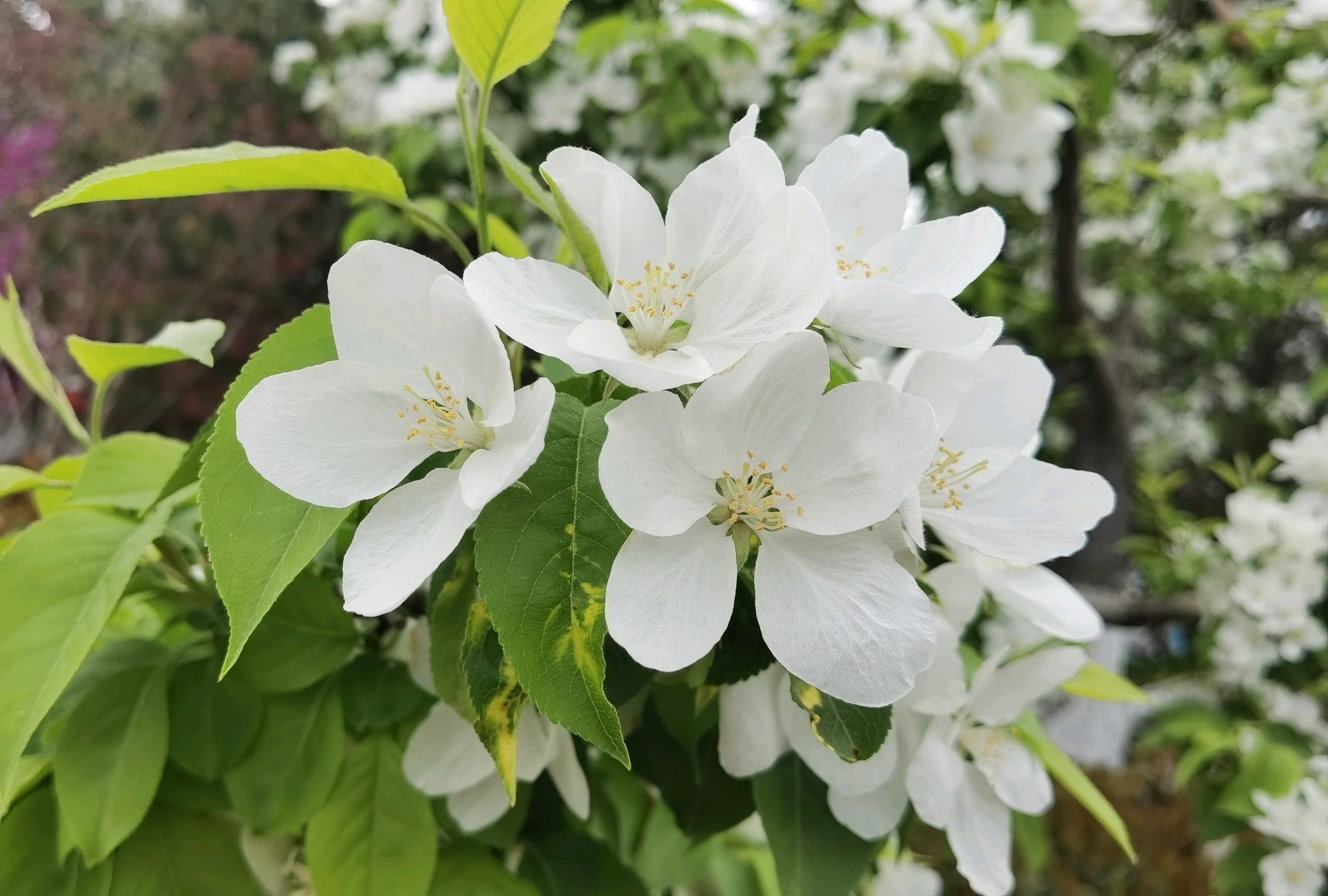 雪白的海棠花,花朵簇拥在枝头,中间有几朵含苞待放的花骨朵儿,周围有几片绿叶点缀。