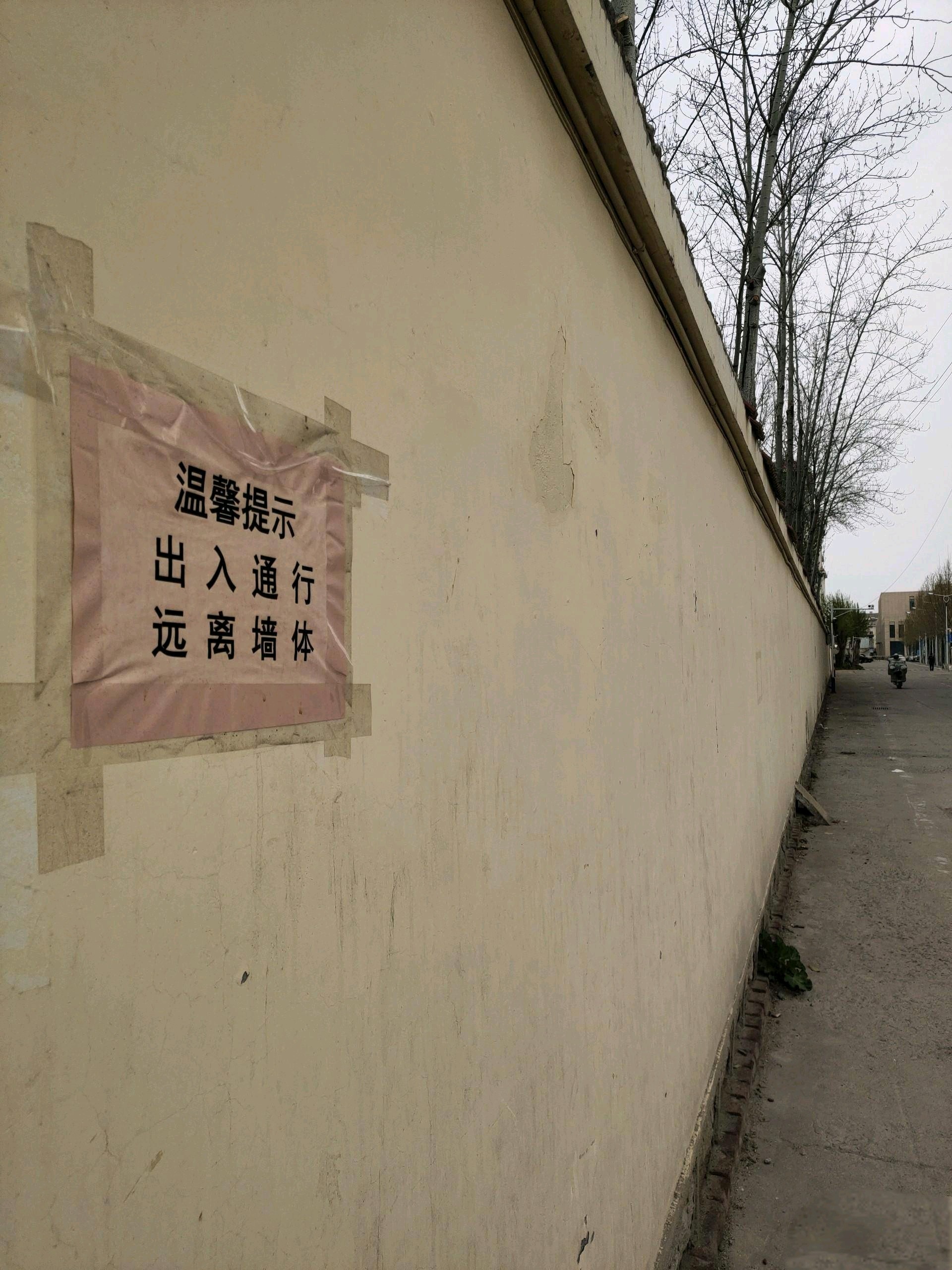 #共创美好随手拍#德州市德城区政务中心入口有一条百余米的甬道,宽十米左右。从去年开始,在右侧砖墙隔几米贴上了这样的"温馨提示",如果是危墙,可多半年了也不见修缮。这是进出中心的必经之路,行人车辆很多。甚是费解!