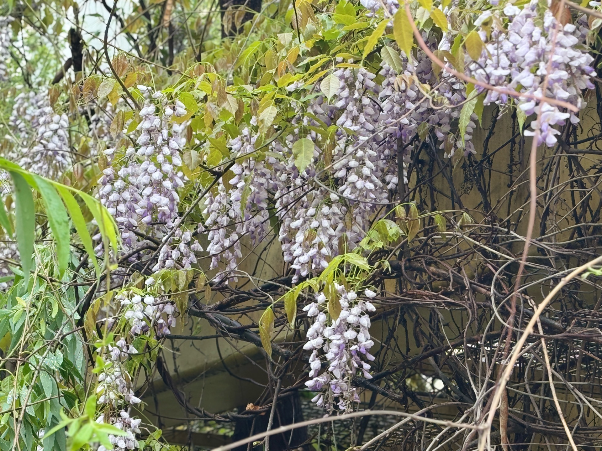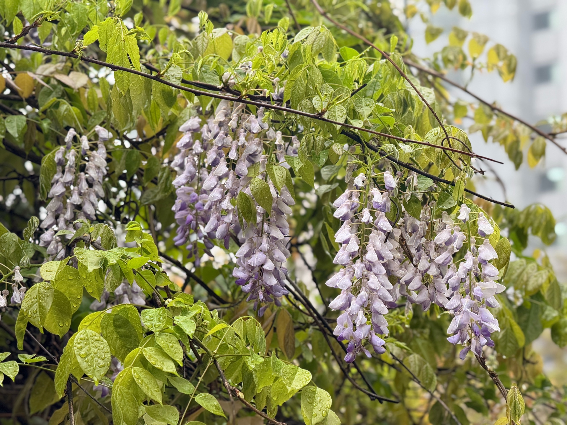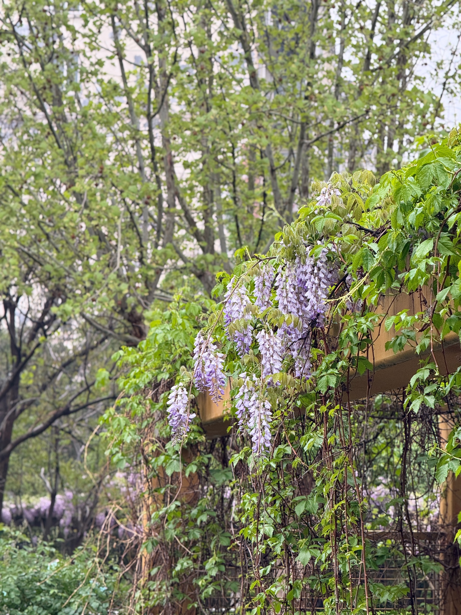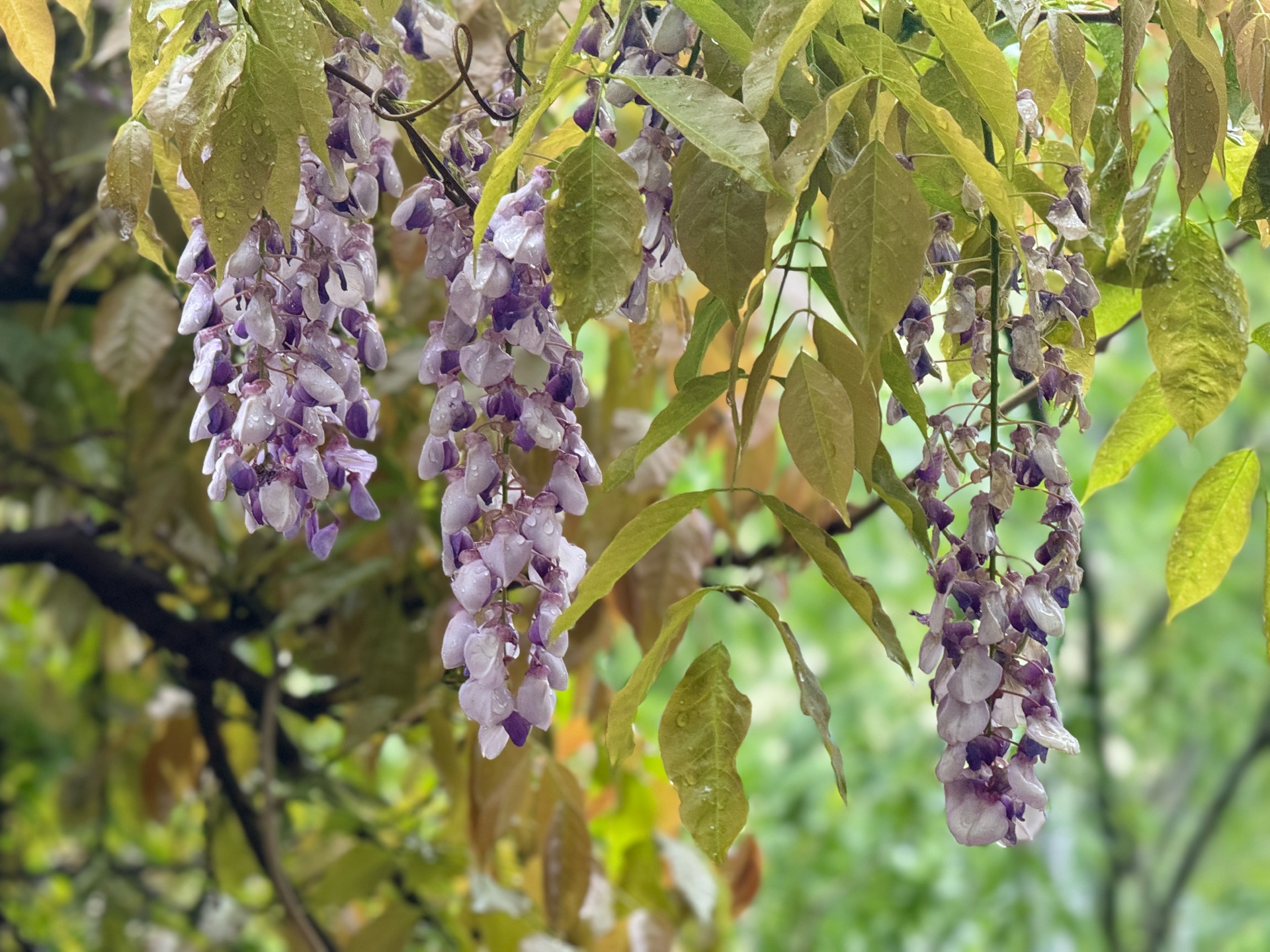 一夜春雨,河边嫰绿的柳树叶已然成荫。在柳树下的一处架子上,盛开着带着雨滴的紫藤花。一排排,一簇簇,饱满又灵动。