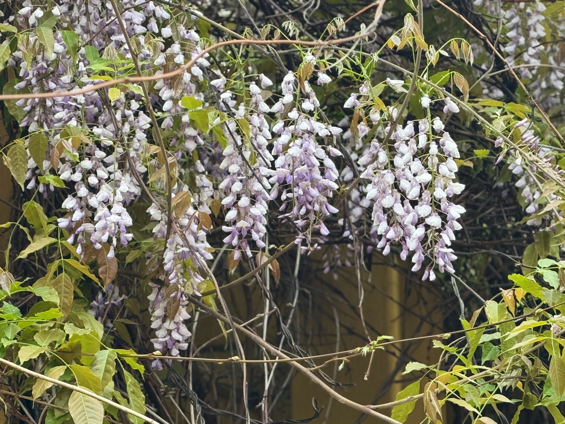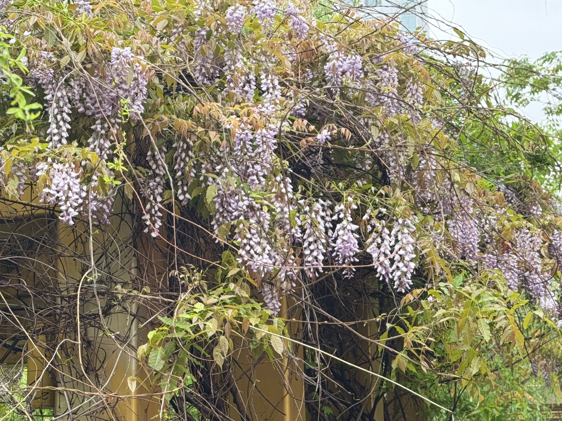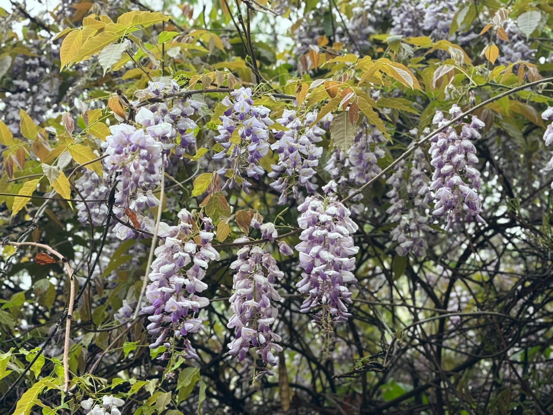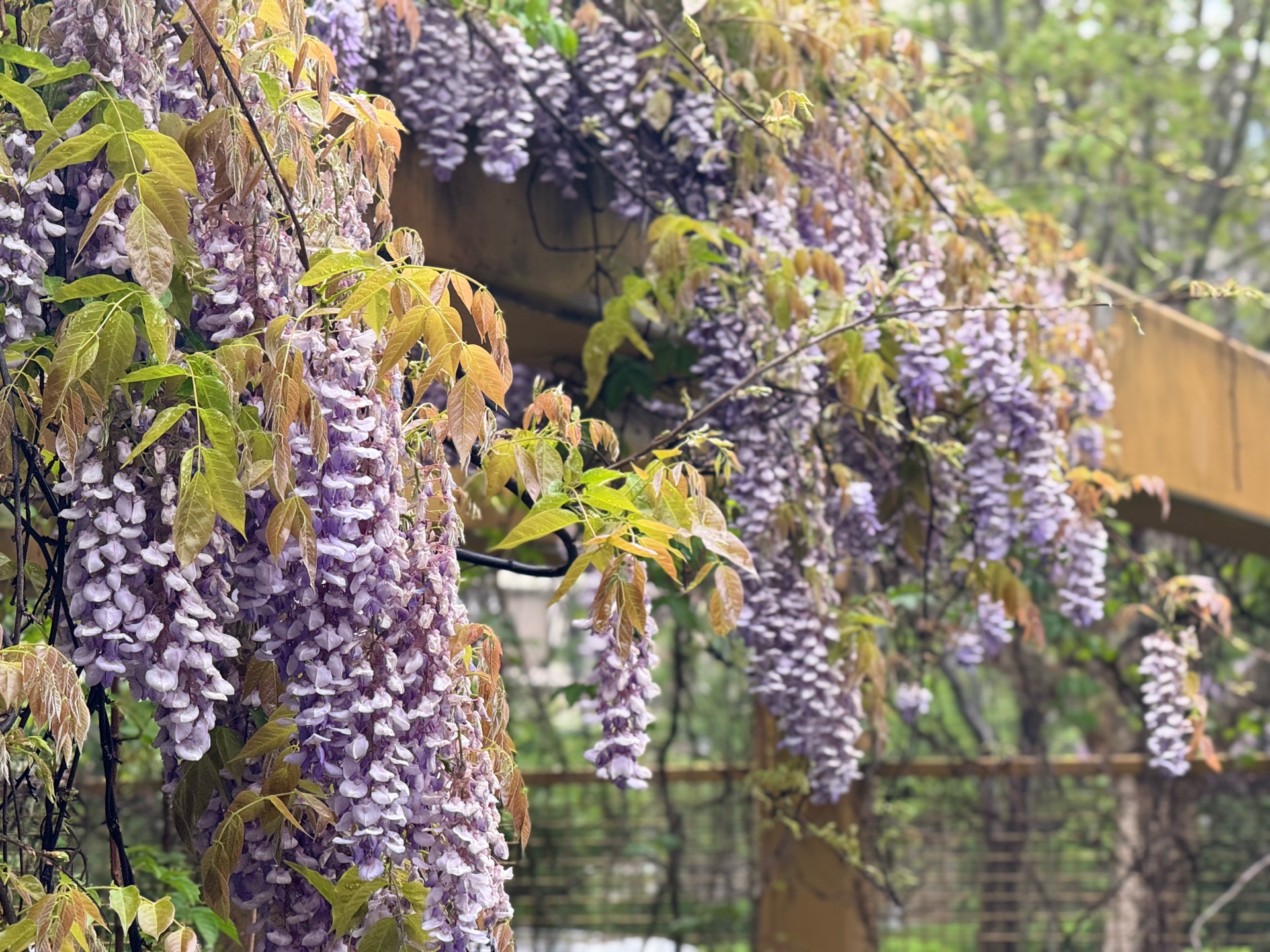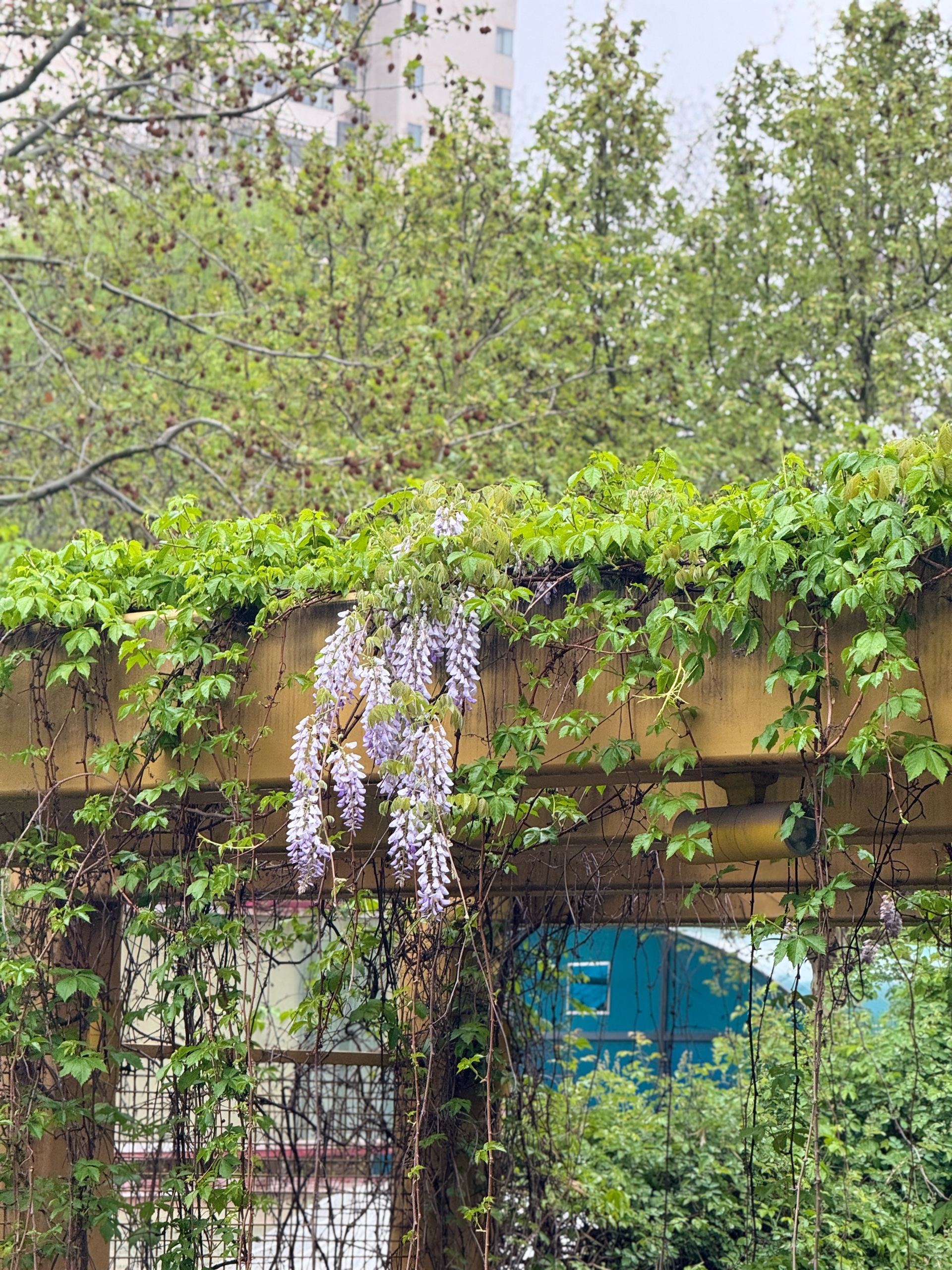 一夜春雨,河边嫰绿的柳树叶已然成荫。在柳树下的一处架子上,盛开着带着雨滴的紫藤花。一排排,一簇簇,饱满又灵动。