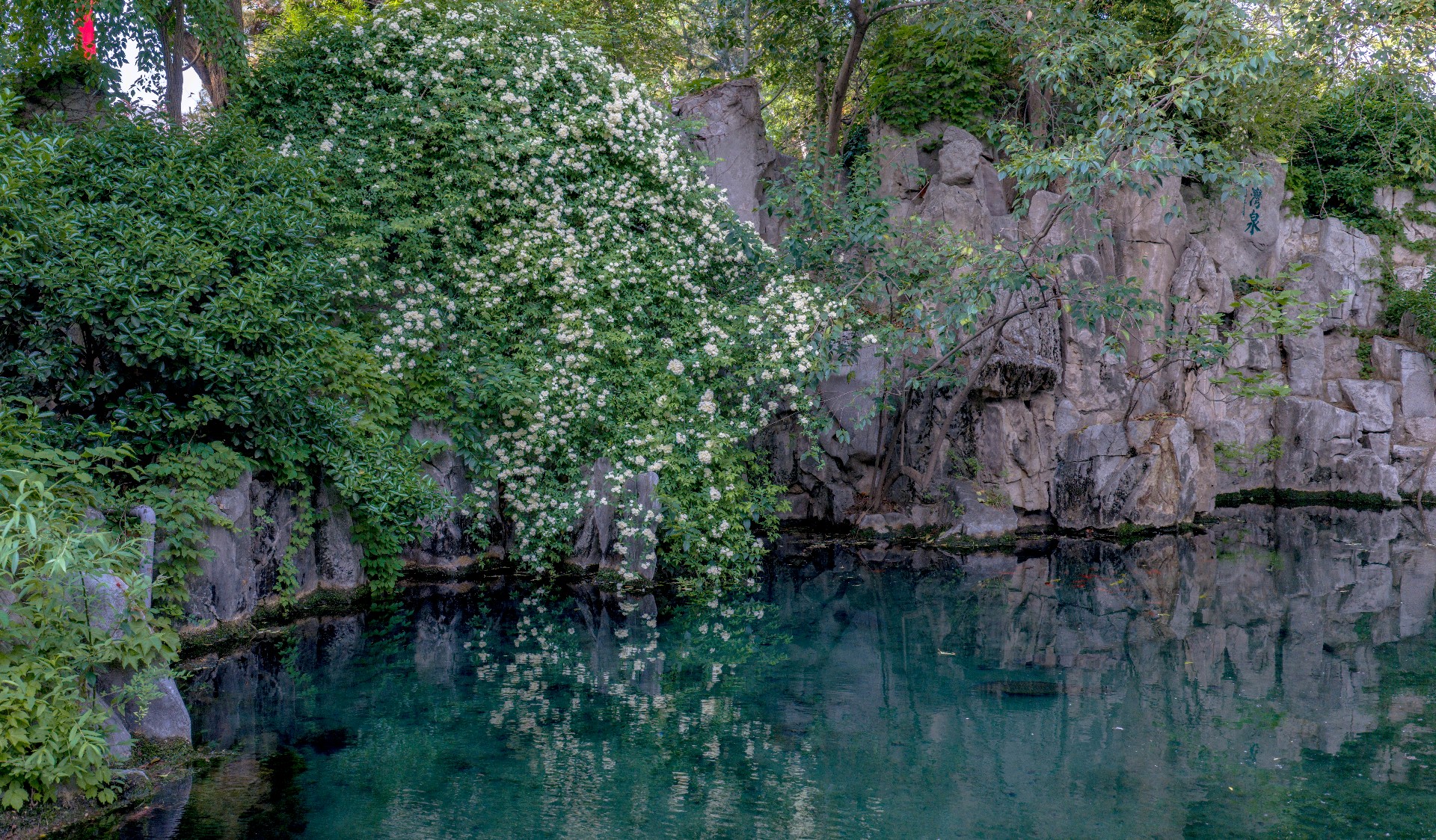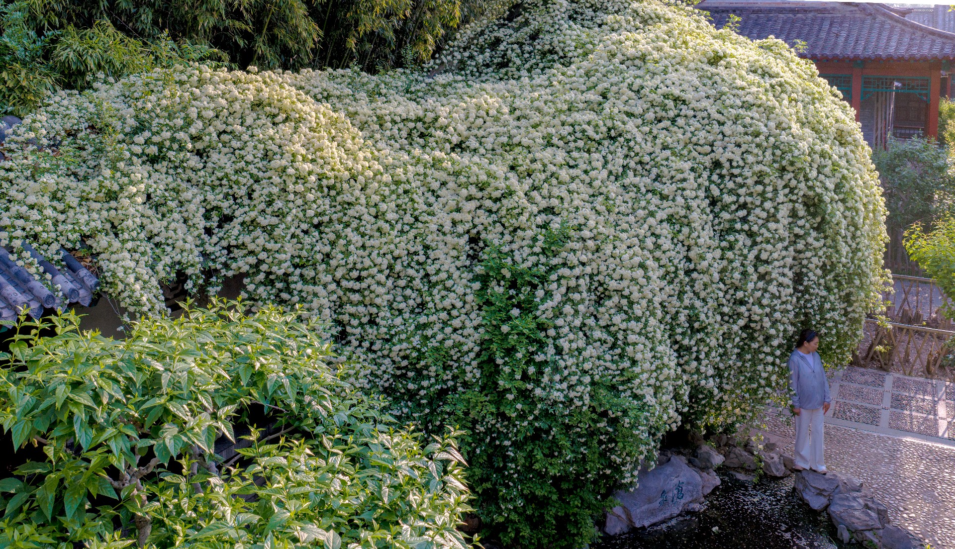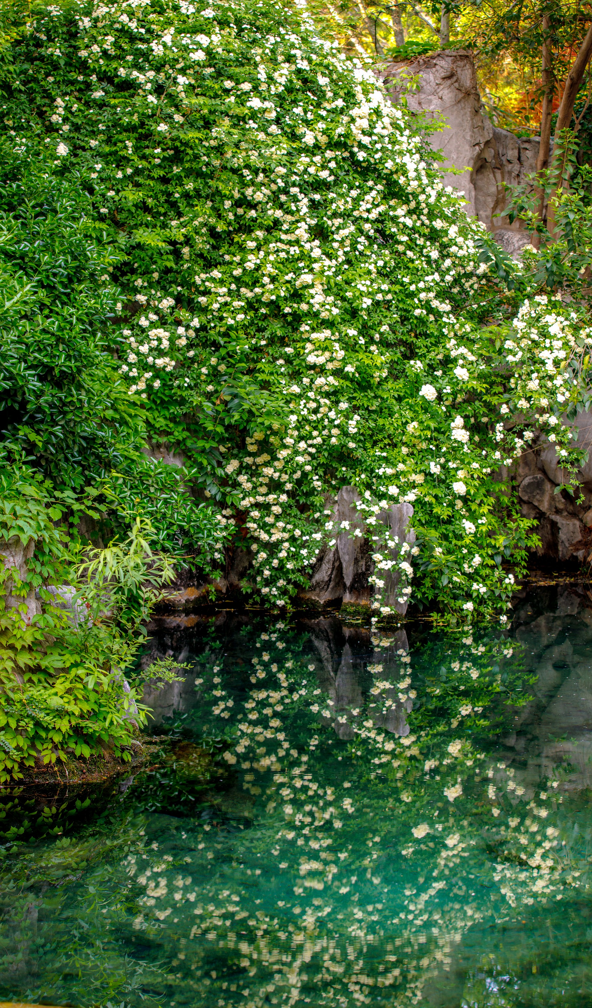 趵突泉沧园木香花盛放,白花密缀垂枝,如倾泻花瀑,微风拂过花瓣飘落沧泉,清雅诗意。花繁景盛引得游人驻足拍照。石湾泉木香倒映清泉,花影相融,清幽雅致。