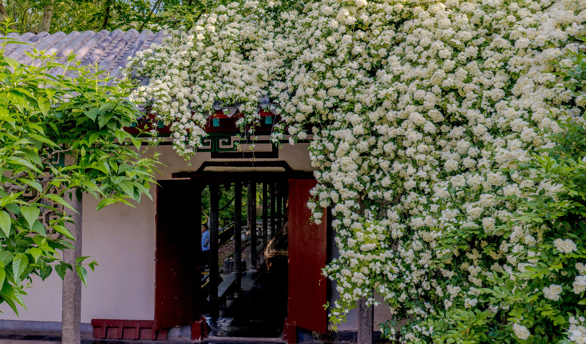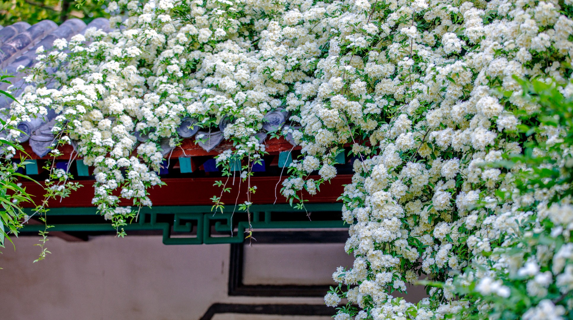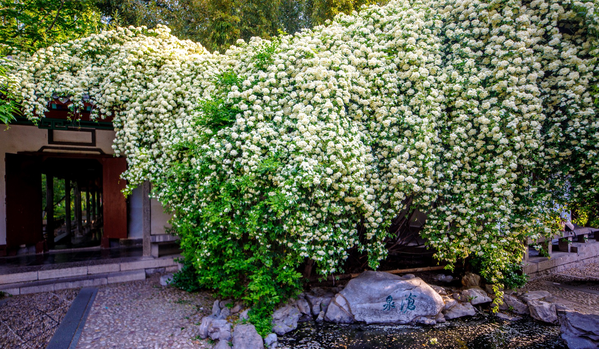 趵突泉沧园木香花盛放,白花密缀垂枝,如倾泻花瀑,微风拂过花瓣飘落沧泉,清雅诗意。花繁景盛引得游人驻足拍照。石湾泉木香倒映清泉,花影相融,清幽雅致。