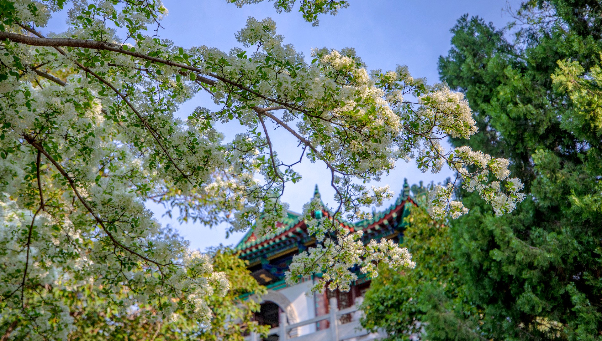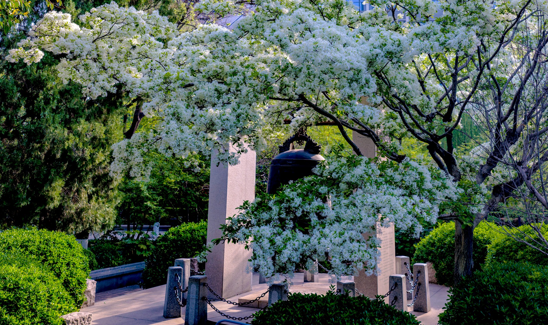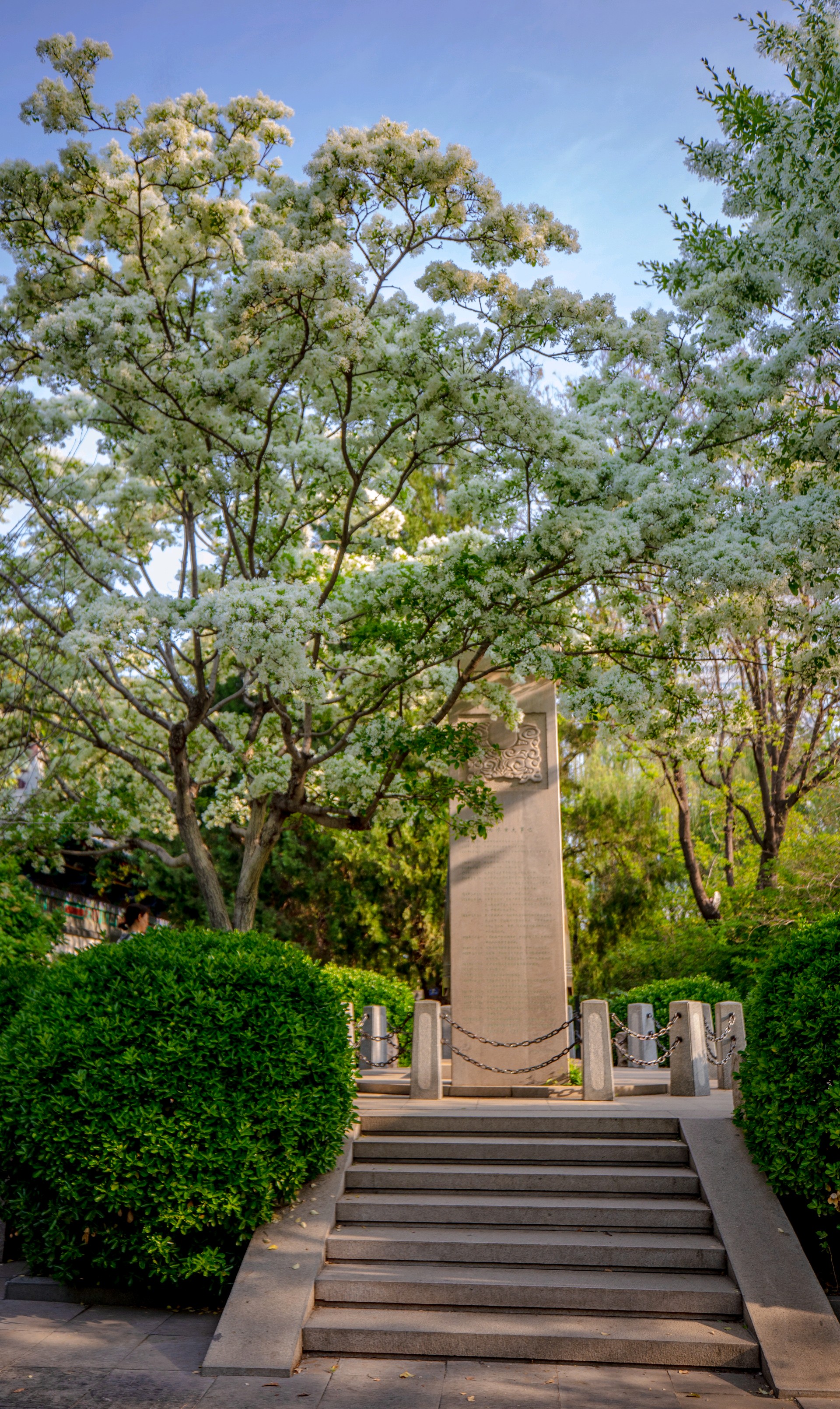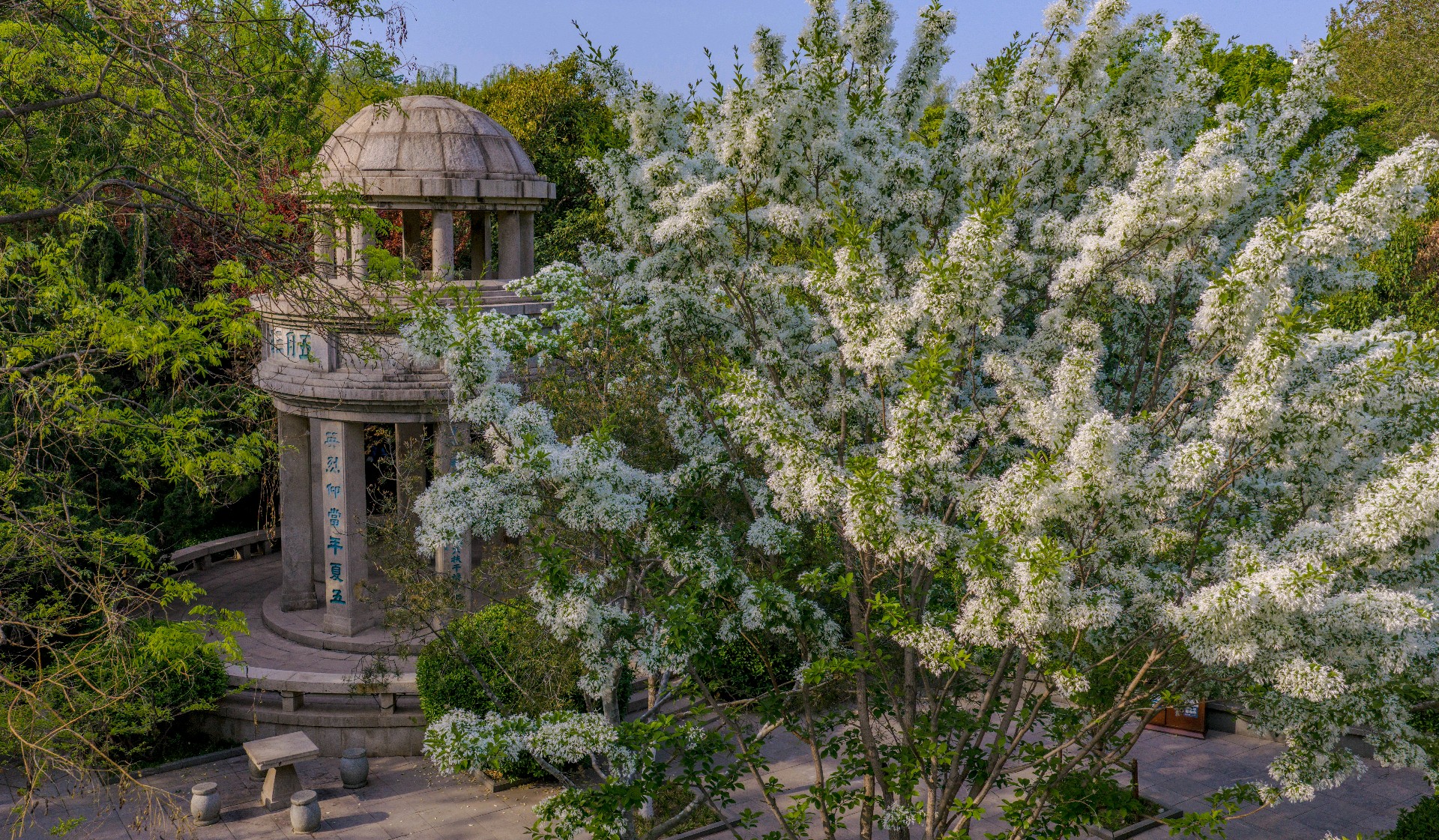 趵突泉五三惨案纪念碑旁的流苏树苍劲古朴。暮春时节繁花如雪,轻盈花瓣随风摇曳,清雅又庄重。青砖灰瓦衬着素白繁花,更添肃穆厚重。