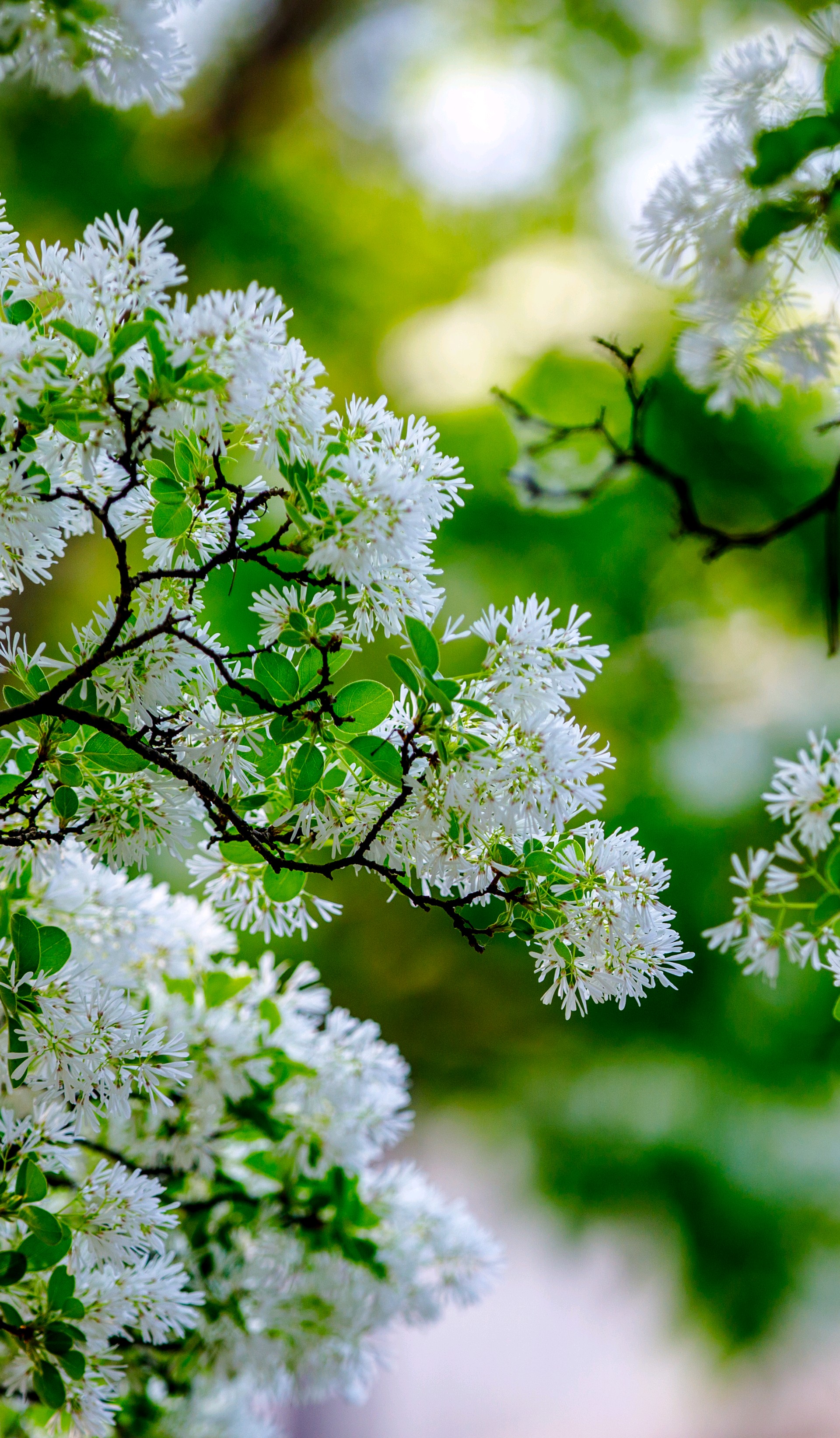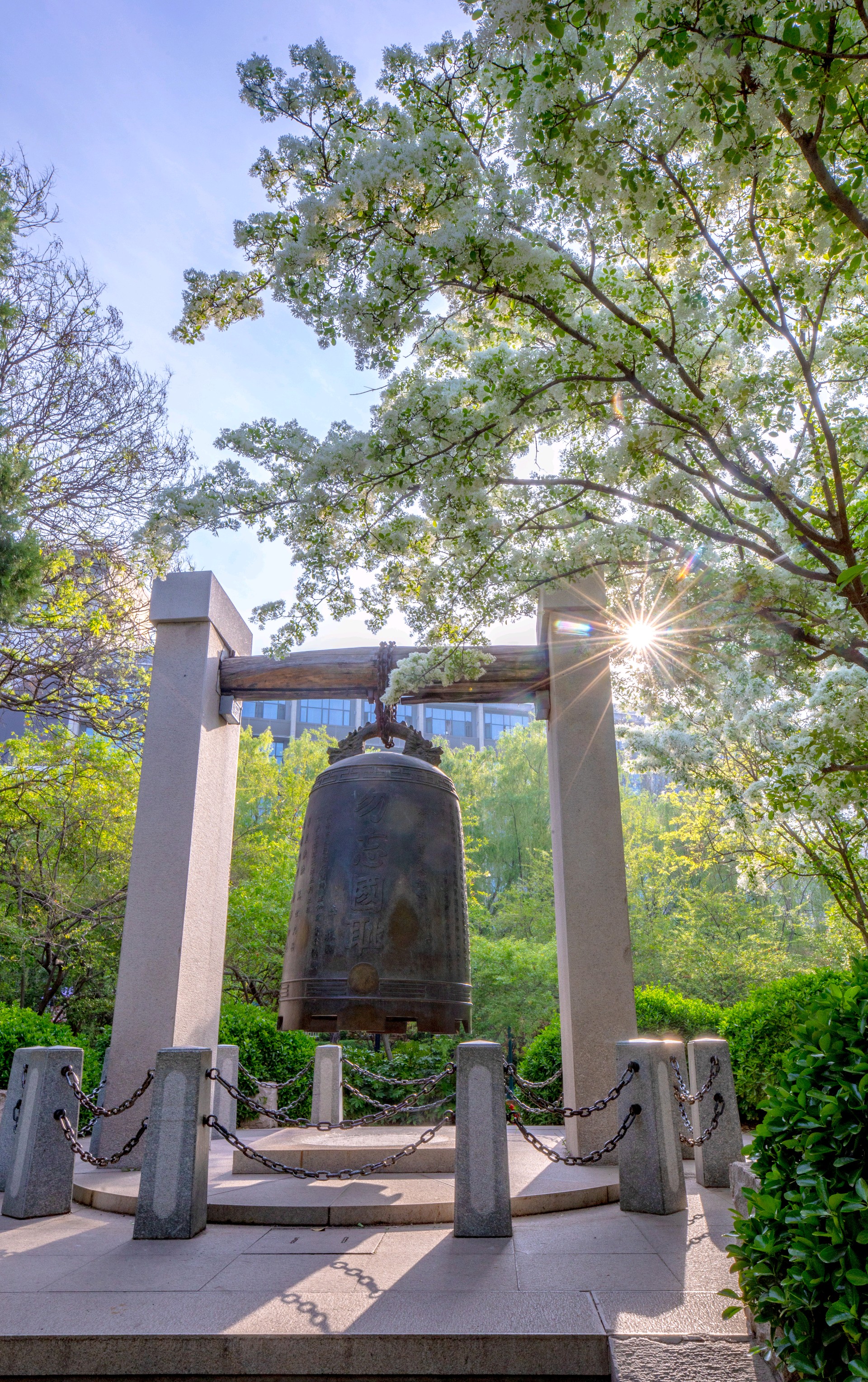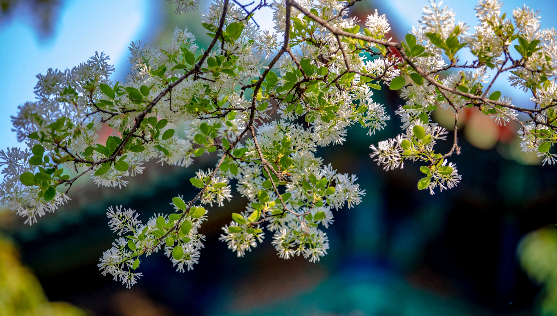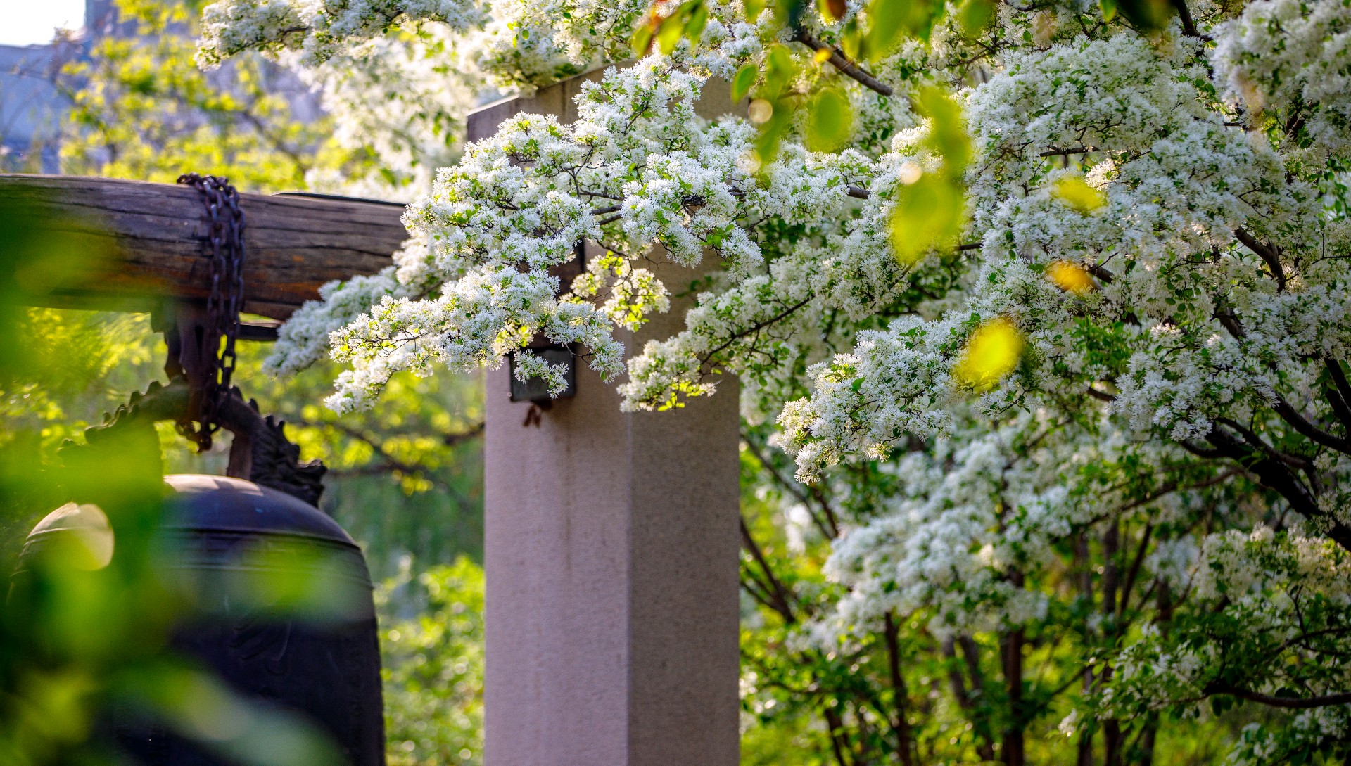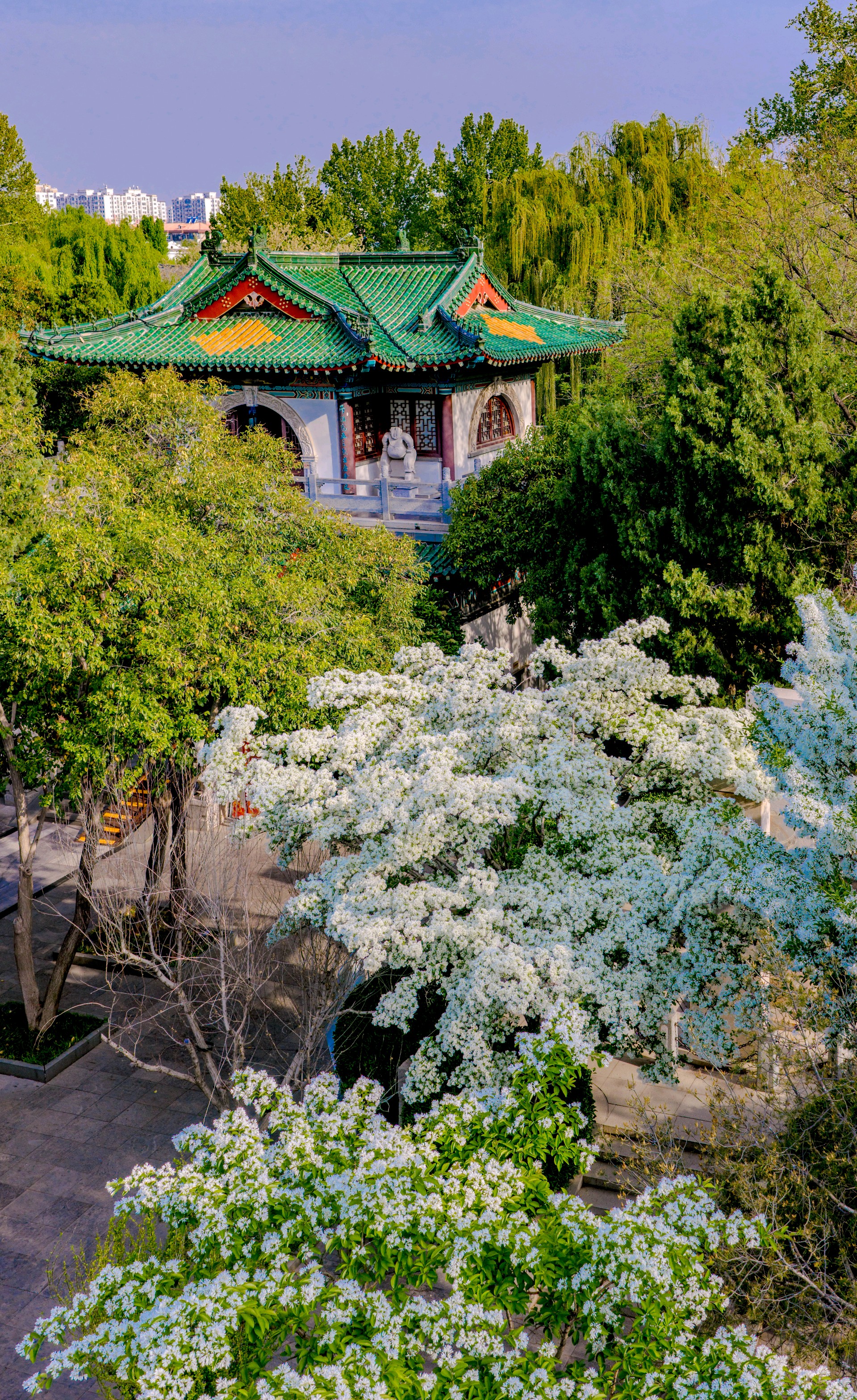 趵突泉五三惨案纪念碑旁的流苏树苍劲古朴。暮春时节繁花如雪,轻盈花瓣随风摇曳,清雅又庄重。青砖灰瓦衬着素白繁花,更添肃穆厚重。