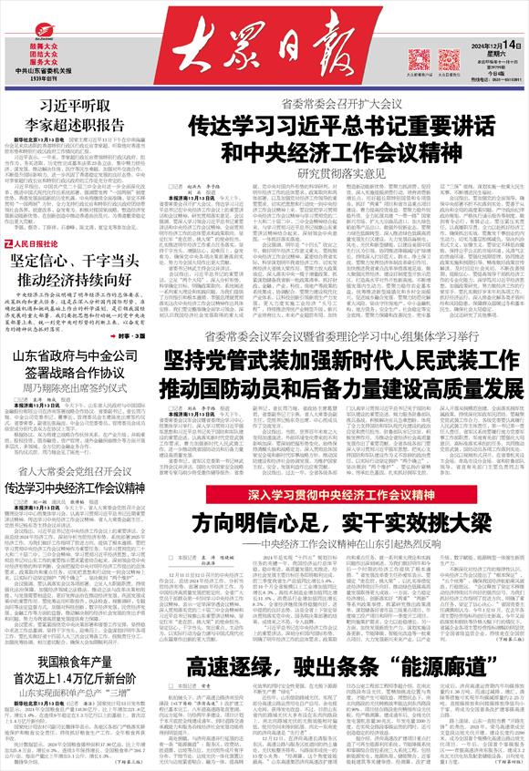 12月11日至12日召开的中央经济工作会议,总结2024年经济工作,分析当前经济形势,部署2025年经济工作,为中国经济高质量发展把舵定向。全省广大党员干部群众第一时间学习中央经济工作会议精神,表示一定学深学透会议精神,深入贯彻落实党的二十届三中全会精神和习近平总书记视察山东重要讲话精神,坚定扛牢“走在前、挑大梁”的使命担当,坚定信心、干字当头,突出重点、主动作为,以实际行动为奋力谱写中国式现代化山东篇章作出新的更大贡献。