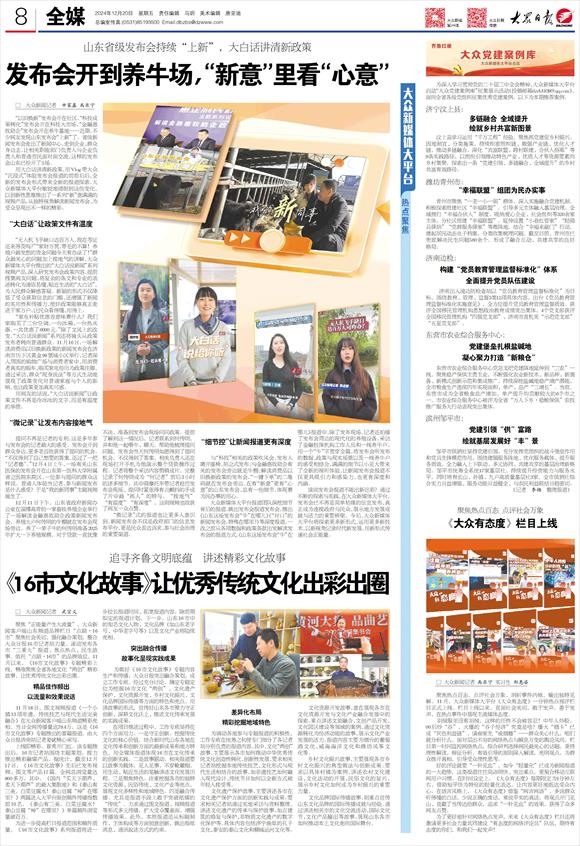 故事化呈现实践成果 为做好《16市文化故事》专题内容生产和传播,大众日报突出融合策划,成立工作专班。经过充分讨论,确定专题定位为挖掘16市文化“两创”、文化遗产保护、文化资源开发、乡村文化振兴、文化品牌国际传播等方面的特色和亮点。用讲故事的形式,宣传好山东各市聚力守正创新、深耕文化沃土、推进文化传承发展的实践成果。