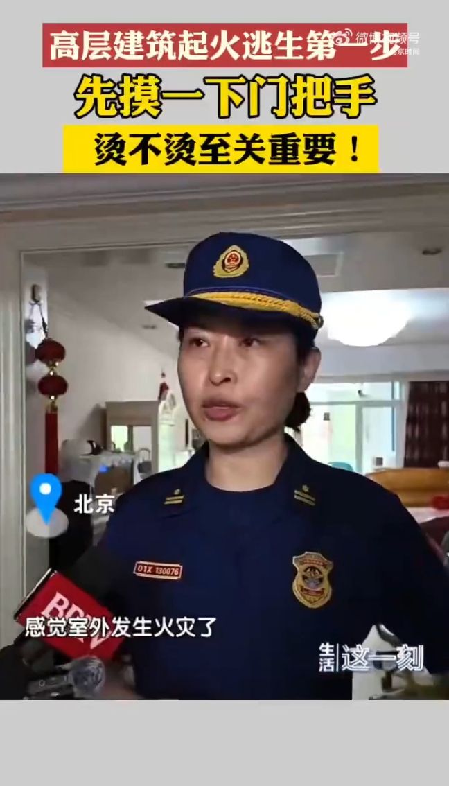 遇到高层起火,逃生第一步立刻这样做@北京时间 2025-11-27如果高层建筑发生火灾,极易出现慌乱,四处逃散现象造成人员伤亡,一旦高层起火,应该如何正确逃生呢?摸一下门把手烫不烫至关重要!如果门把手烫,说明火灾离的很近,要在家里等待救援;如果门把手不烫,门外没有烟气,说明所处位置在着火层以下,要立即下楼转移到安全地带。