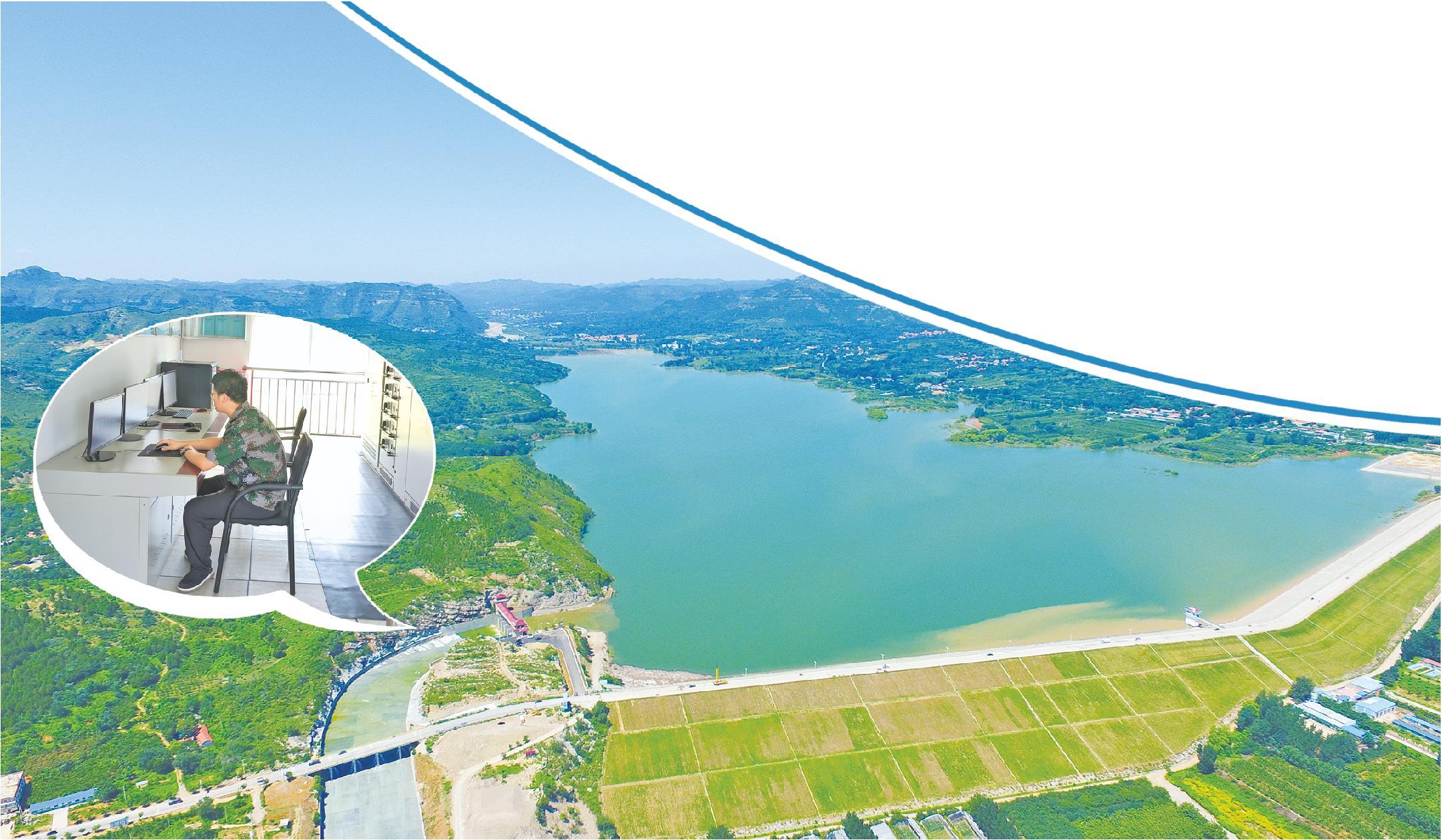 大图:黑虎山水库鸟瞰图。小图:黑虎山水库溢洪闸中控室内,工作人员监测水库重点区域。(□记者王嘉一都镇强通讯员戴文婧报道)