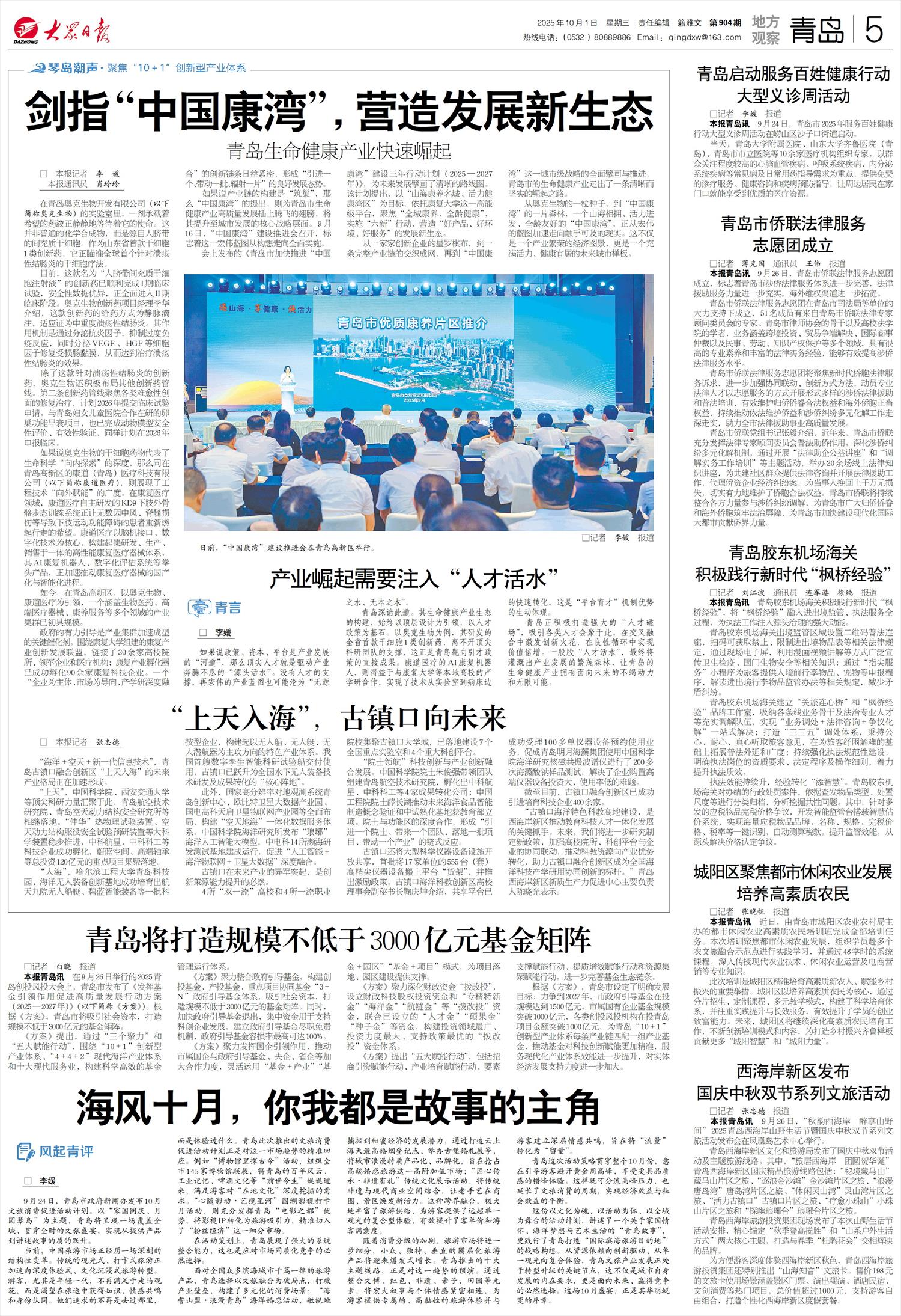 本报青岛讯 在9月26日举行的2025青岛创投风投大会上,青岛市发布了《发挥基金引领作用促进高质量发展行动方案(2025—2027年)》(以下简称《方案》)。根据《方案》,青岛市将吸引社会资本,打造规模不低于3000亿元的基金矩阵。