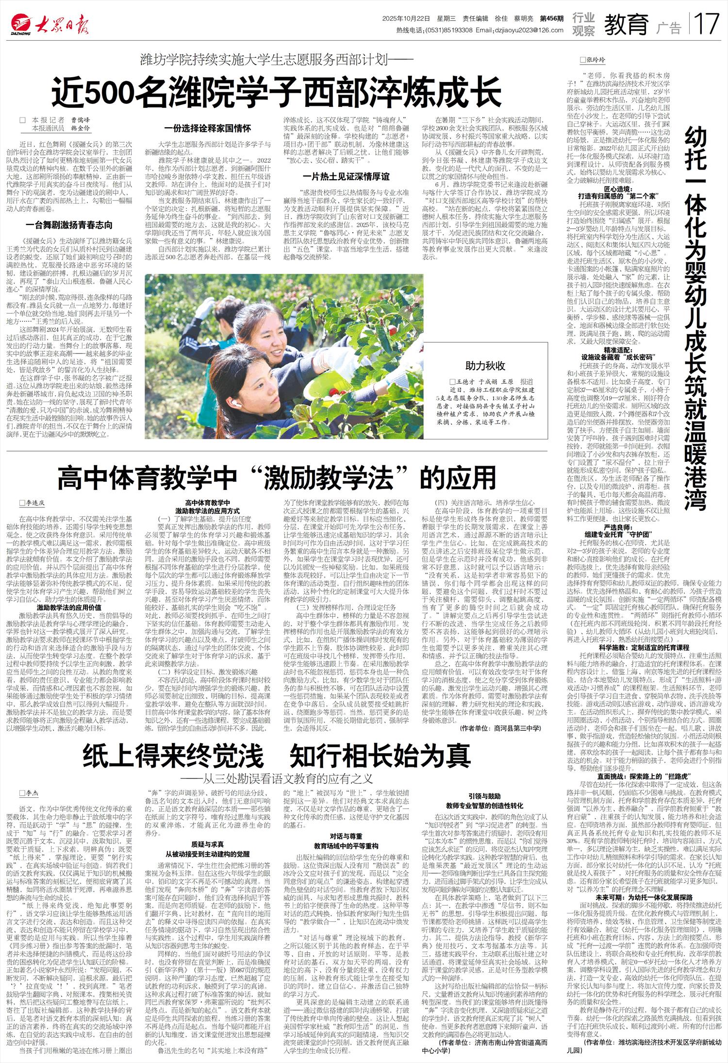 “感谢贵校师生以热情服务与专业水准赢得当地干部群众、学生家长的一致好评,为支教活动顺利开展提供坚实保障。”近日,潍坊学院收到了山东省对口支援新疆工作指挥部发来的感谢信。2025年,该校马克思主义学院“鲁喀同心·育见未来”志愿支教团队依托思想政治教育专业优势,创新推出“五色”课堂,丰富当地学生生活,搭建起鲁喀交流桥梁。