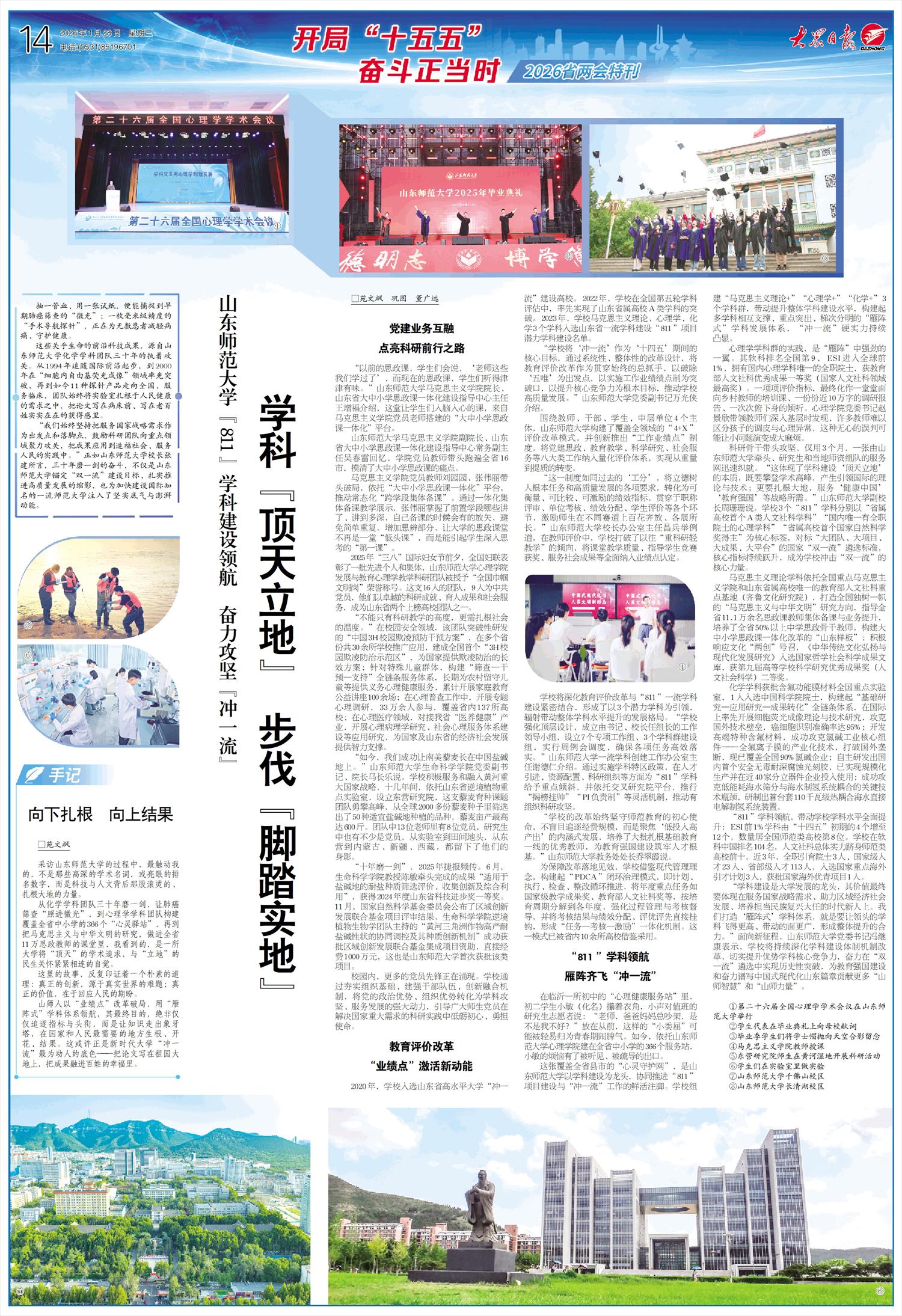 科研骨干带头攻坚,仅用3个月,一张由山东师范大学牵头、研究生和当地师资组队的服务网迅速织就。“这体现了学科建设‘顶天立地’的本质,既要攀登学术高峰,产生引领国际的理论与技术;更要扎根大地,服务‘健康中国’‘教育强国’等战略所需。”山东师范大学副校长周珊珊说。学校3个“811”学科分别以“省属高校首个A类人文社科学科”“国内唯一有全职院士的心理学科”“省属高校首个国家自然科学奖得主”为核心标签,对标“大团队、大项目、大成果、大平台”的国家“双一流”遴选标准,核心指标持续跃升,成为学校冲击“双一流”的核心力量。
