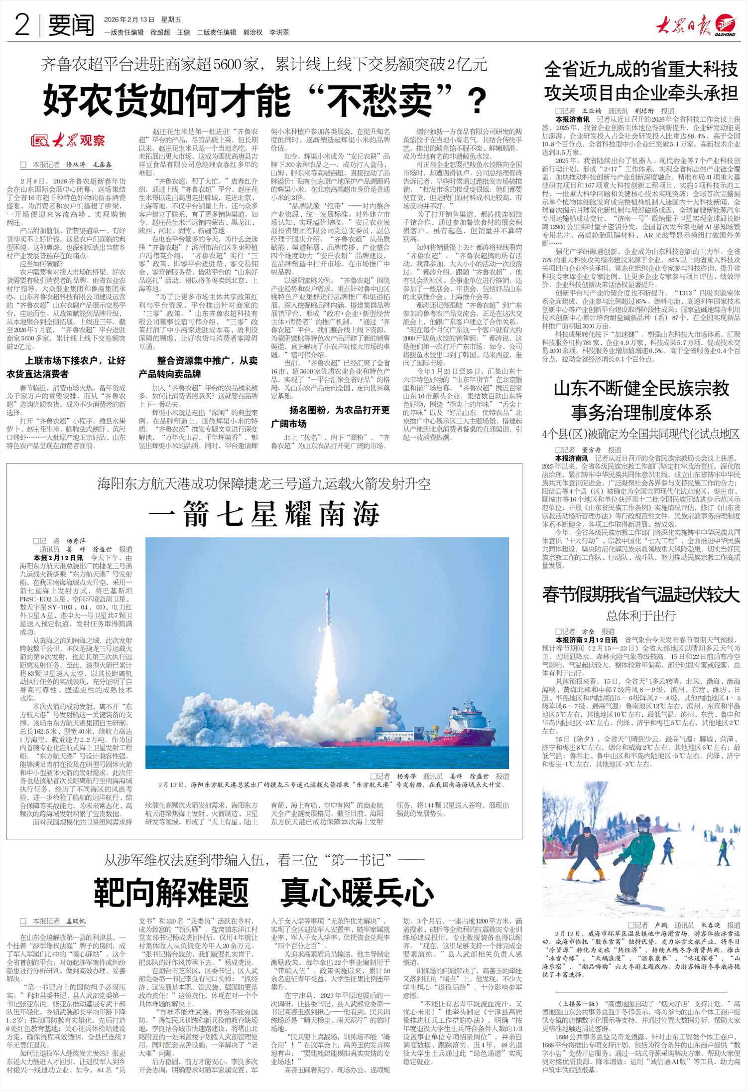 农户需要有对接大市场的桥梁,好农货需要有吸引消费者的品牌。由省农业农村厅指导,大众报业集团和鲁商集团承办,山东齐鲁农超科技有限公司建设运营的“齐鲁农超”山东农副产品展示交易平台,应运而生。从政策赋能到品牌升级,从本地聚合到全国拓展,上线近三年,截至2026年1月底,“齐鲁农超”平台进驻商家5600多家,累计线上线下交易额突破2亿元。