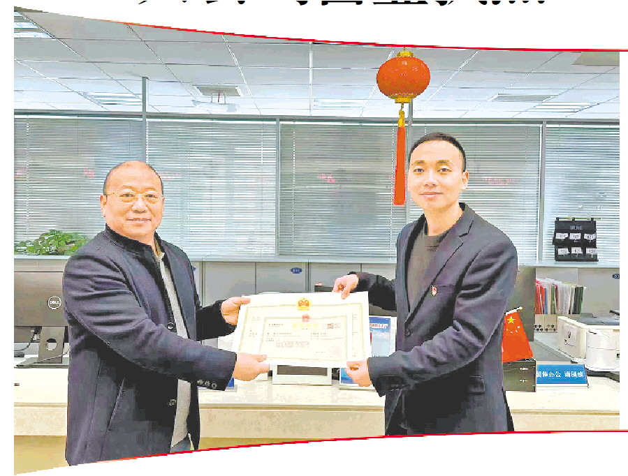 2月24日,青岛元渔智能科技有限公司负责人高一军(左)领取OPC营业执照。