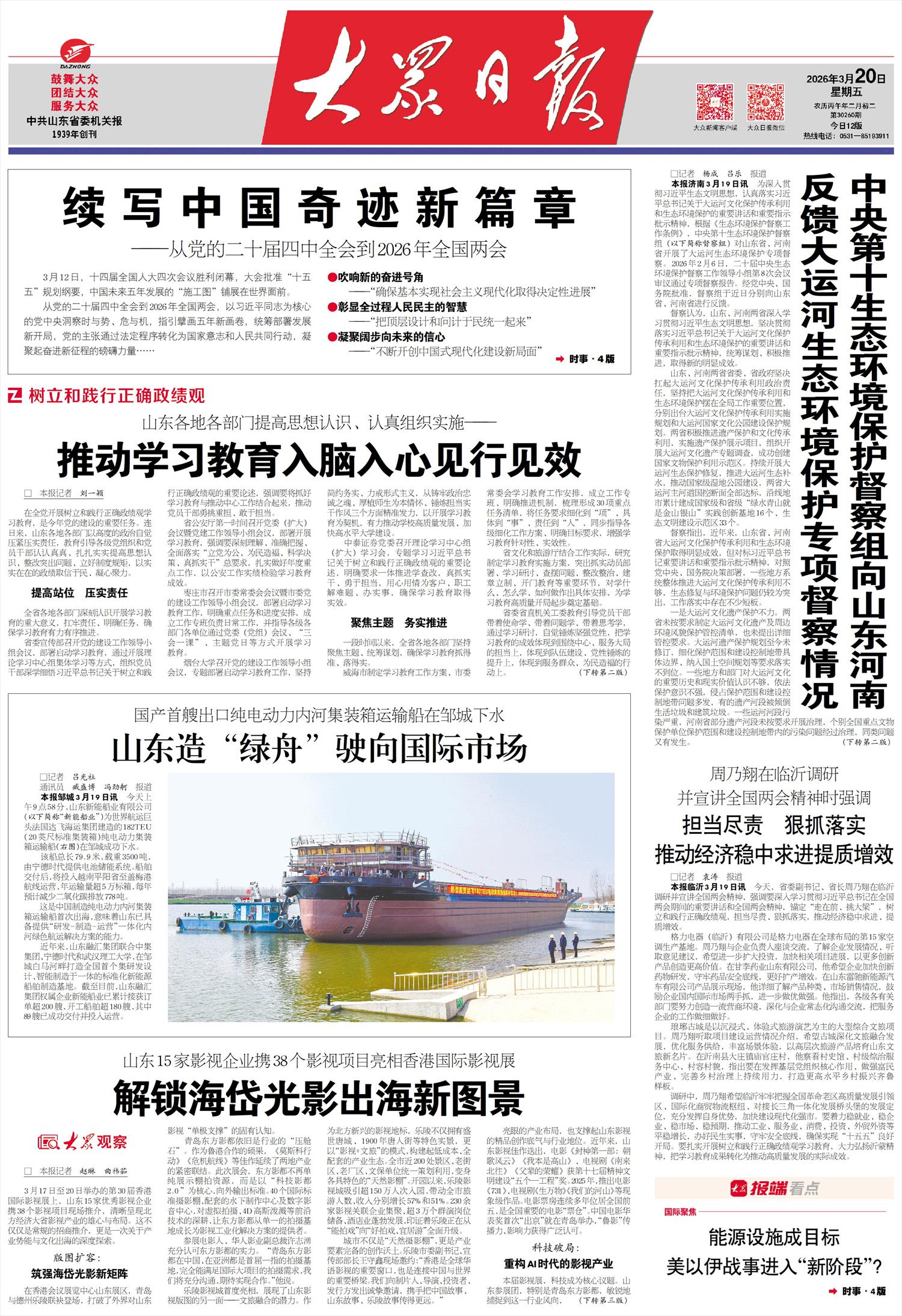 本报临沂3月19日讯 今天,省委副书记、省长周乃翔在临沂调研并宣讲全国两会精神,强调要深入学习贯彻习近平总书记在全国两会期间的重要讲话和全国两会精神,锚定“走在前、挑大梁”,树立和践行正确政绩观,担当尽责、狠抓落实,推动经济稳中求进、提质增效。