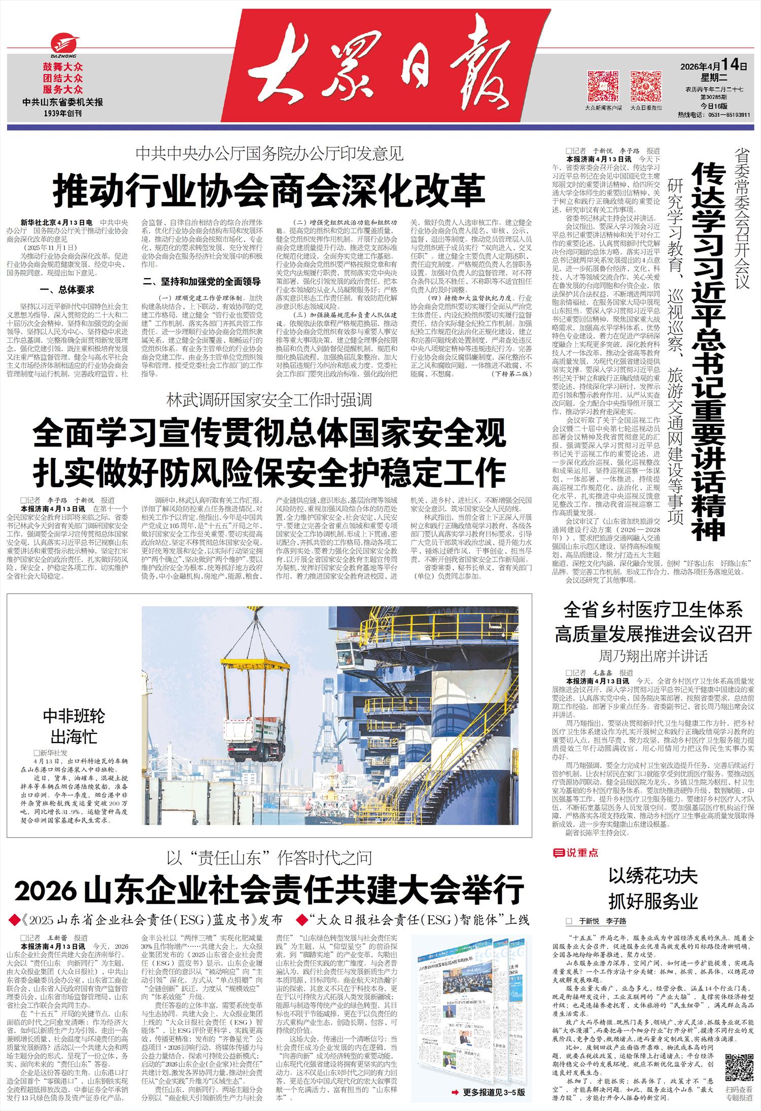 本报济南4月13日讯 今天,全省乡村医疗卫生体系高质量发展推进会议召开,深入学习贯彻习近平总书记关于健康中国建设的重要论述,认真落实党中央、国务院决策部署,按照省委要求,总结前期工作经验,部署下步重点任务。省委副书记、省长周乃翔出席会议并讲话。