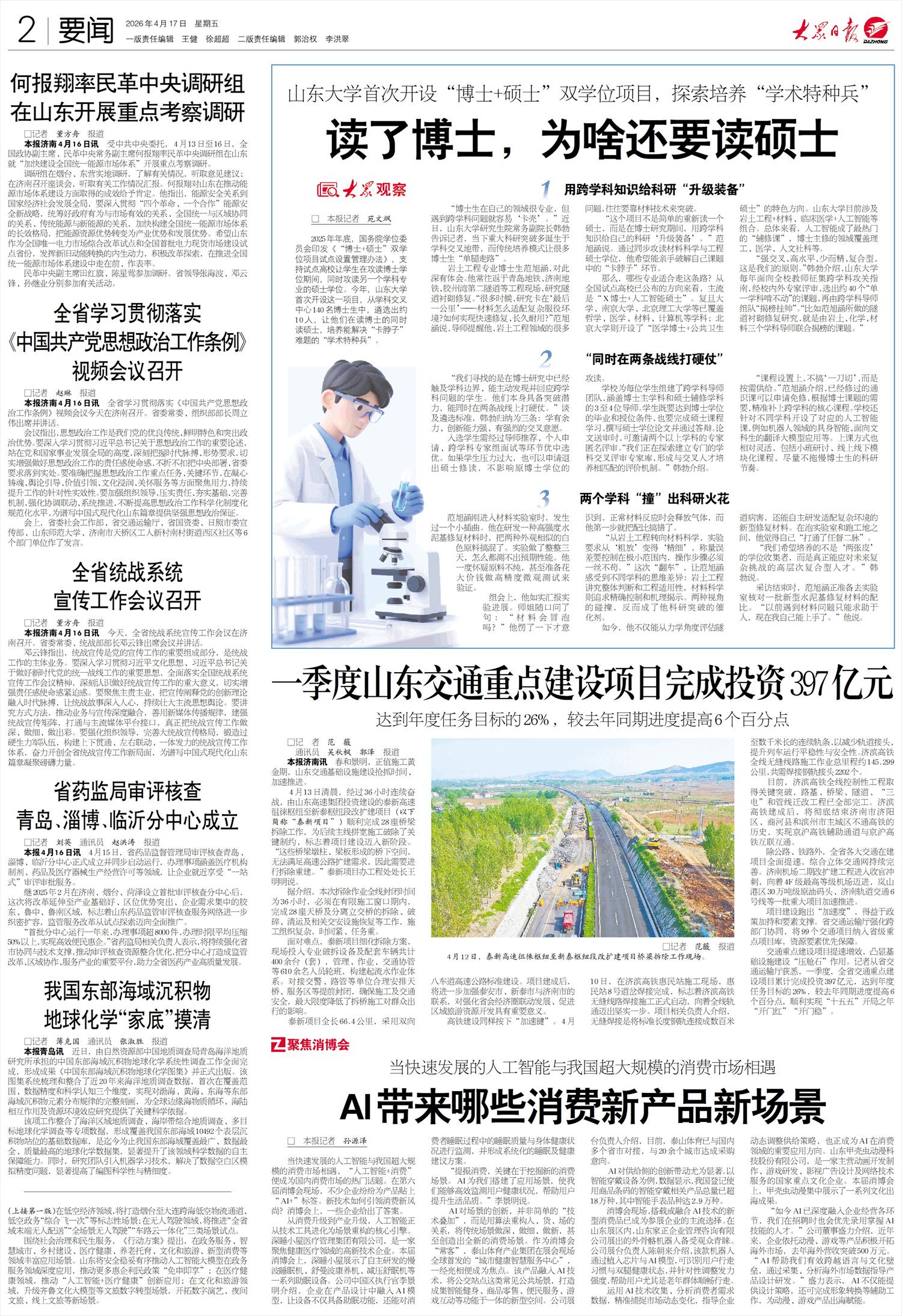 2025年年底,国务院学位委员会印发《“博士+硕士”双学位项目试点设置管理办法》,支持试点高校让学生在攻读博士学位期间,同时攻读另一个学科专业的硕士学位。今年,山东大学首次开设这一项目,从学科交叉中心140名博士生中,遴选出约10人,让他们在读博士的同时读硕士,培养能解决“卡脖子”难题的“学术特种兵”。