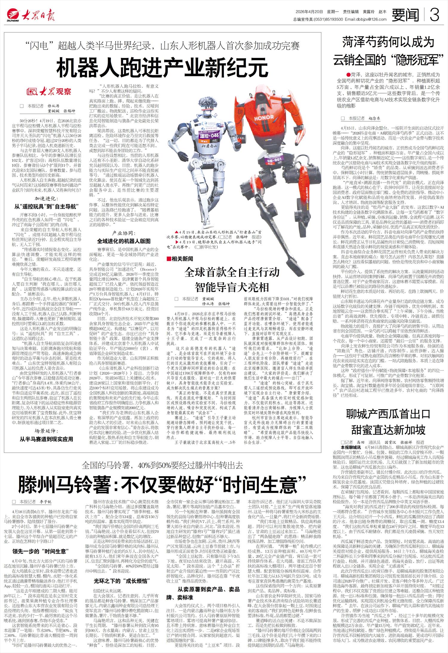 4月19日,来自山东的人形机器人“行者泰山”首次参赛,以稳健表现成功完赛。(□记者张锡坤报道)