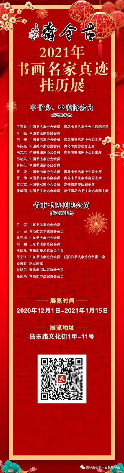 挂历,是每个家庭的新年必需品,近几年兴起的书画家手写手绘挂历,开始走入寻常百姓家。12月1日起,青岛古今斋集齐包括诸多岛城书画名家和好友20位之新年挂历作品,进行展览,集中呈现给广大观众,希望为大家在辞旧迎新之际,献上最好的作品,和最美的祝福,希望大家新年幸福安康,事事如意。