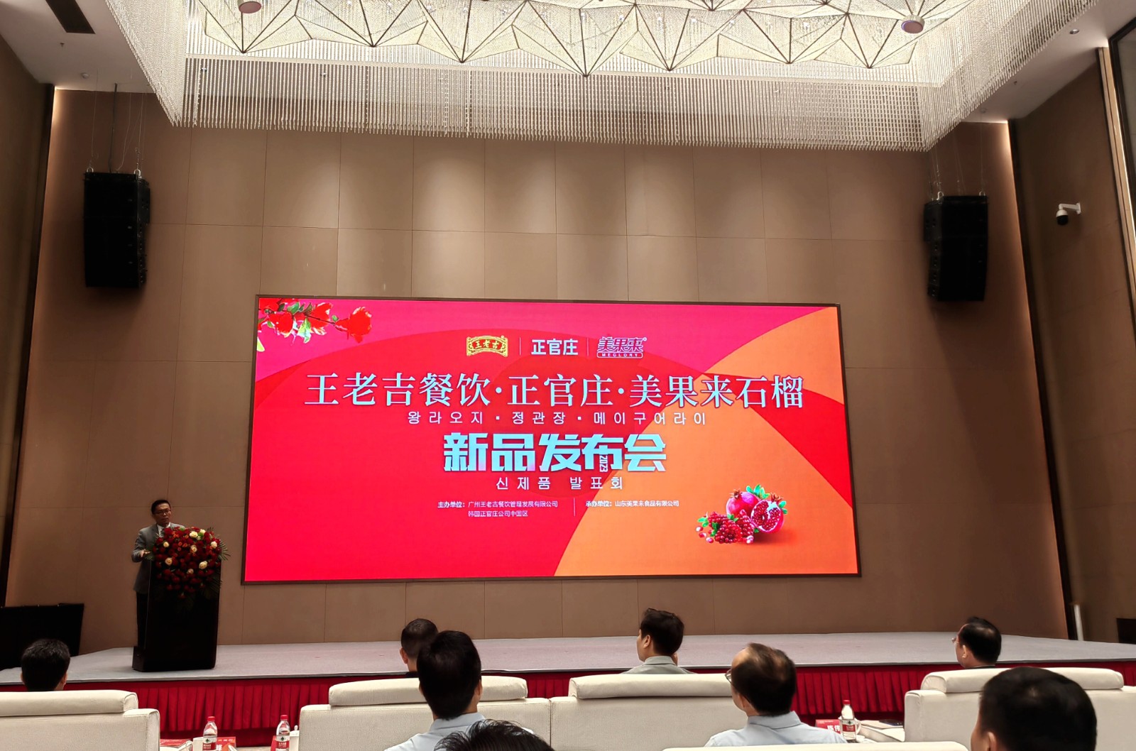 “今天发布的第一款产品:王老吉·正官庄·美果来红参石榴汁饮品,选用两千多年种植历史,北纬34.8°枣庄冠世榴园向阳山坡石榴榨取原汁,与韩国正官庄5年生人参为原料……”7月24日,两款王老吉·正官庄·美果来品牌联名石榴新品对外正式发布,同时启动了中国中医科学院关于“石榴红参”科研项目。