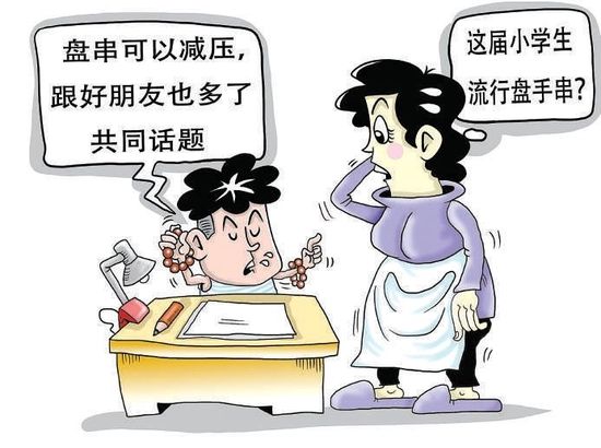 第三,适时、适宜才是“小癖好”免遭嫌弃的关键。类似“盘手串”的“小癖好”虽然无伤大雅,但是,上课盘、写作业盘、睡觉也盘就很难得到家长、老师的支持。掌握好了“什么时间玩儿”“怎么玩儿”,家长和老师是不会反对中小学生的这些“小癖好”的。说到底,这就是时间管理和规则意识的问题。在中小学阶段,我们经常会在游戏中培养学生的规则意识,学习时间管理。所以,面对“盘手串”盛行的局面,家长和老师可以通过民主、平等的方式,比如召开主题班会等形式,让学生展示“盘”的花式,讨论“盘”的规则,约定“盘”的时间,这样适时、适宜地“玩儿”,才不至于影响成长与学习。
