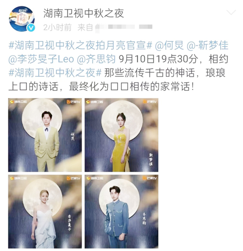 湖南卫视中秋之夜嘉宾阵容官宣