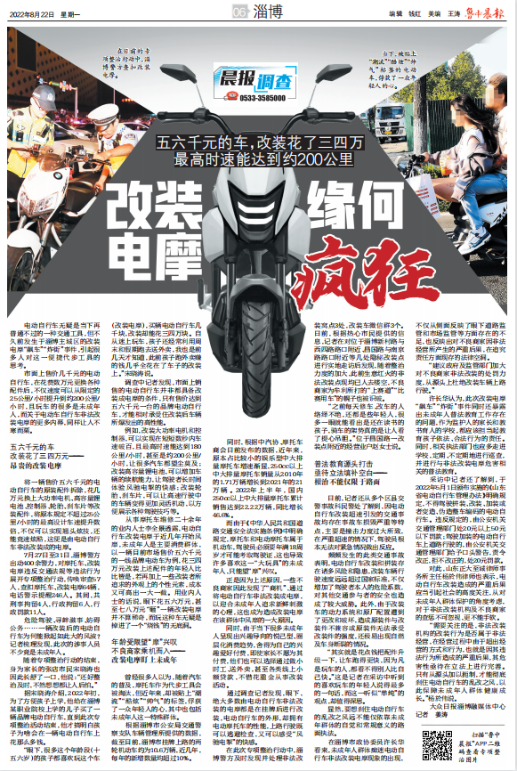 电动自行车无疑是当下再普通不过的一种交通工具,但不久前发生于淄博主城区的改装电摩“飙车”“炸街”事件,引起很多人对这一便捷代步工具的思考。
