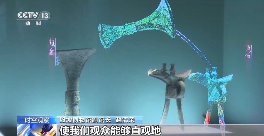殷墟博物馆副馆长 赵清荣:使用了透明的LED屏和数字虚拟影像,与展柜中的文物一一地对应,使我们观众能够直观地了解到青铜器的用途,真正使我们的文物活化起来。