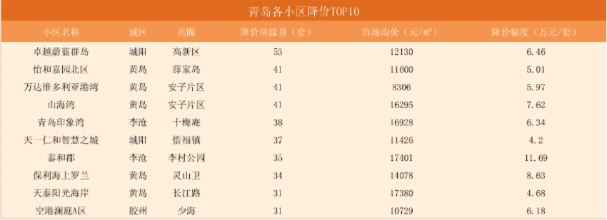 降价榜单中,卓越蔚蓝群岛、怡和嘉园北区、万达维多利亚港湾位列前三。从降价幅度来看,第9周青岛各小区降价幅度集中在4.2万元/套~11.69万元/套。