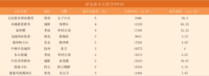 涨价榜单中,万达维多利亚港湾、卓越蔚蓝群岛、泰和郡位居前三名。从涨价幅度来看,第9周青岛各小区涨价幅度集中在2.33万元/套~65.25万元/套。
