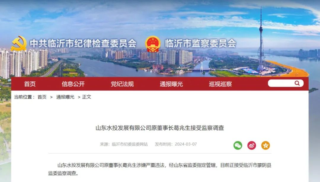 山东水投发展有限公司原董事长葛兆生涉嫌严重违法,经山东省监委指定管辖,目前正接受临沂市蒙阴县监委监察调查。(来源:临沂市纪委监委网站)