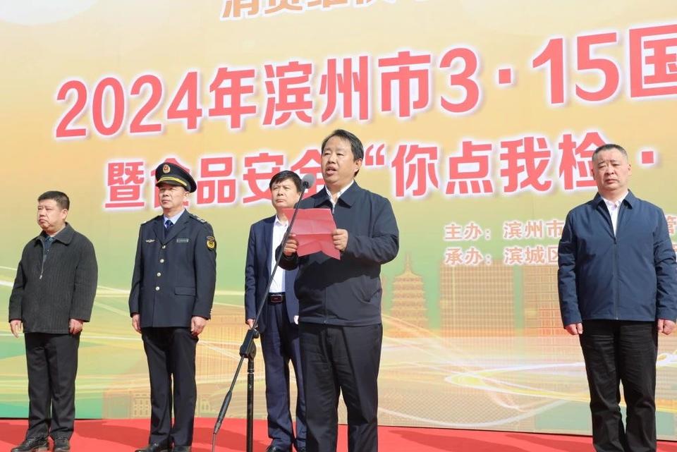 3月12日,2024年滨州市3·15国际消费者权益日广场宣传暨食品安全“你点我检·服务惠民生”活动启动仪式在滨城区举行,副市长杜玉杰出席活动并讲话。
