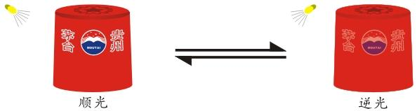 手持茅台酒瓶直接肉眼观察防伪帽套:在顺光方向,茅台logo图文为明亮的珠光增强色。逆光方向,该图文色彩明显变淡。